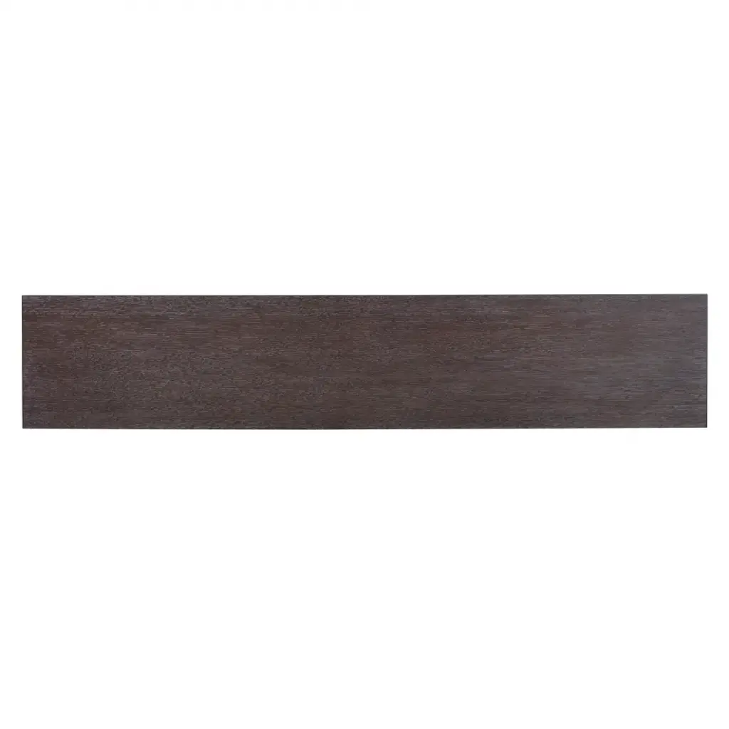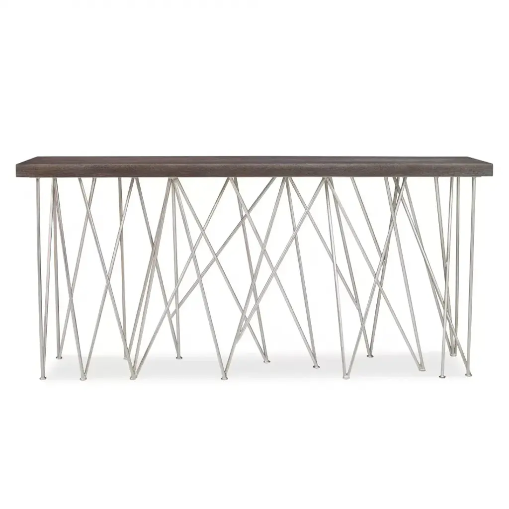 A multitude of random silver leafed rods create the base for this console table. Straight grain Oak top.