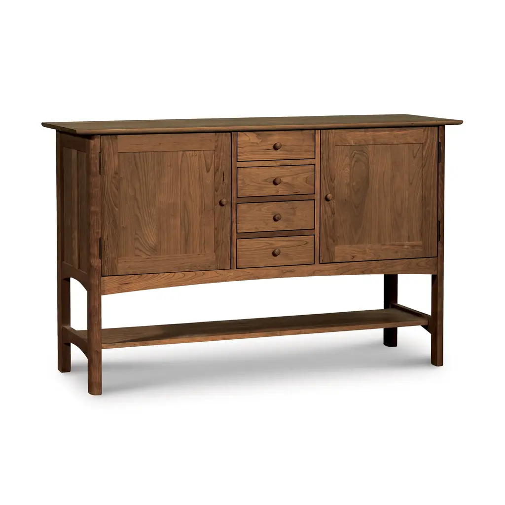 This Heartwood Shaker Huntboard is handcrafted in Vermont using premium solid wood. Designed to last a lifetime. Features four center drawers with two side doors and a bottom shelf. Behind each door, there is a 1/2 shelf for more storage convenience. Lots of storage space for your contemporary kitchen or dining room. Maple, cherry or walnut hardwoods with natural, eco-friendly oil finish.Base price represents huntboard in natural cherry with natural walnut pulls Shown in natural cherry with natural walnut pulls and wood panel doorsMatching furniture available in our Heartwood Shaker Furniture Collection