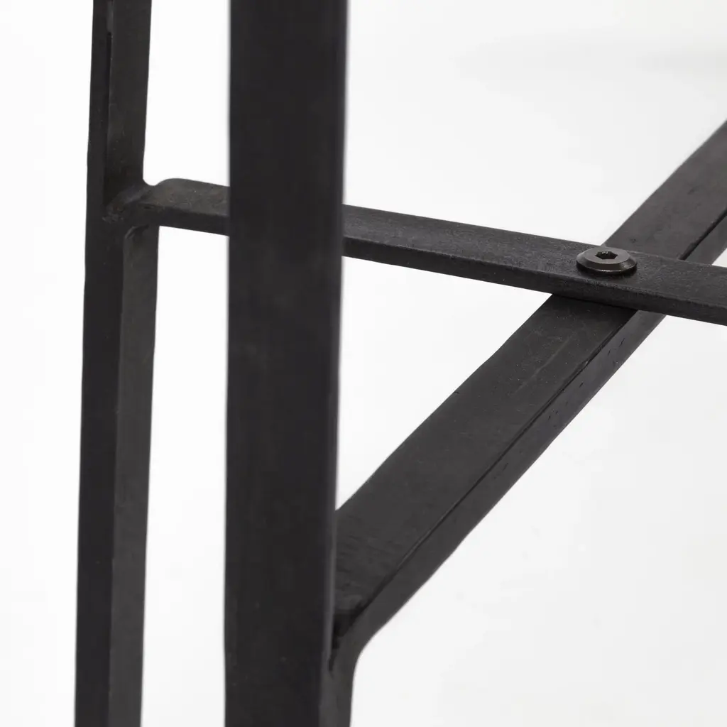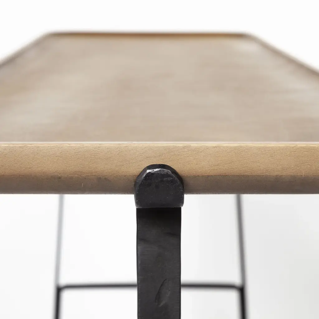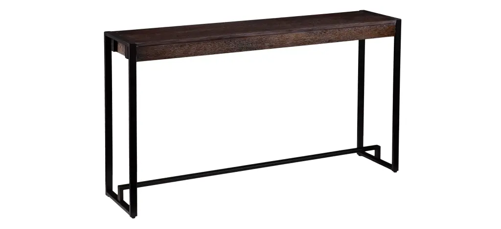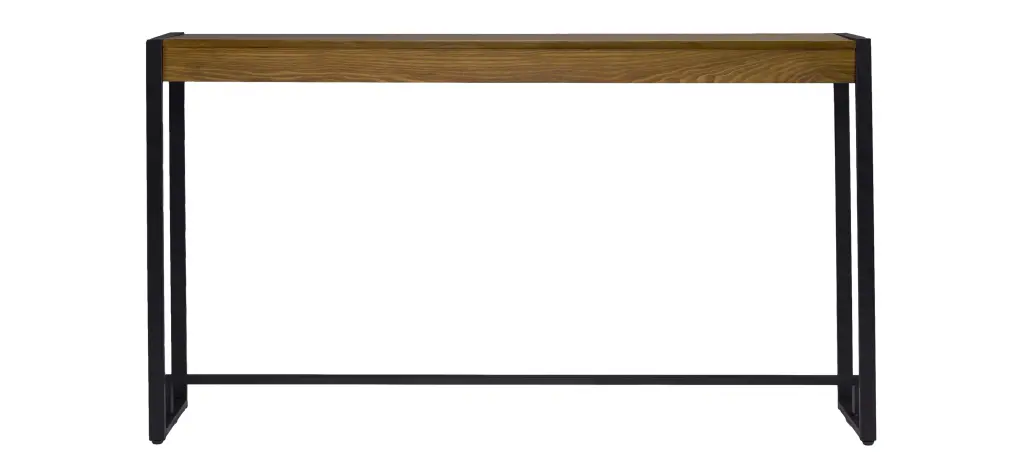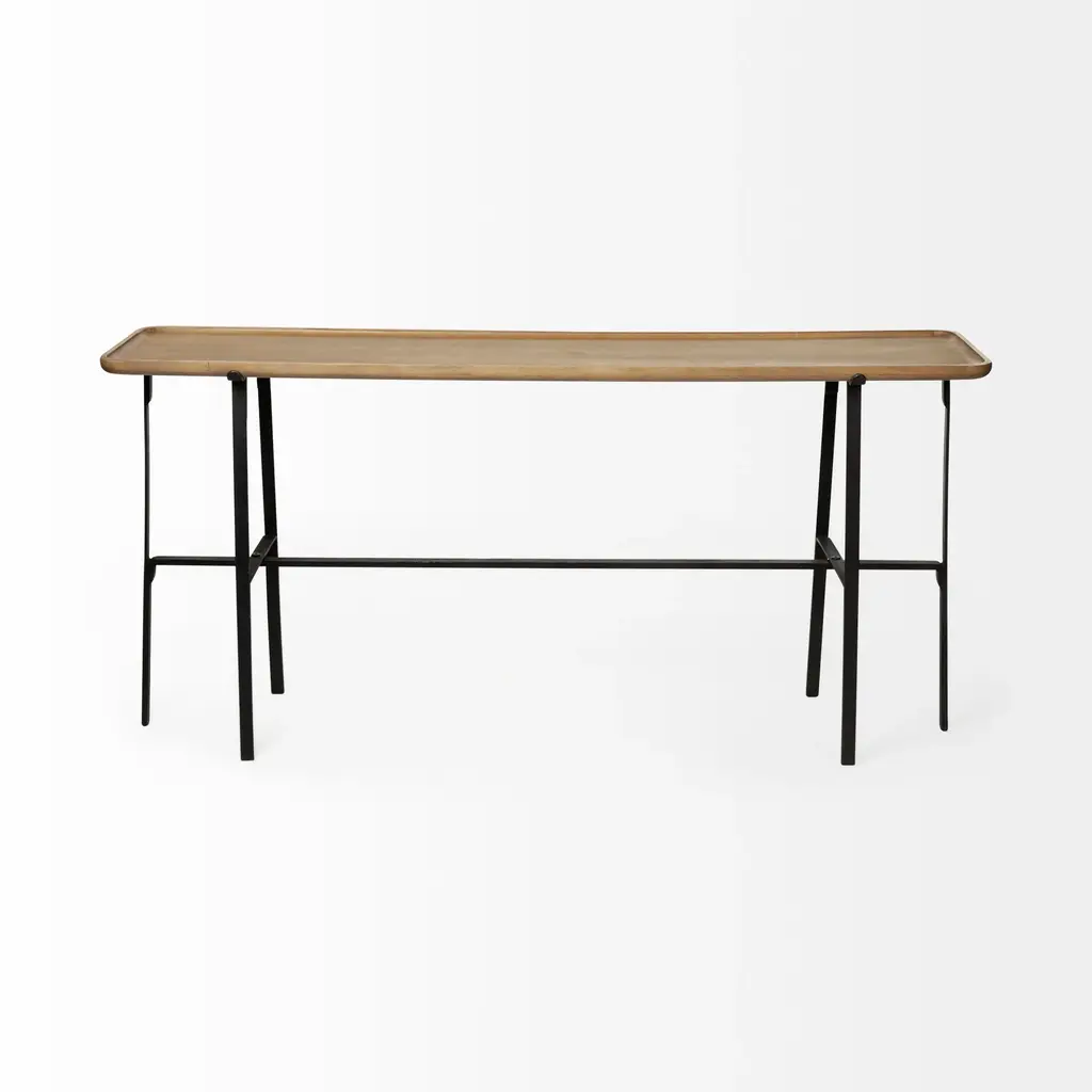 The Helios II is a uniquely designed, rectangular console table that looks great in any modern living room. It features a smoothly polished, medium brown-toned, raised edge top braced by a four-legged, solid iron base with cross bracing. The base, finished in a stunning matte-black polish, not only complements the top and adds to the table's visuals but also stabilizes it to perfection.