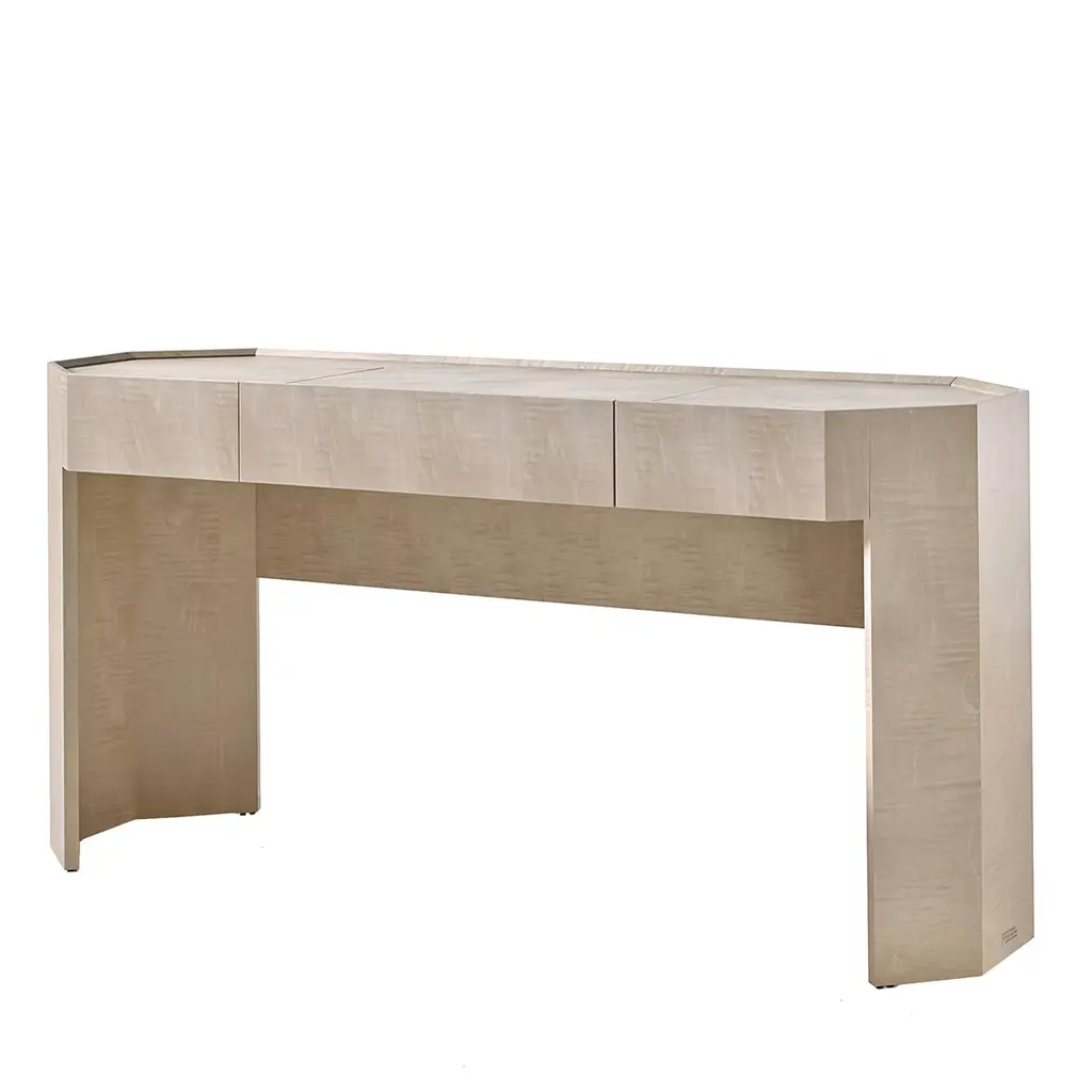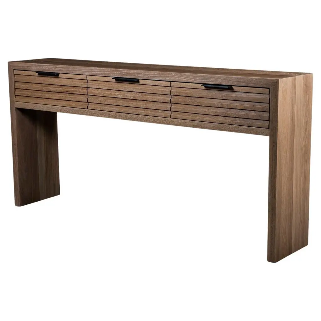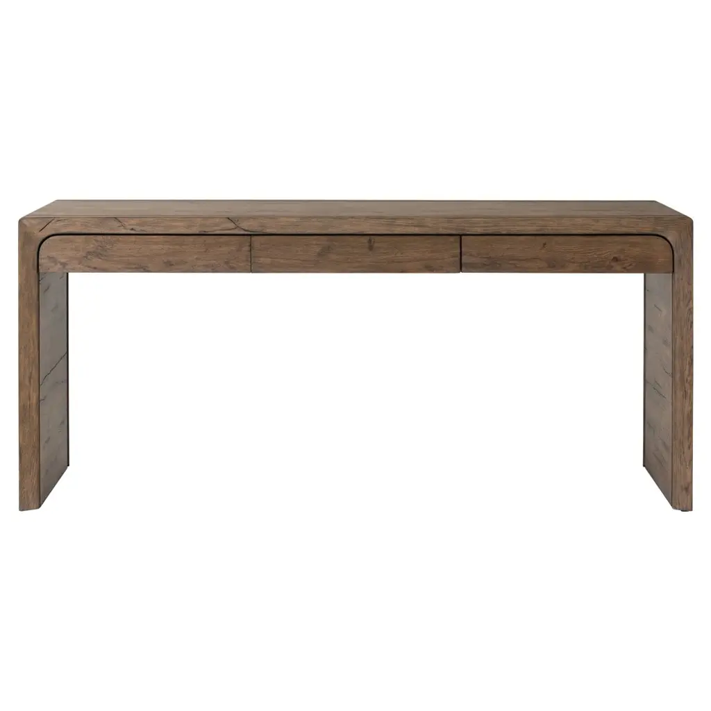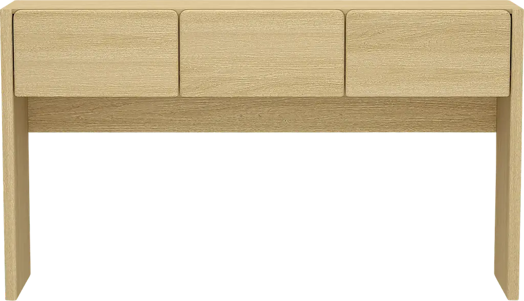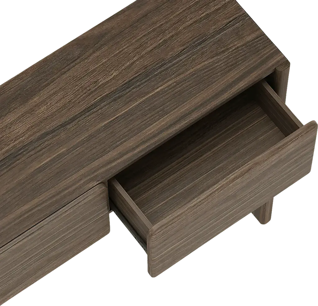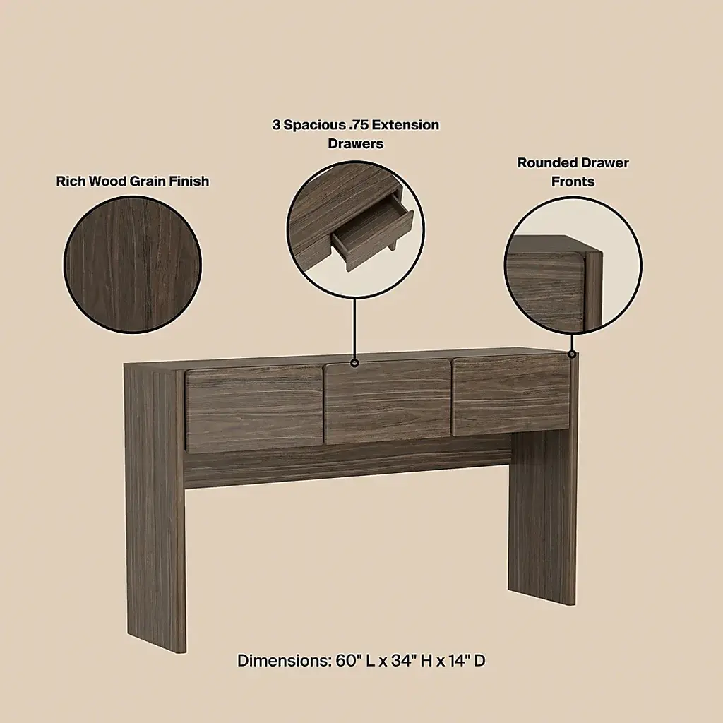 The Herosunny brown console table blends clean lines with soft edges for a look that's both minimal and inviting. The subtle wood grain texture adds warmth and depth, while the seamless drawer fronts lend a clean, sculptural presence. Designed with versatility in mind, each piece offers functional storage that fits effortlessly in entryways, bedrooms, or living spaces. Customer assembly is required.