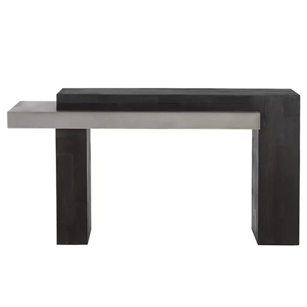 The Herriot Console Table from Sunpan commands attention with its statuesque presence and right-angled boldness. Its height and color contrast make this contemporary design unforgettable, contrasting between its timber-textured bases and smooth grey concrete table surface. The glass fiber-reinforced concrete construction, sealed for protection, ensures resilience in both interior and exterior settings. Each table features a unique composition with distinctive patterns and subtle nuances, celebrating the beauty of craft while delivering solid service for years to come.