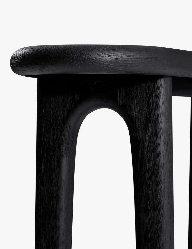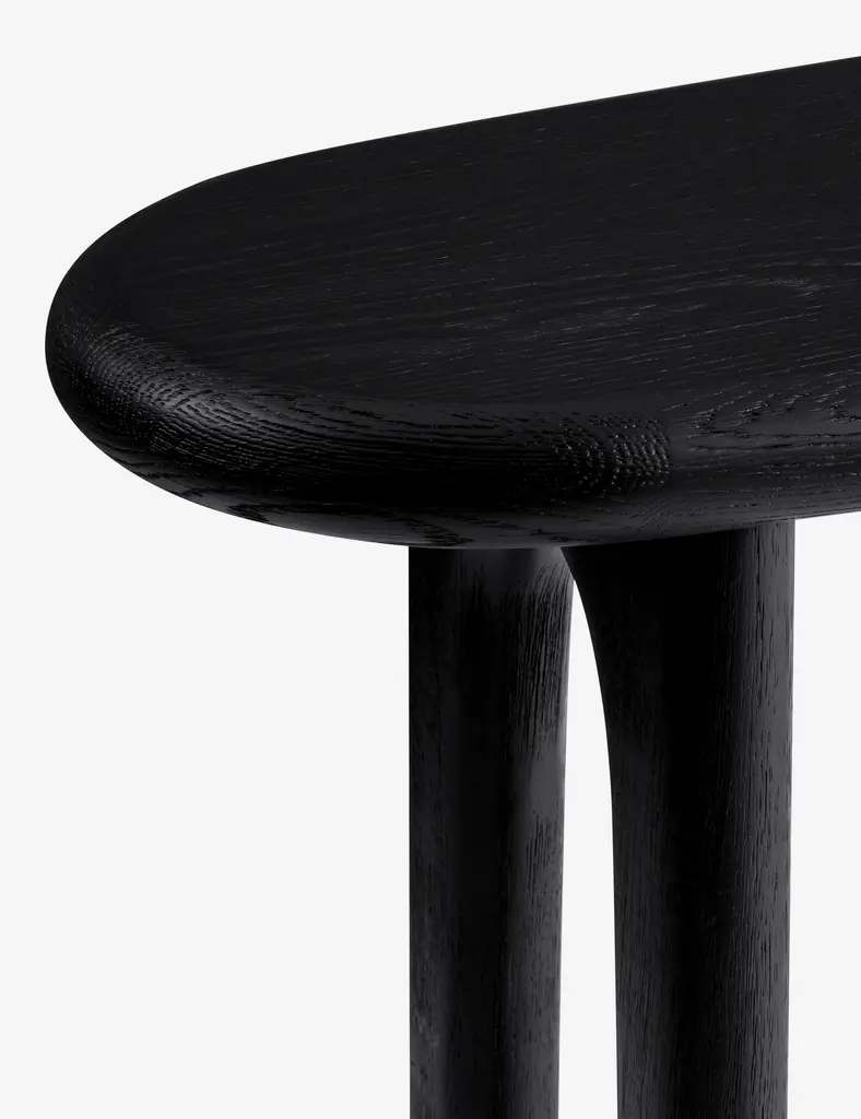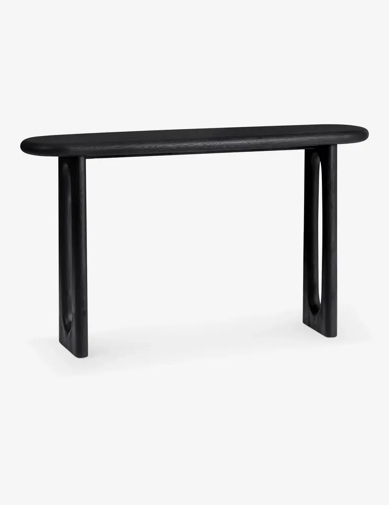 The Hesh console table pairs soft lines with the natural grain beauty of oak. Carved cutouts on the legs bring a sculptural quality to the designoffering an airy look with a sturdy bearing. Whether styled as an entryway table or living room console, this piece brings an artful edge to modern decor.
