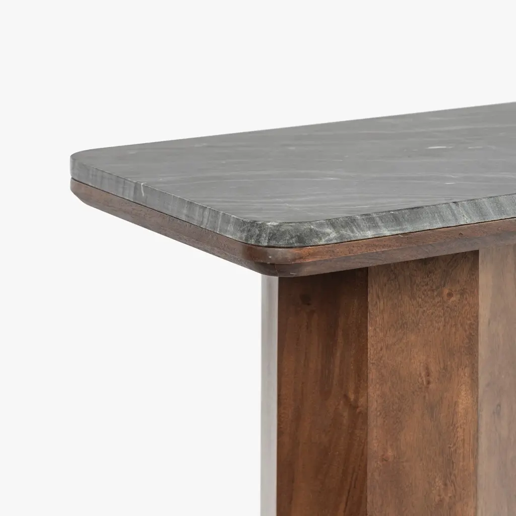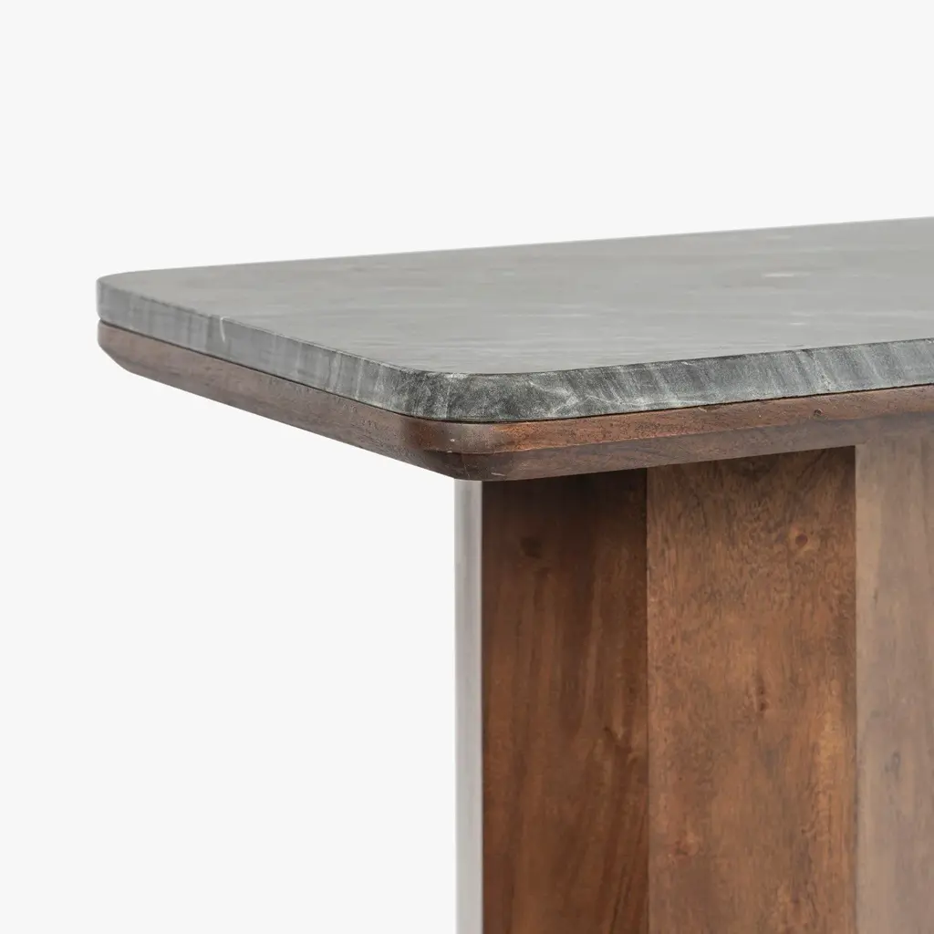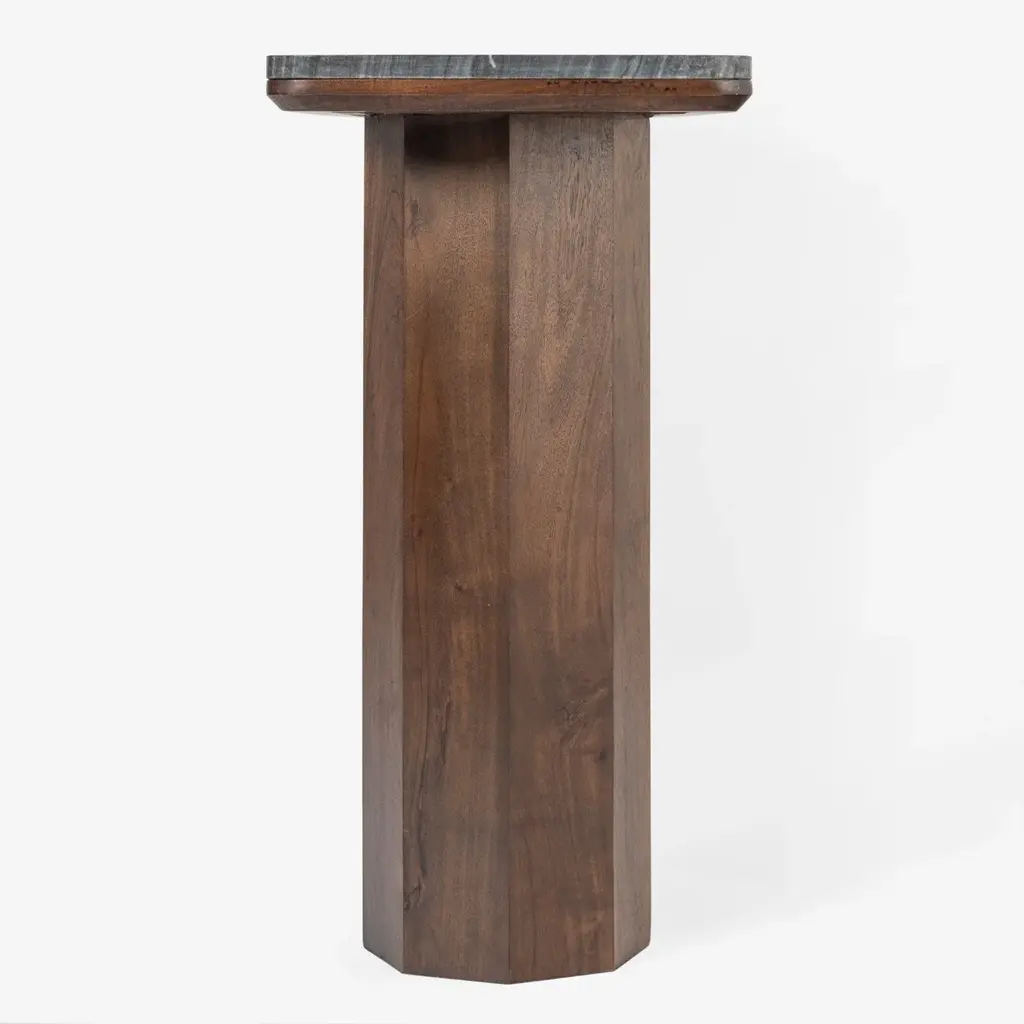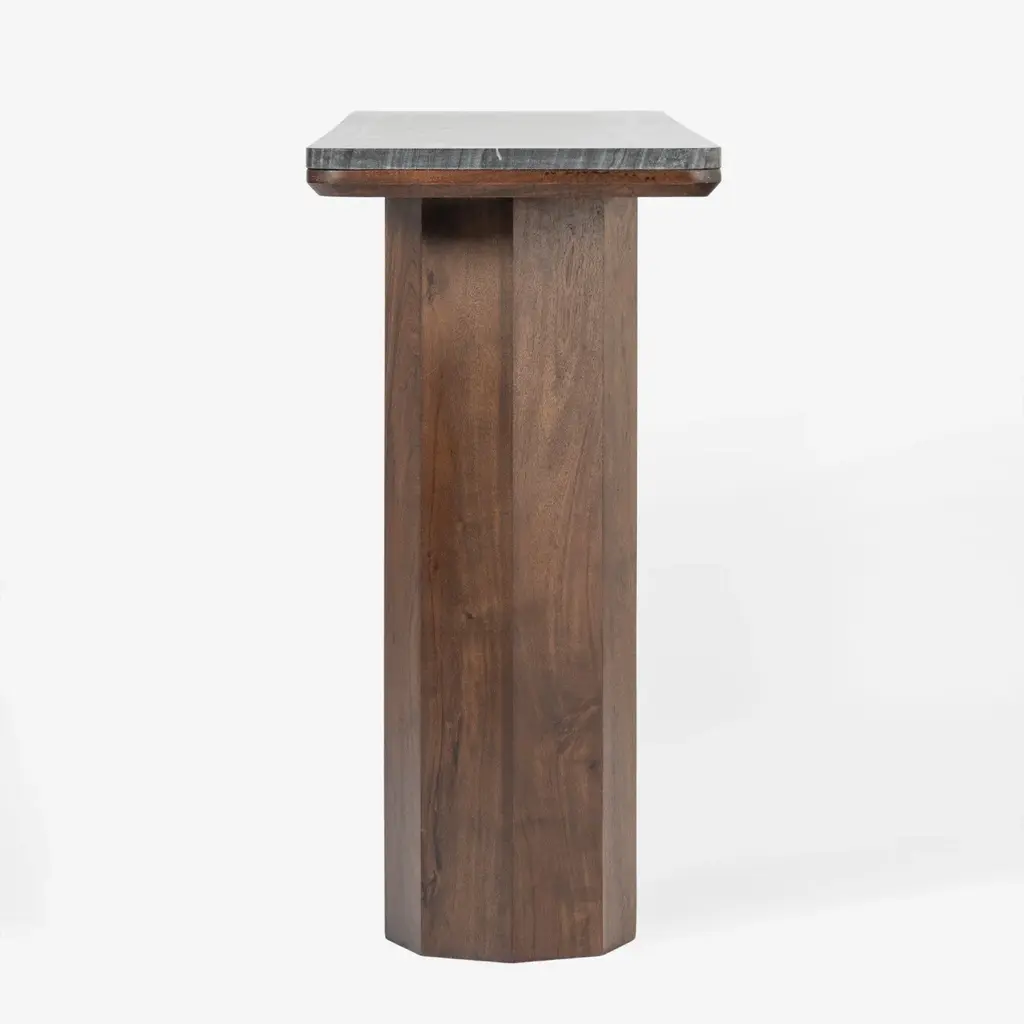 Introducing the Hex Leg Console - a masterpiece of sculptural design and natural elegance. The console features a solid acacia base with a striking hexagonal leg design, providing a captivating focal point. Topped with black polished marble, this piece exudes sophistication and modern charm. Elevate your entryway or living space with the artful geometry and timeless luxury of this piece.