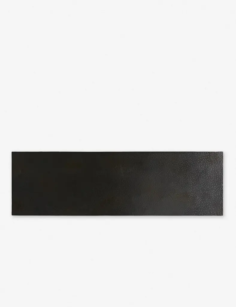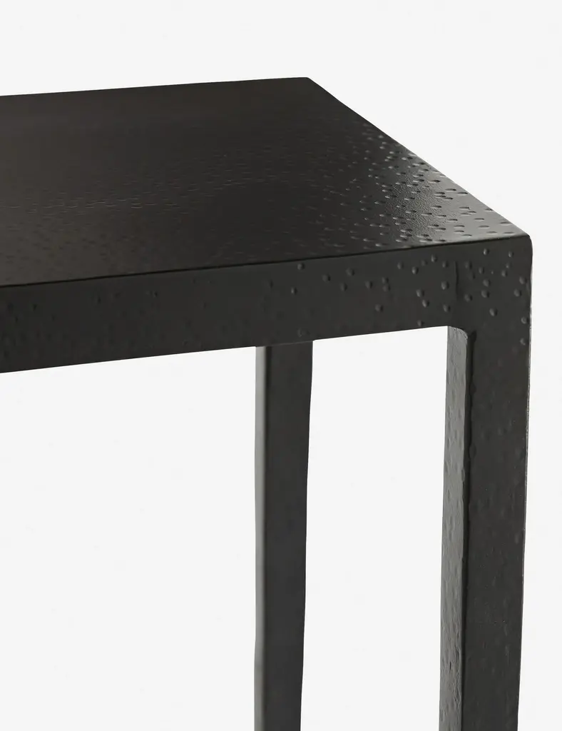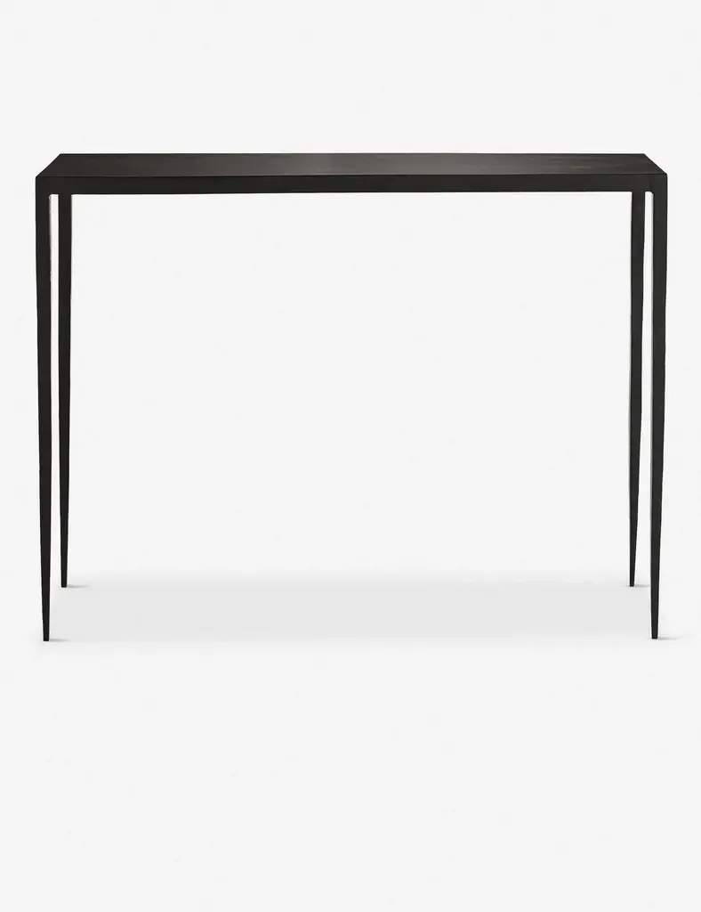 A modern rectangular console table with a full iron construction. This tall console table features tapered legs and a dimpled texture throughout for a touch of brutalist inspiration.