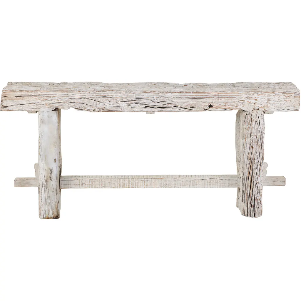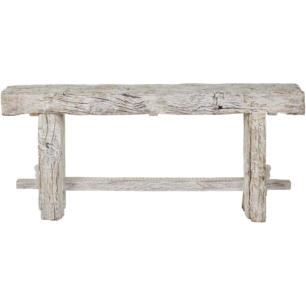 The Holland Console Table is a sustainable piece given it is made from reclaimed wood that is remarkably aged, which brings its surfaces tremendous personality, as does the trestle design with its mortise and tenon joinery. Because the whitewashed table is made from such raw wood, no two will be exactly alike. This piece is meant to be placed indoors only.