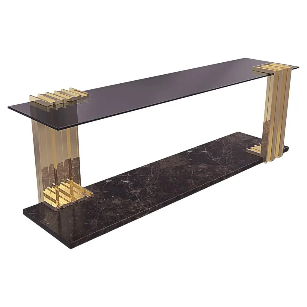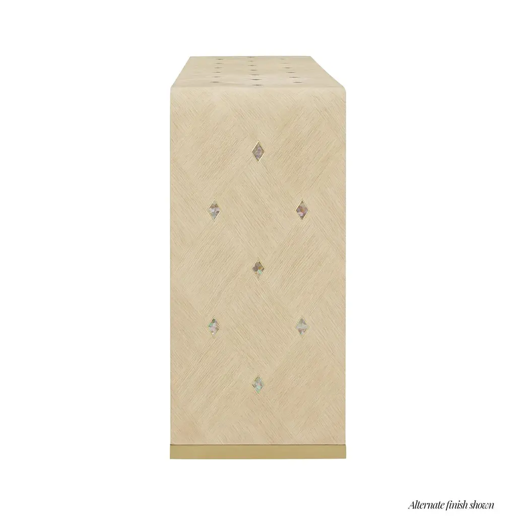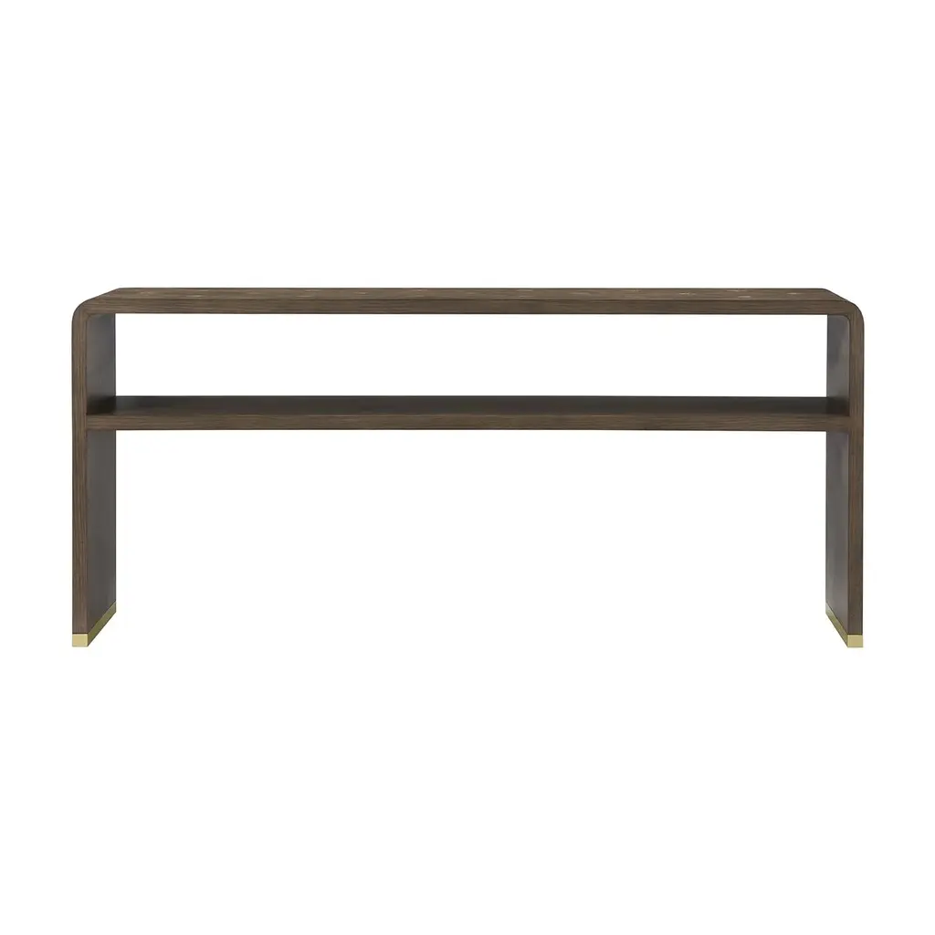 In a dark mink finish, bring sculptural elegance to refined interiors. Its waterfall-edge silhouette is accented with delicate diamond-pattern inlays across the top and sides, creating a soft sense of movement. A full-length lower shelf adds versatile display space while maintaining a clean, minimalist profile. Brass-capped feet lend a final touch of polished glamour, making this table ideal for entryways, living rooms, or gallery-like settings. Dimensions: 71.75" W x 15" D x 32" H