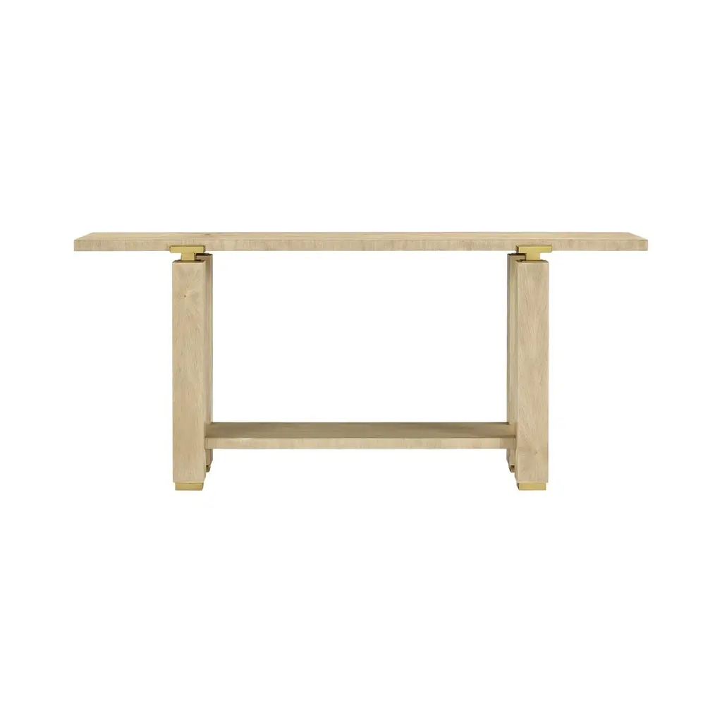 Minimalist Console in a light Martini finish exemplifies this ethos with sculptural clarity. Meticulously artisan made, its bold architectural frame features clean lines, block-style legs, and an open lower shelf for elegant display.Polished brass detailing adds a touch of tailored glamour, perfectly complementing the natural warmth of the wood. This console is ideal for entryways, behind sofas, or any space that calls for refined functionality with a statement presence.Dimensions: 72" W x 16" D x 34" H