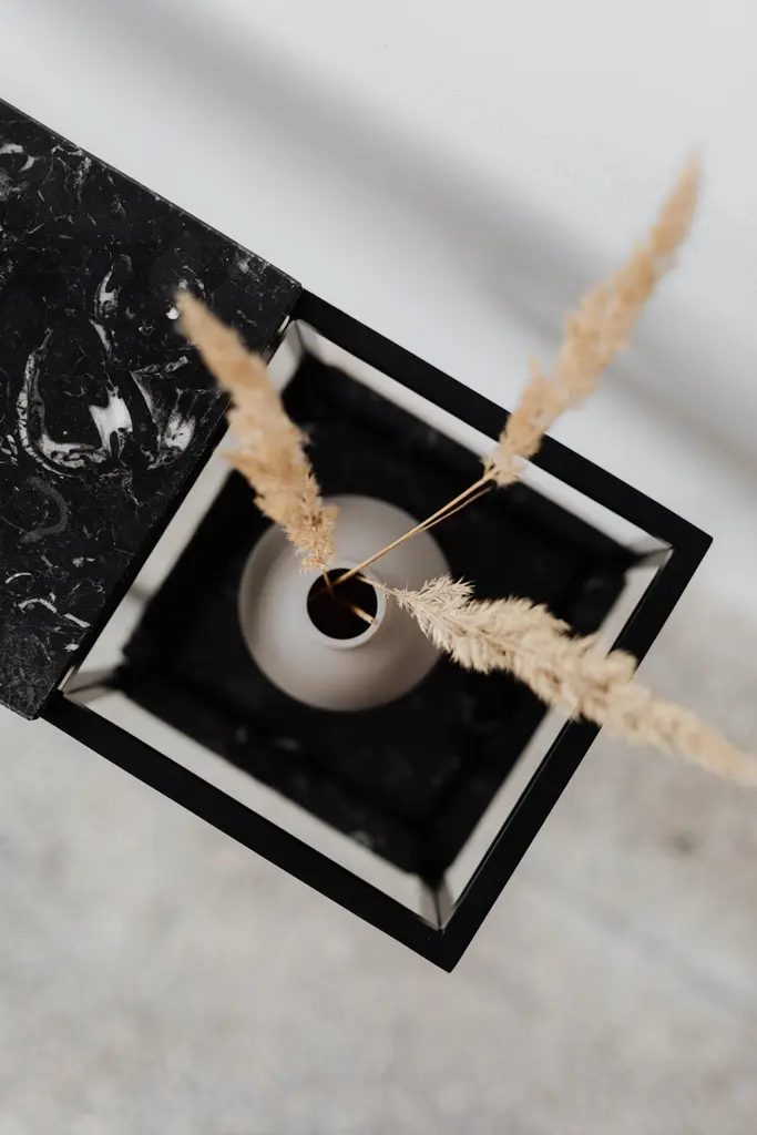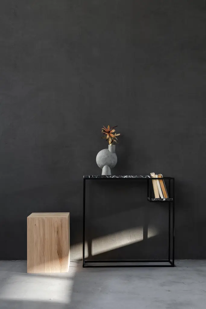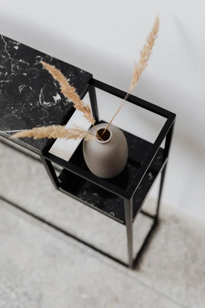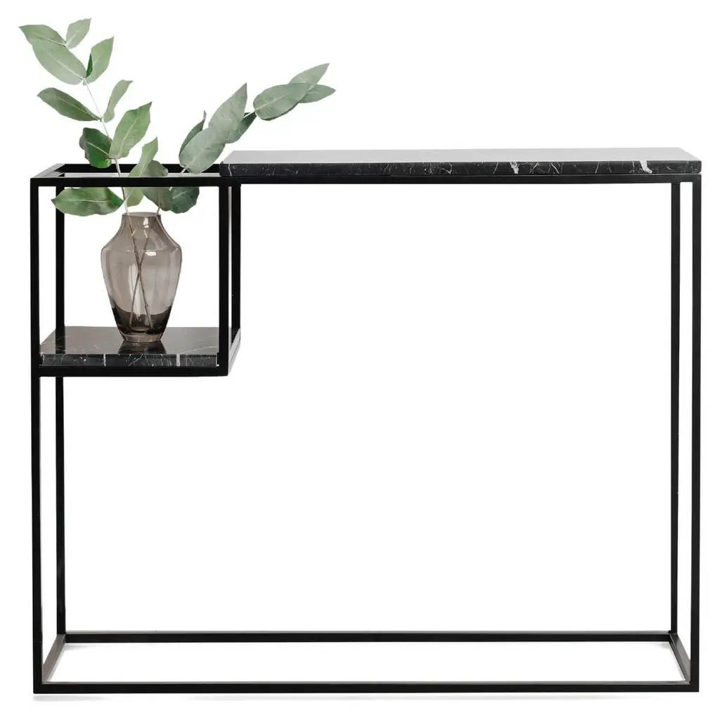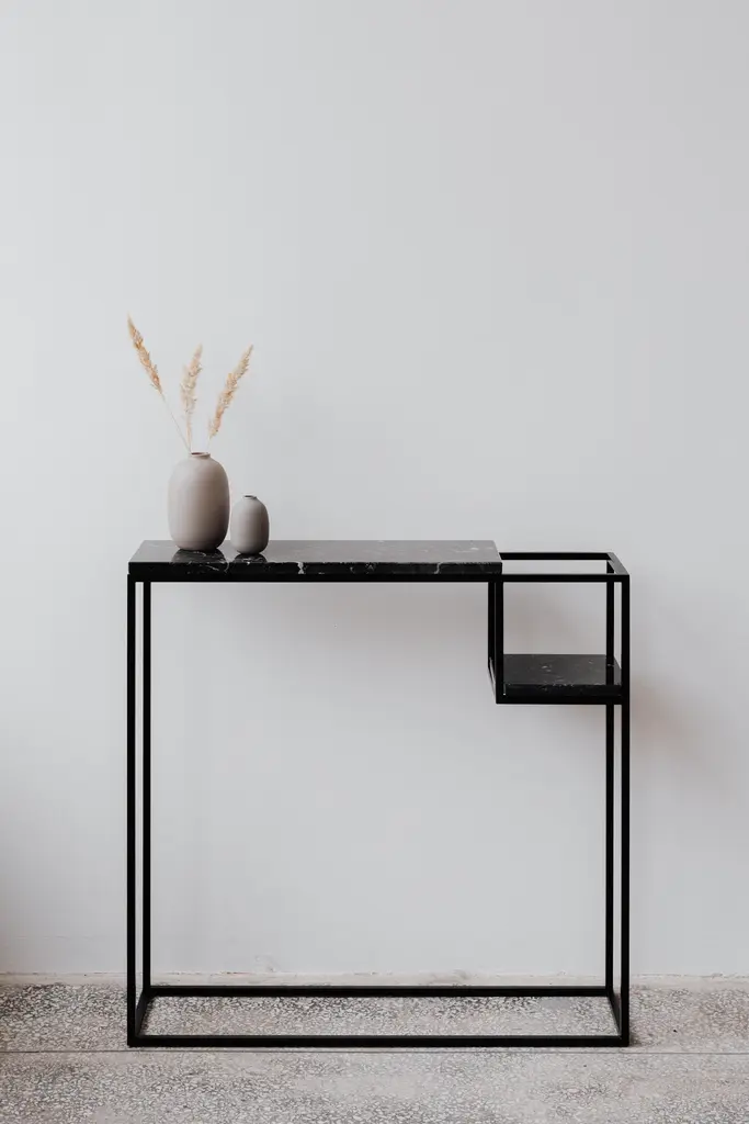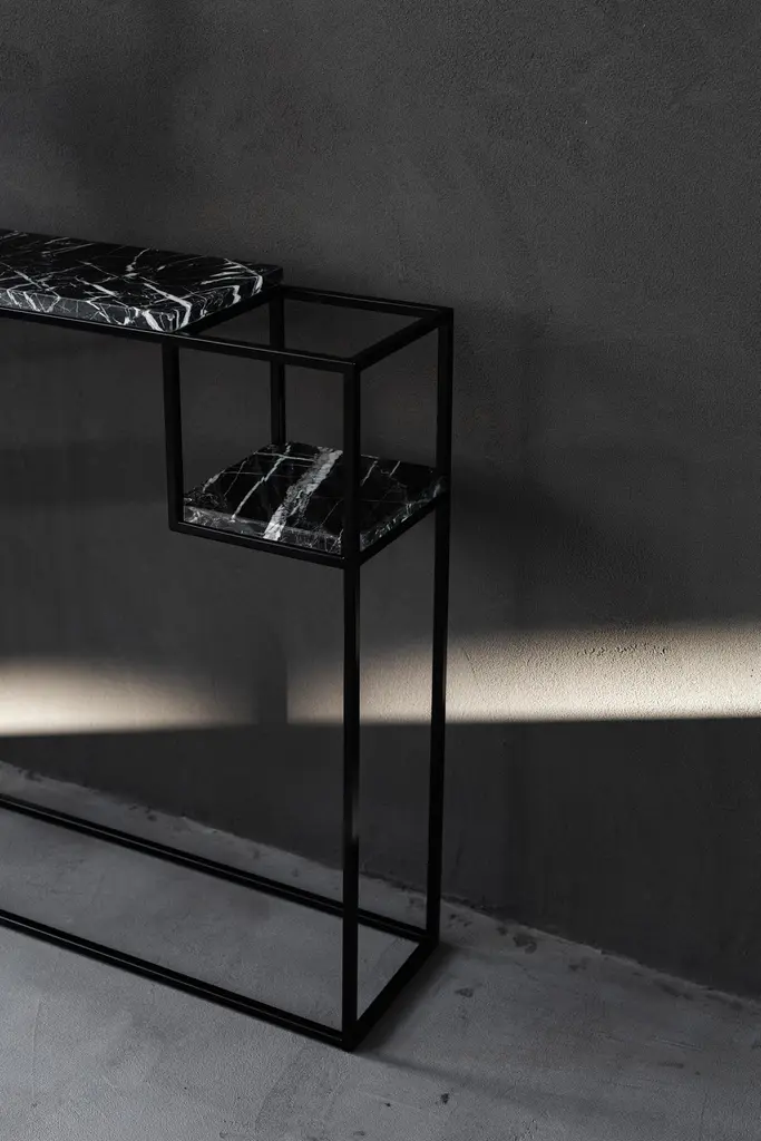 Hop Console Table by Un’commonDesigned by Małgorzata Korycka.Dimensions: D 20 x W 75 x H 75 cm.Materials: Steel and Nero Marquina marble.Available in different marble options. Please contact us.The HOP accessory console is a graceful piece of furniture with a marble top set on a steel black frame. It is suitable for any interior thanks to its original look, and the beautiful marble top gives it an ornamental character. You can use this console in your hall, living room, or bedroom, in one of the countless configurations made possible by the lowered shelf.Our Polish workshop designs and hand-makes furniture from marble and steel. Our furniture should not only be well-designed – it should be a feast for the senses. Nothing can produce this effect quite as good as marble.It is a beautiful, refined, natural material used for centuries in architecture, art, and everyday life. There are many different stone quarries, offering different types and colors of marble. However, because it is a natural material formed in a very complex process, it is virtually impossible to extract two identical pieces of stone. In our opinion, in a world ruled by plastic and mass production, this thrill of surprise is a bit of genuine luxury, reserved only for natural materials and their enthusiasts.Thanks to the physical properties of stone and precise workmanship, Un’common furniture is built to last. Over time, a natural patina may form on the surface, adding extra charm to your beautiful and refined furniture, which – if treated well – will reward you every day. Nothing can beat the taste of coffee when you drink it at a marble table.