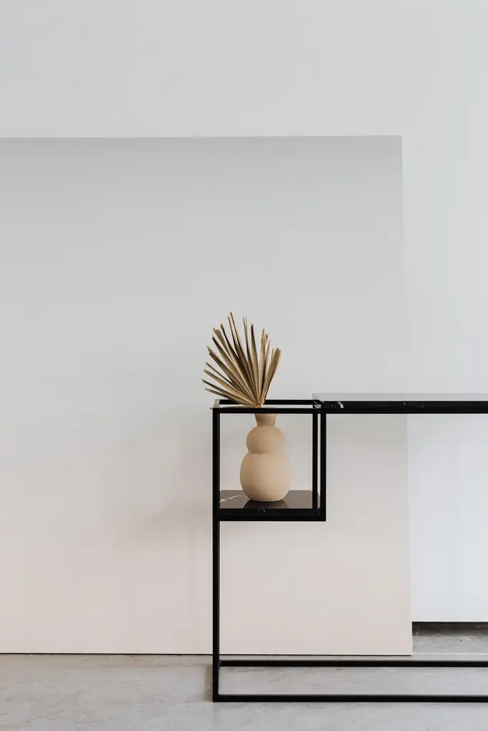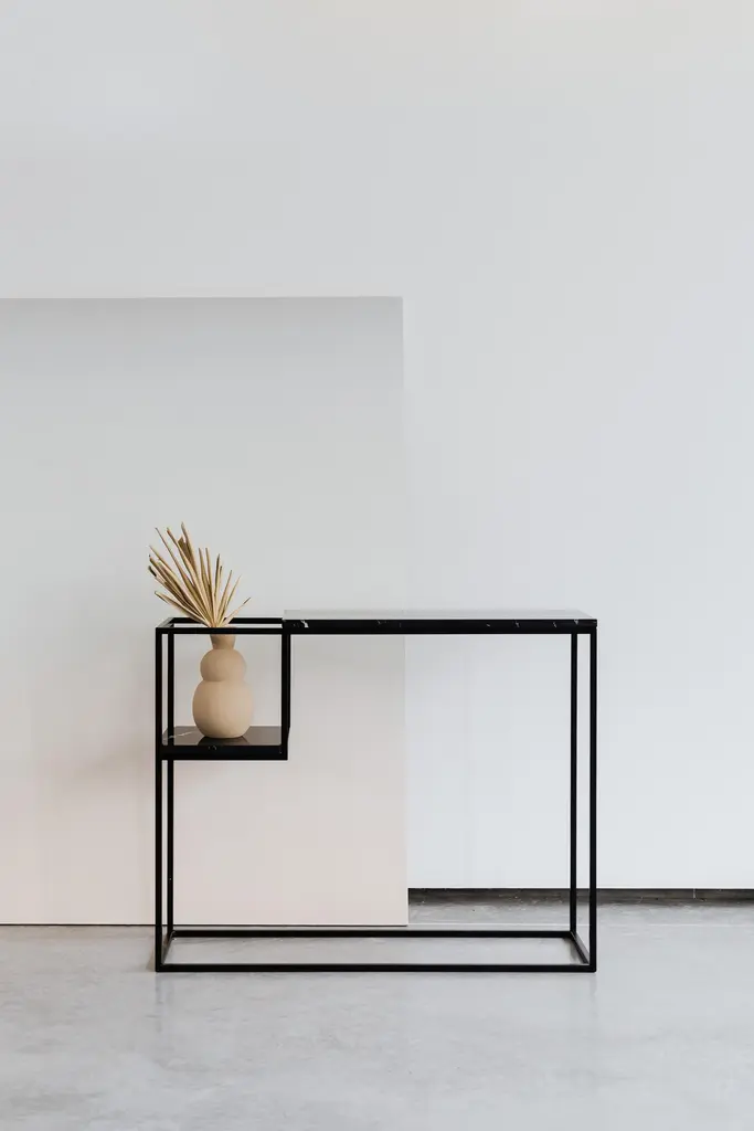 Hop Maxi Console Table by Un’commonDesigned by Małgorzata Korycka.Dimensions: D 20 x W 75 x H 75 cm.Materials: Steel and Nero Marquina marble.Available in different marble options. Please contact us.The HOP MAXI console has a marble top on a steel black frame. It will look great in your hall, living room, or bedroom. The lowered shelf is the perfectplace for flowers or books, as an unconventional way of arranging your space.Our Polish workshop designs and hand-makes furniture from marble and steel. Our furniture should not only be well-designed – it should be a feast for the senses. Nothing can produce this effect quite as good as marble.It is a beautiful, refined, natural material used for centuries in architecture, art, and everyday life. There are many different stone quarries, offering different types and colors of marble. However, because it is a natural material formed in a very complex process, it is virtually impossible to extract two identical pieces of stone. In our opinion, in a world ruled by plastic and mass production, this thrill of surprise is a bit of genuine luxury, reserved only for natural materials and their enthusiasts.Thanks to the physical properties of stone and precise workmanship, Un’common furniture is built to last. Over time, a natural patina may form on the surface, adding extra charm to your beautiful and refined furniture, which – if treated well – will reward you every day. Nothing can beat the taste of coffee when you drink it at a marble table.