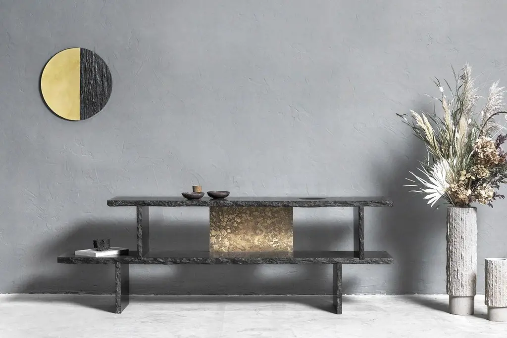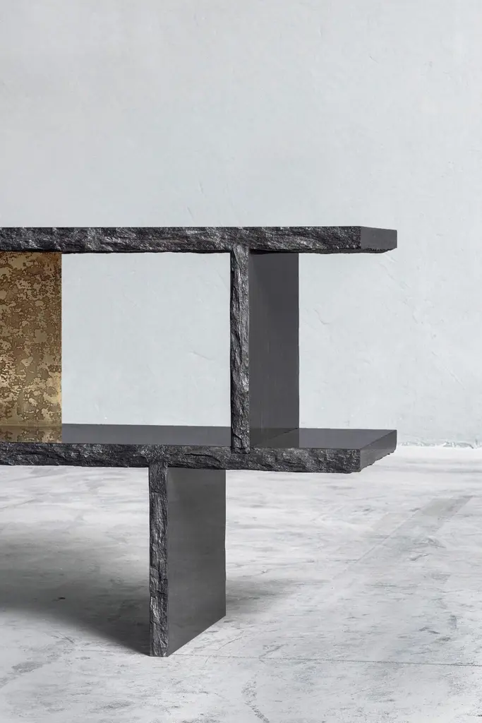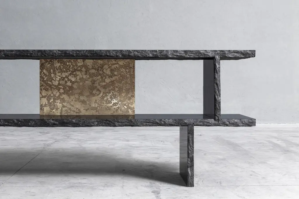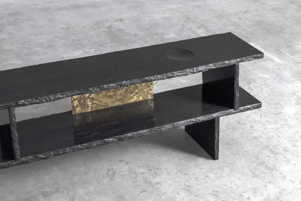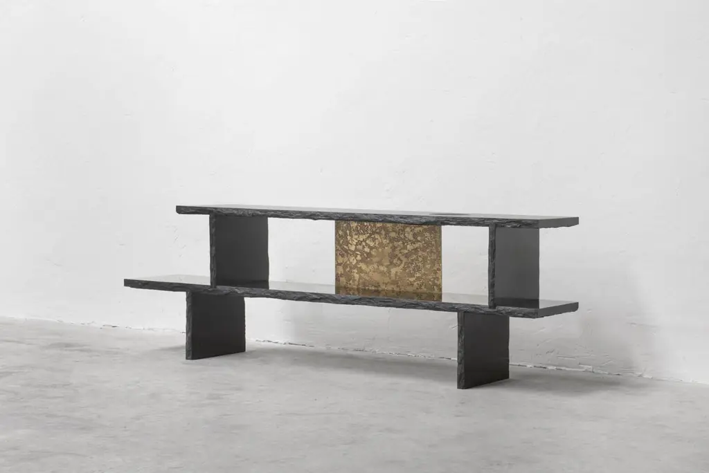 Brass and slate sculpted buffet by Frederic SaulouFauveBuffetBlack slate, chemical engrave brassMeasures: L 230 x W 40 x H 75 cmapproximately 280 kgLimited edition of 10Signed and numbered."While wandering in the streets I have been observing buildings construction toward the sky and found myself eagerly interested in slate material and ornamental stones.I am wondering about post-Industrial heritage of local mineral material and widen the range of possibilities in creating functional objects for the house and in questioning history, material and its usual impact between art and design. Thus, I want to distort, democratize and increase the value of this material as a future heritage and above all as a food for thought. To bring traditional and Industrial know-how face to face for creative purposes, to reinterpret the material in formal and conceptual ways so as to provide it a new understanding."Frederic Saulou's sculpted design artworks introduce a series of work coming from researches andpartnerships between local ateliers and designer, and implemented to another scale, that of the object and contemporary creation.Frédéric Saulou is a proeminent French contemporary designer. Considered by many institutions and critics as one of the most talented designer of the new generation in France.Born in 1989, Frédéric Saulou, lives and works in Rennes, in France. Graduated in space and environmental design at the Institut Supérieur des Arts Appliqués (LISAA) in 2011 and in object design at the Ecole Européenne Supérieure des Beaux Arts de Rennes (EESAB) in 2013, Frédéric will continue to perfect his experience within the Eric Gizard Associés agency and with the designer Frédéric Ruyant. In 2013, he founded the studio, Frédéric Saulou Design Studio, an independent and multidisciplinary design and consulting agency that sees design as a space for research and exchange that allows him to develop a sensitive approach to forms and materials.Experimentation and research take precedence over his work in order to think of new materials and new uses. This accompanies his daily approach so that each project is conceived as a sculpture in its own right, between simplicity and technicality. His approach guides him towards a global approach but also unique in his creations, thus creating particular interactions between the user and the object, between Industrial craftsmanship. Today Frédéric works on various projects, from objects to space, in series or limited editions and collaborates with prestigious institutions and brands such as the publishing houses Ligne Roset, Drugeot Manufacture, Brossier Saderne, Vista Alegre, Esprit Porcelaine Limoges etc.