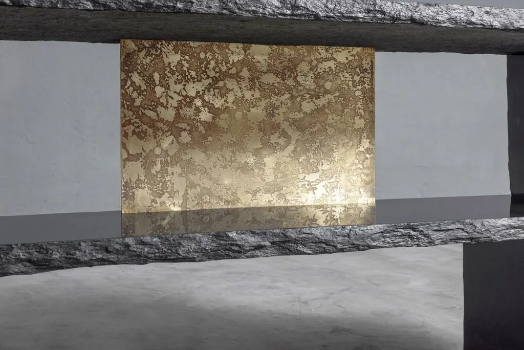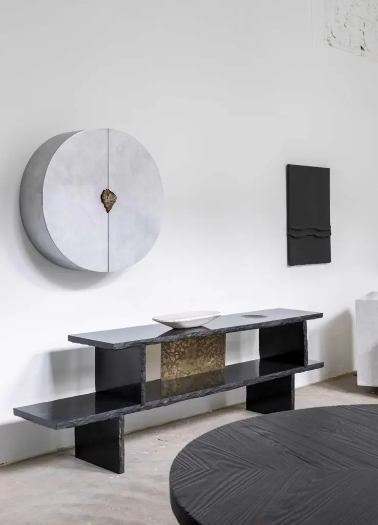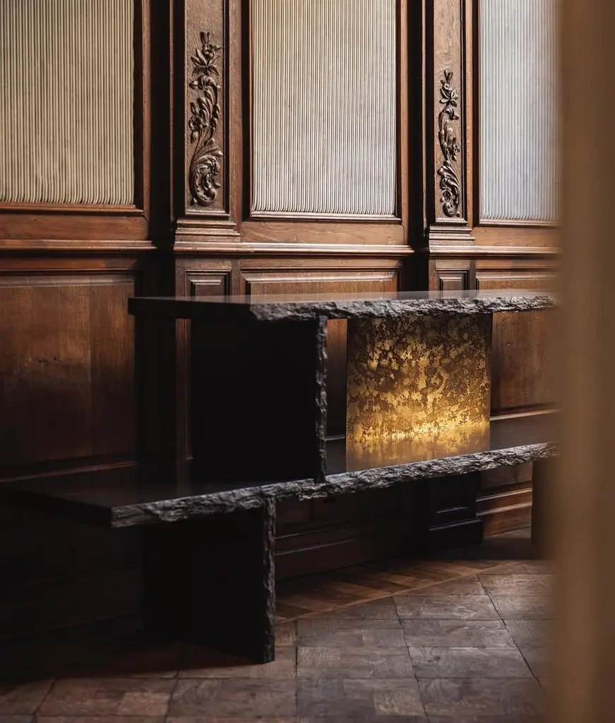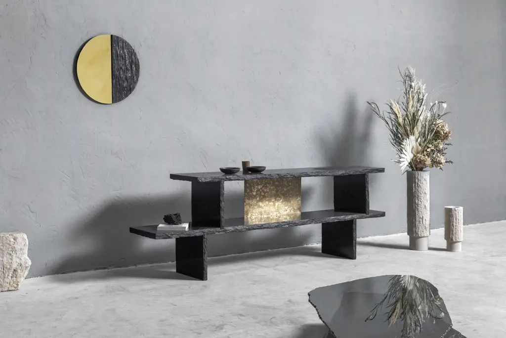 Brass and slate sculpted buffet by Frederic SaulouFauveBuffetBlack slate, chemical engrave brassMeasures: L 230 x W 40 x H 75 cmapproximately 280 kgLimited edition of 10Signed and numbered."While wandering in the streets I have been observing buildings construction toward the sky and found myself eagerly interested in slate material and ornamental stones.I am wondering about post-Industrial heritage of local mineral material and widen the range of possibilities in creating functional objects for the house and in questioning history, material and its usual impact between art and design. Thus, I want to distort, democratize and increase the value of this material as a future heritage and above all as a food for thought. To bring traditional and Industrial know-how face to face for creative purposes, to reinterpret the material in formal and conceptual ways so as to provide it a new understanding."Frederic Saulou's sculpted design artworks introduce a series of work coming from researches andpartnerships between local ateliers and designer, and implemented to another scale, that of the object and contemporary creation.Frédéric Saulou is a proeminent French contemporary designer. Considered by many institutions and critics as one of the most talented designer of the new generation in France.Born in 1989, Frédéric Saulou, lives and works in Rennes, in France. Graduated in space and environmental design at the Institut Supérieur des Arts Appliqués (LISAA) in 2011 and in object design at the Ecole Européenne Supérieure des Beaux Arts de Rennes (EESAB) in 2013, Frédéric will continue to perfect his experience within the Eric Gizard Associés agency and with the designer Frédéric Ruyant. In 2013, he founded the studio, Frédéric Saulou Design Studio, an independent and multidisciplinary design and consulting agency that sees design as a space for research and exchange that allows him to develop a sensitive approach to forms and materials.Experimentation and research take precedence over his work in order to think of new materials and new uses. This accompanies his daily approach so that each project is conceived as a sculpture in its own right, between simplicity and technicality. His approach guides him towards a global approach but also unique in his creations, thus creating particular interactions between the user and the object, between Industrial craftsmanship. Today Frédéric works on various projects, from objects to space, in series or limited editions and collaborates with prestigious institutions and brands such as the publishing houses Ligne Roset, Drugeot Manufacture, Brossier Saderne, Vista Alegre, Esprit Porcelaine Limoges etc.