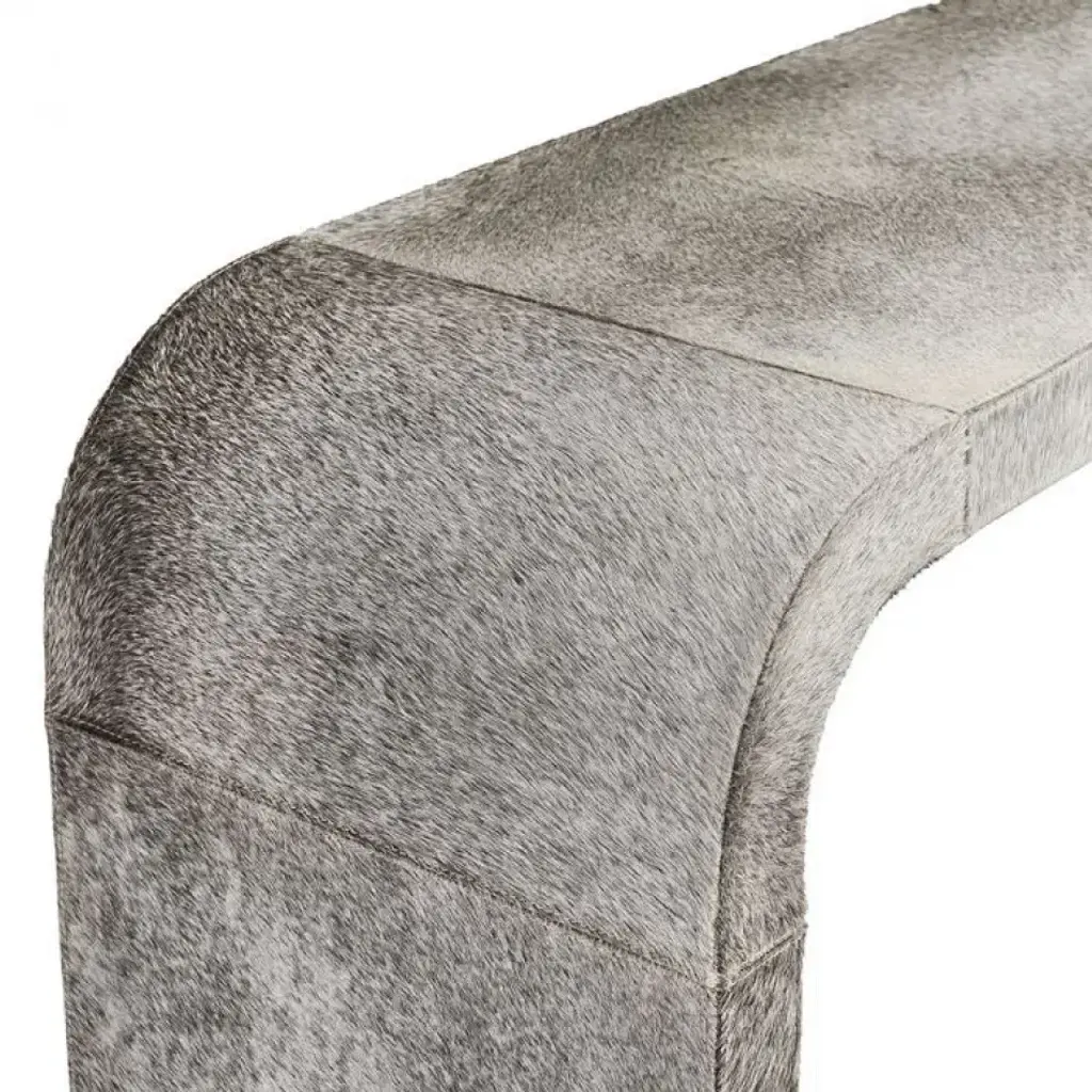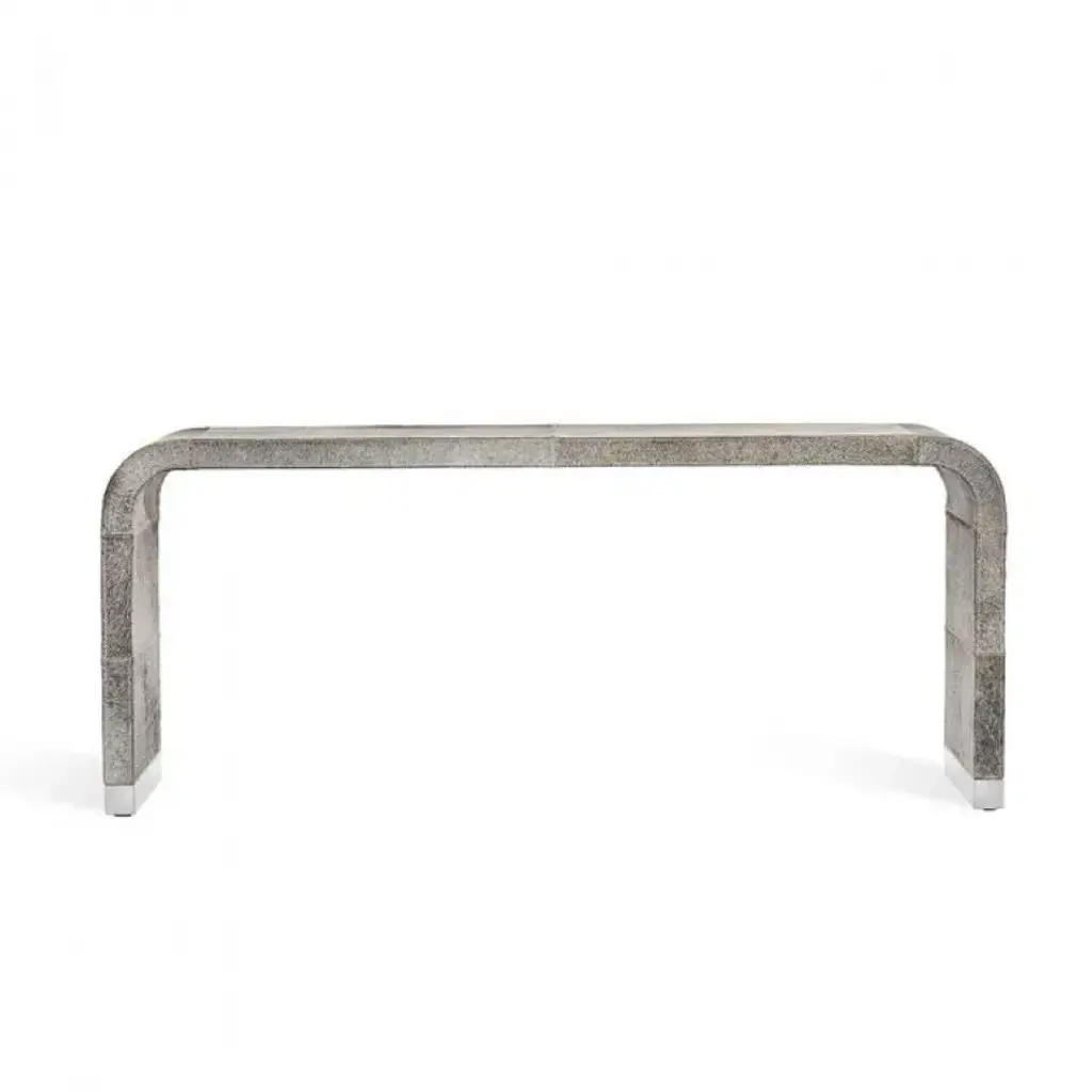 A totally fabulous natural hide pairs with metal accents in a polished nickel finish to turn the Hudson Waterfall Console Table into the chicest piece. Hide is a natural material. Variations in color are to be expected and add to the unique charm of each piece. Our natural coloration is hand selected to include hides with predominantly grey undertones, but cream, tan and brown hues can also be expected.