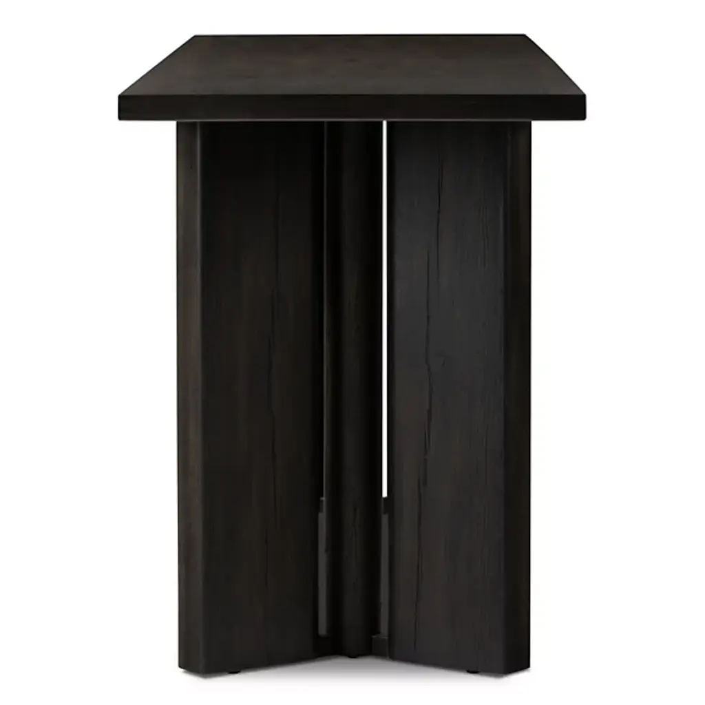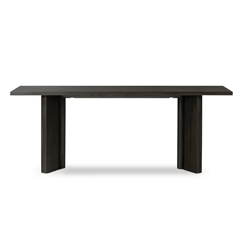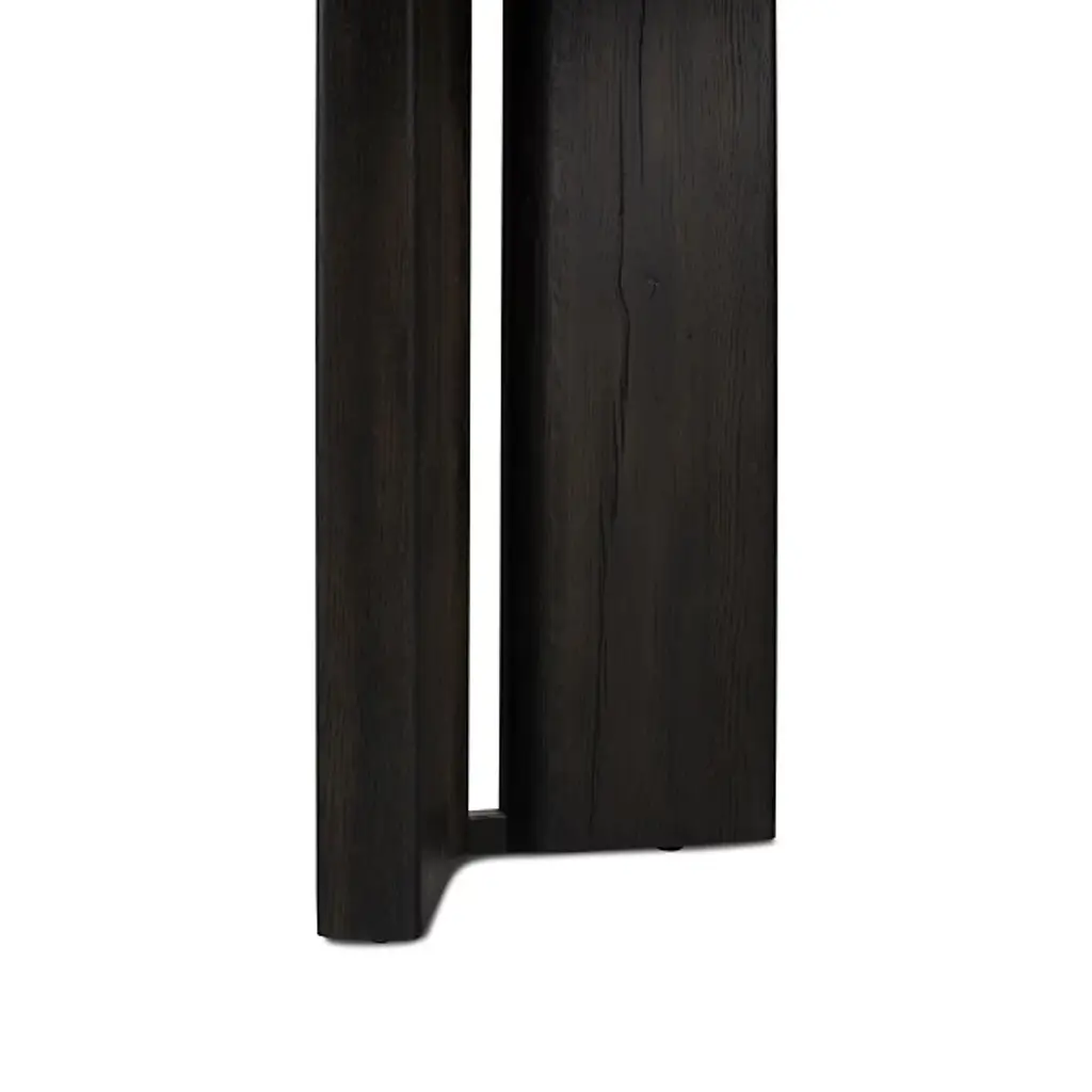 The Huxley Console Table by Four Hands is designed to captivate with its open design and alluring smoked black finish. This rectangular coffee table boasts a distinctive design, featuring angled panels and vertical columns that intersect to create a captivating architectural allure. Constructed from thick oak veneer and solid oak, it seamlessly blends contemporary flair with rustic modern aesthetics. Ideal for elevating your living spaces, this table adds depth and character, infusing a sense of sophistication while preserving a touch of rustic charm. With its unique design and rich finish, the table becomes a striking focal point in any modern interior setting.