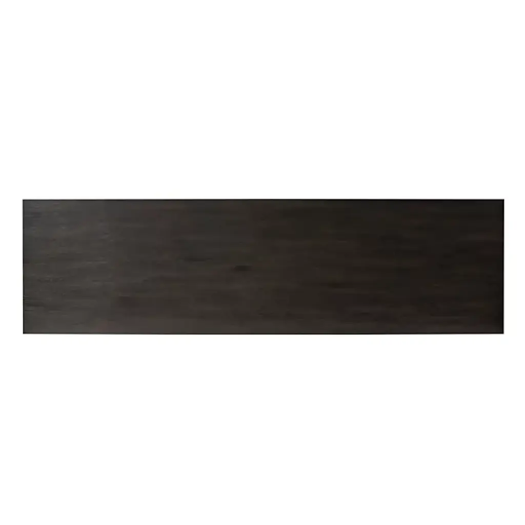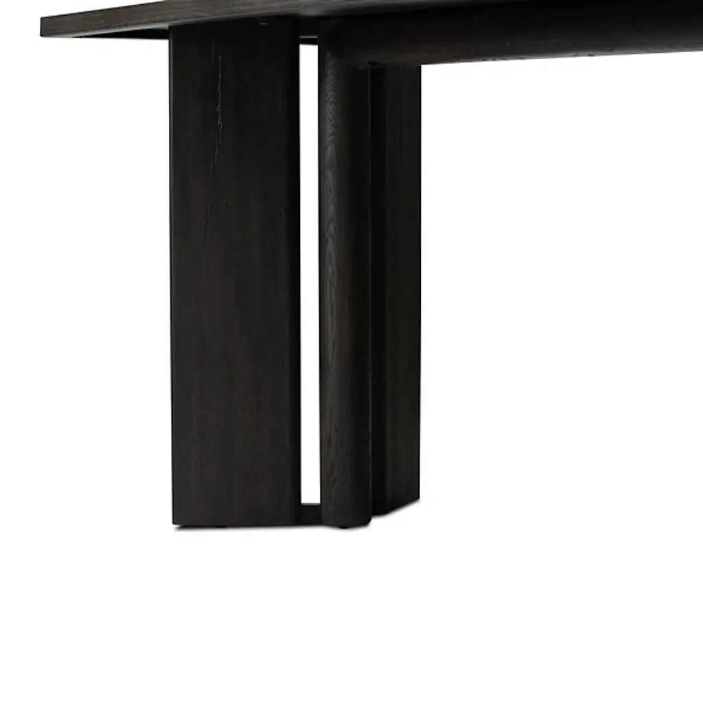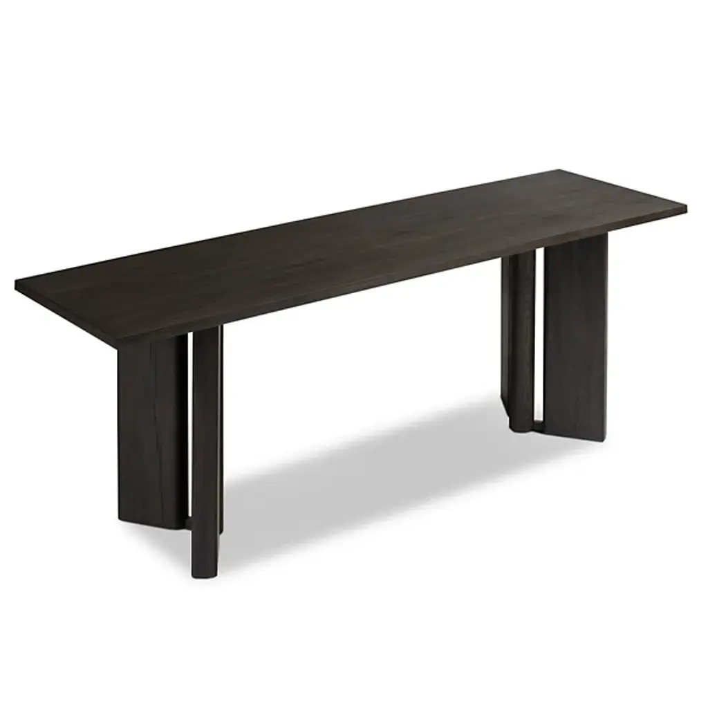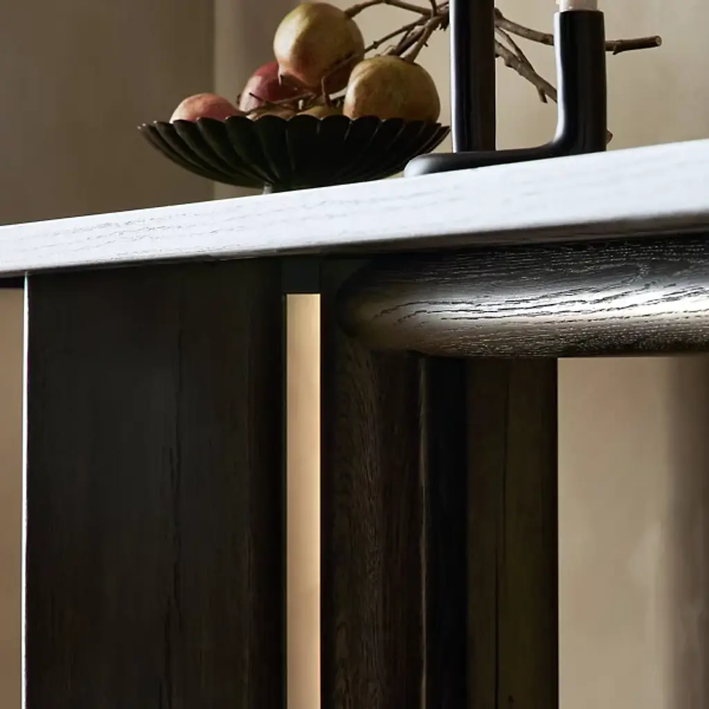 The Huxley Console Table by Four Hands is designed to captivate with its open design and alluring smoked black finish. This rectangular coffee table boasts a distinctive design, featuring angled panels and vertical columns that intersect to create a captivating architectural allure. Constructed from thick oak veneer and solid oak, it seamlessly blends contemporary flair with rustic modern aesthetics. Ideal for elevating your living spaces, this table adds depth and character, infusing a sense of sophistication while preserving a touch of rustic charm. With its unique design and rich finish, the table becomes a striking focal point in any modern interior setting.