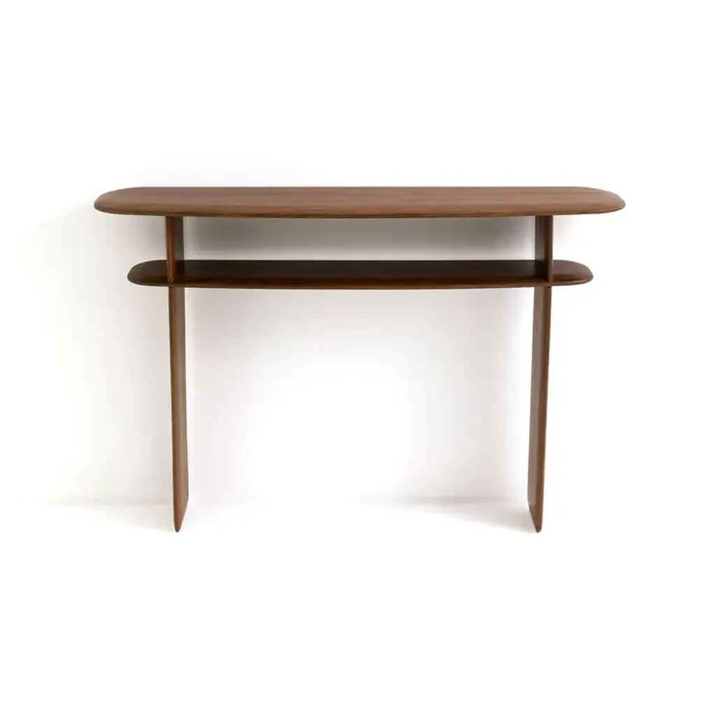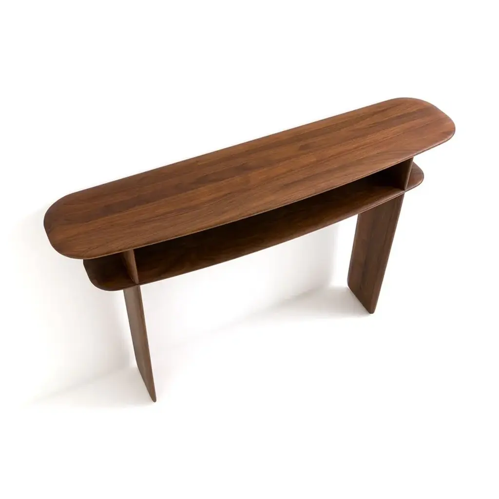 When the nobility of solid walnut is combined with the softness of an organic design. The shelves with bevelled edges and the base inspired by aeroplane wings display a line that is as contemporary as it is timeless. Iloss is a console table designed by AMPM.In solid walnut with polyurethane finishOrganically shaped tops with bevelled edges.Legs with wing profile finish
