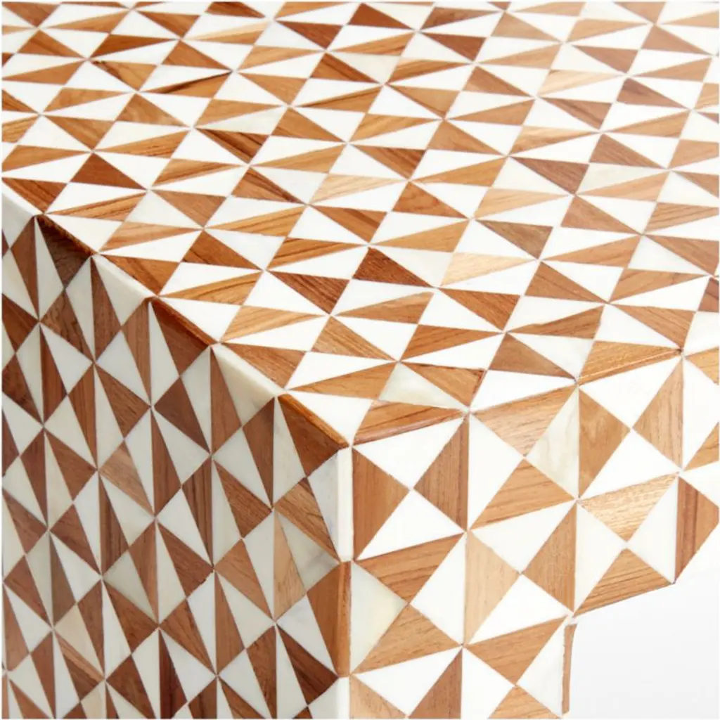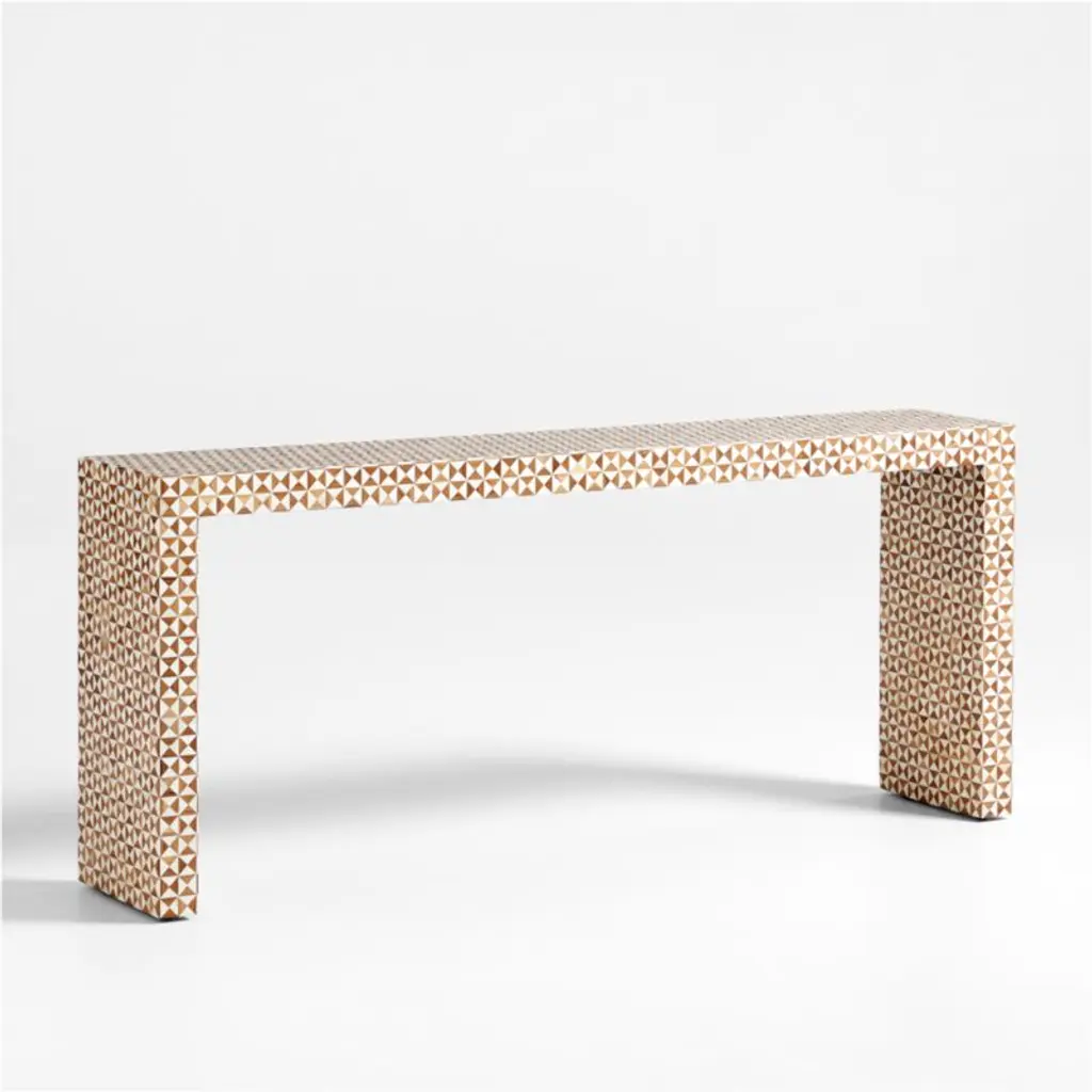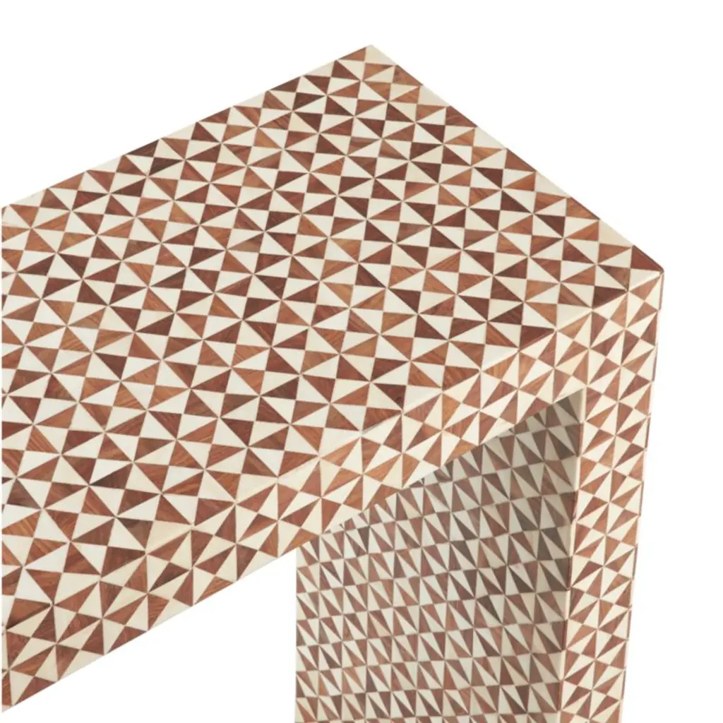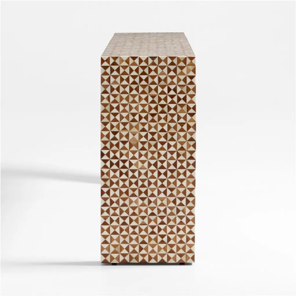 True to the tradition of intarsiathe time-honored technique of fitting together bits of wood in a mosaic-like designskilled artisans inlay triangles of handcut teak and bone to create this artisanal console table. The simple Parsons-style design lets the workmanship and materials take center stage.