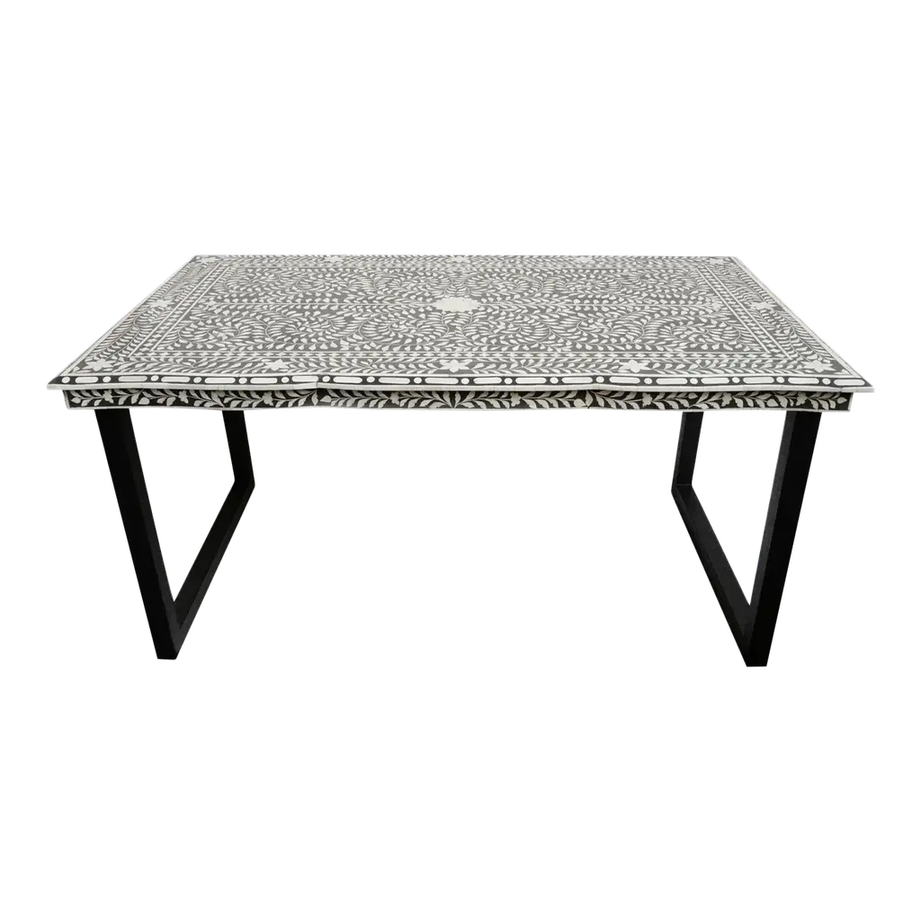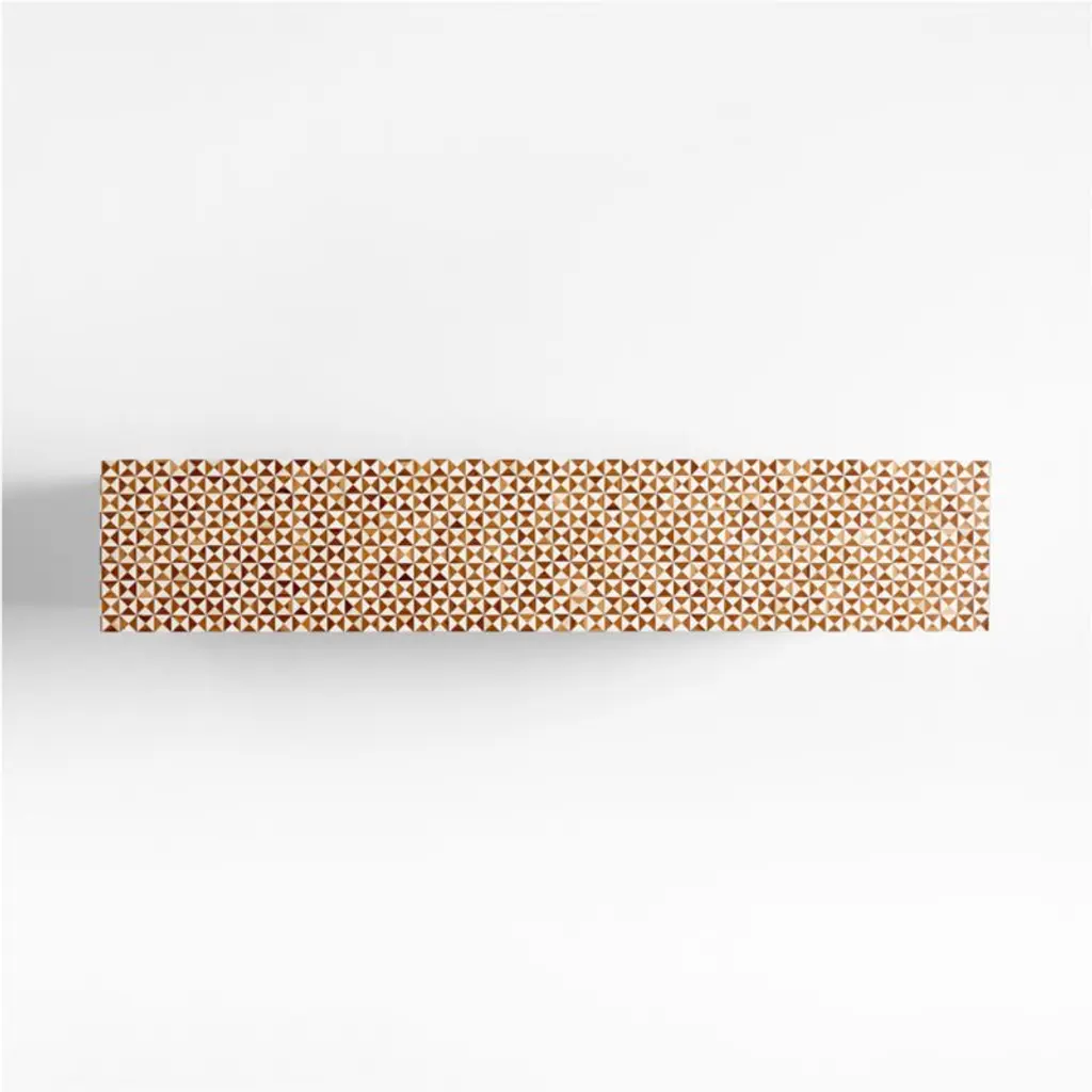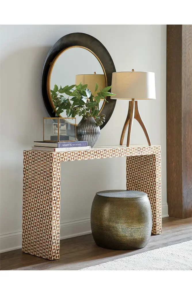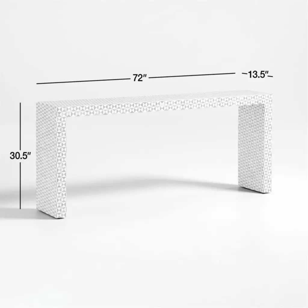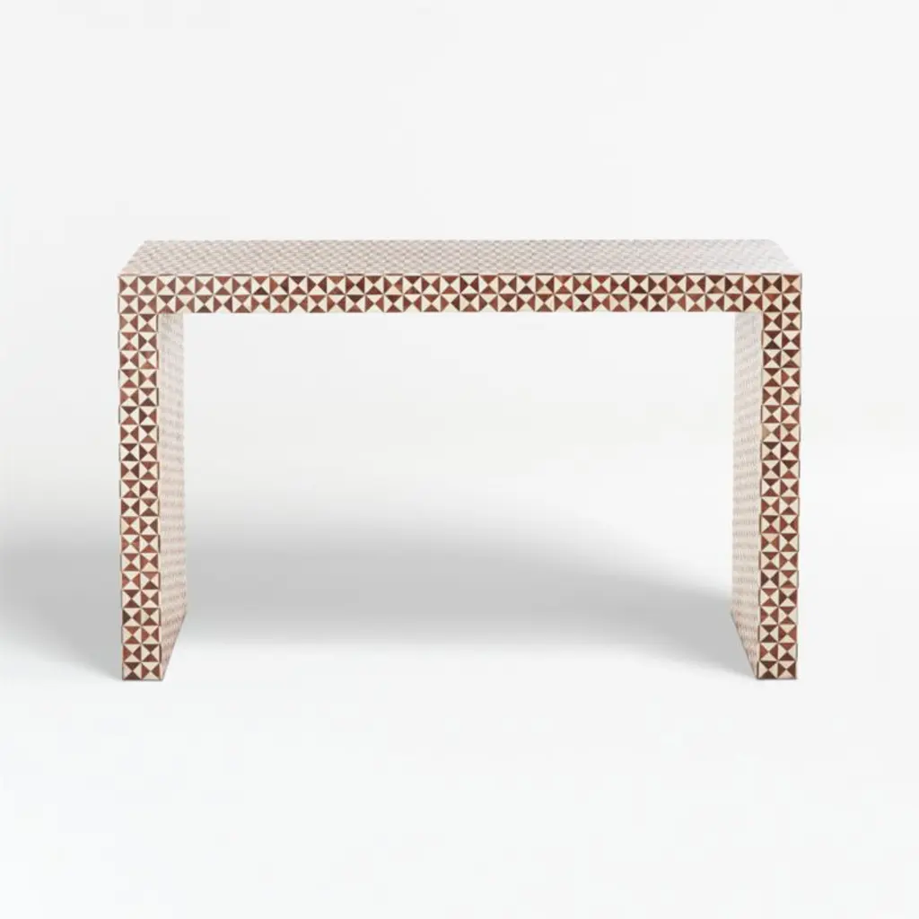 True to the tradition of intarsiathe time-honored technique of fitting together bits of wood in a mosaic-like designskilled artisans inlay triangles of handcut teak and bone to create this artisanal console table. The simple Parsons-style design lets the workmanship and materials take center stage.