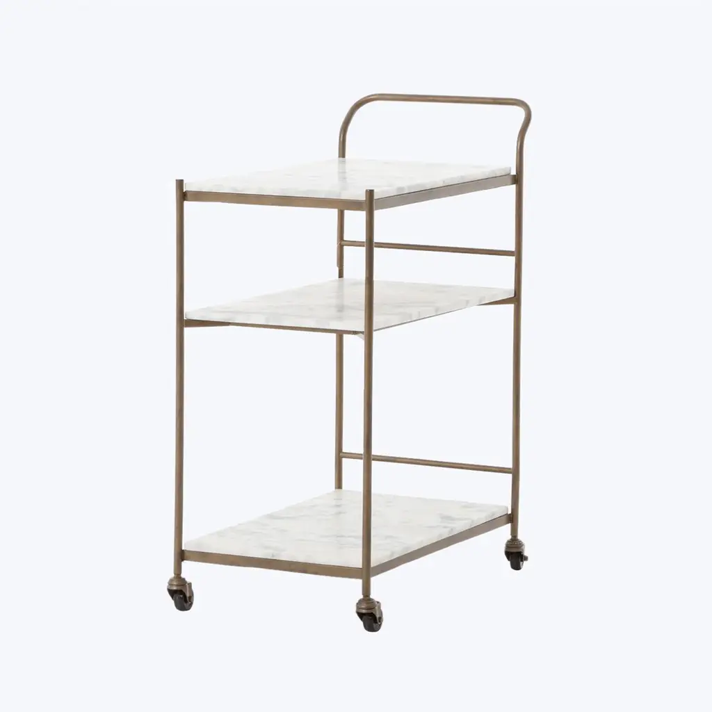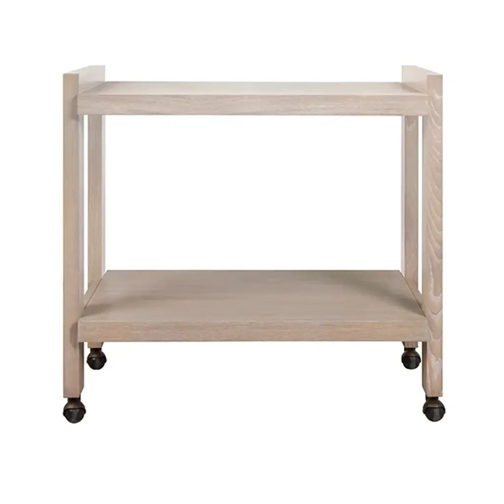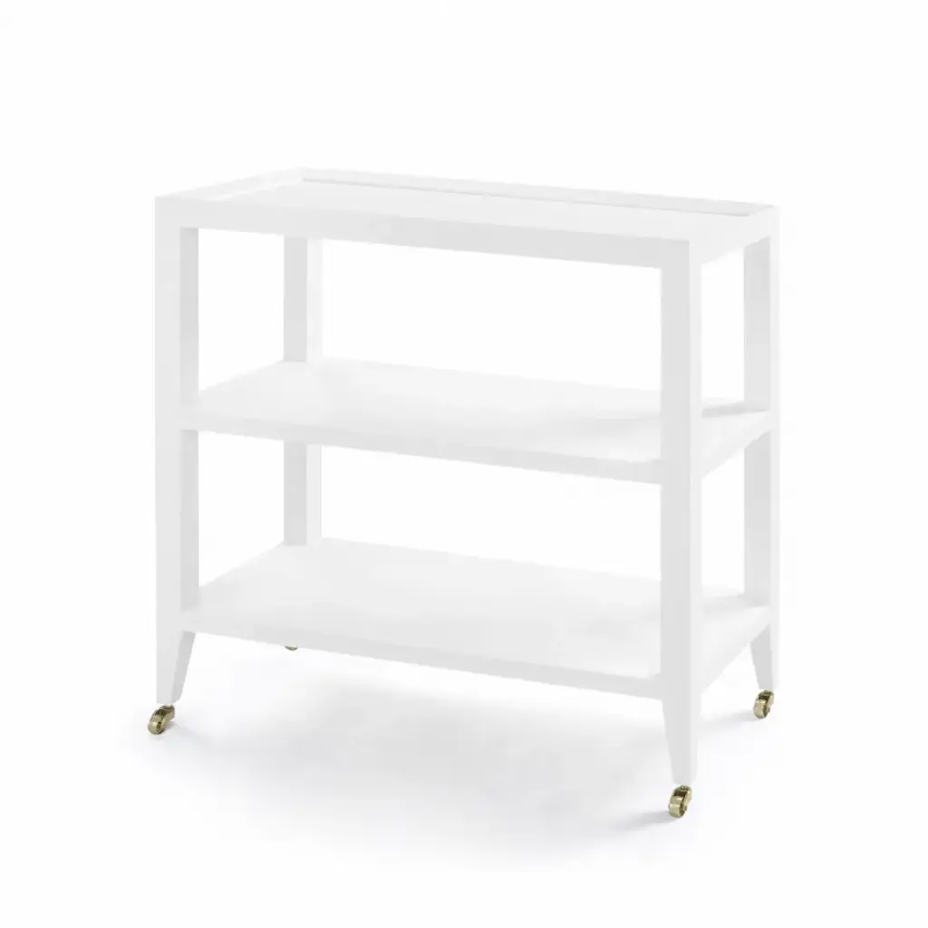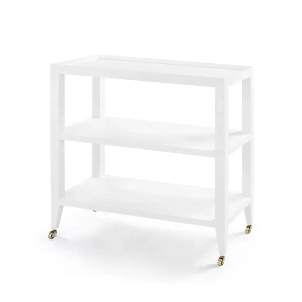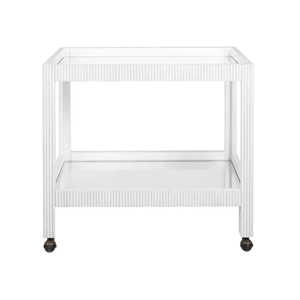 The Isadora Collection revisits old world luxury through a modernist lens, bringing structural furnishings to life with rich finishes, polished hardware, and a portable aspect that harks back to the golden age of entertaining, when pieces were rolled into parlors and drawing rooms according to one's needs. Of course, Villa & House has timelessness in mind when it comes to the likes of our Isadora Console Table, a longstanding staple of our collection. Featuring an open silhouette wrapped in lacquered white grasscloth, stacked shelves, and a tabletop with a slightly inclined edge, the piece is ideal for everyday use or decorative display. Set on four brass wheels, the Isadora is glamorous yet practical, and can act as a versatile serving table or bar cart.