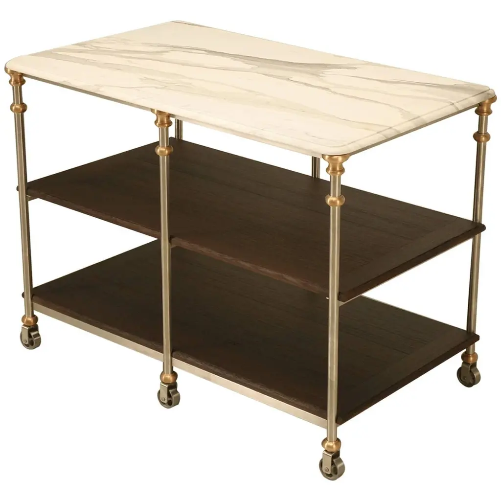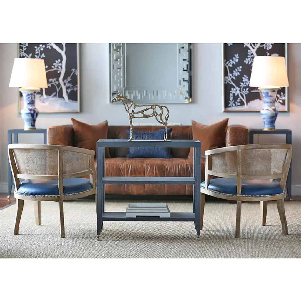 The three long shelves of our Isadora French Country Blue Grasscloth Brass Casters 3 Tier Rolling Console set the stage for all of your favorite finds, collectibles and photographs. Mahogany construction is finished in beautiful blue lacquered grass cloth for a touch of texture. Four polished brass casters add mobility to this contemporary console table.