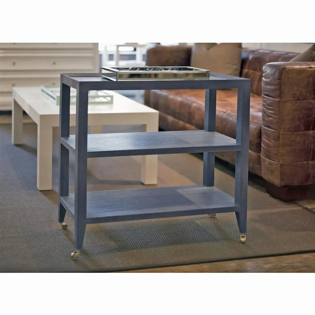 Isadora Navy Blue Grasscloth Brass Casters 3 Tier Rolling Console