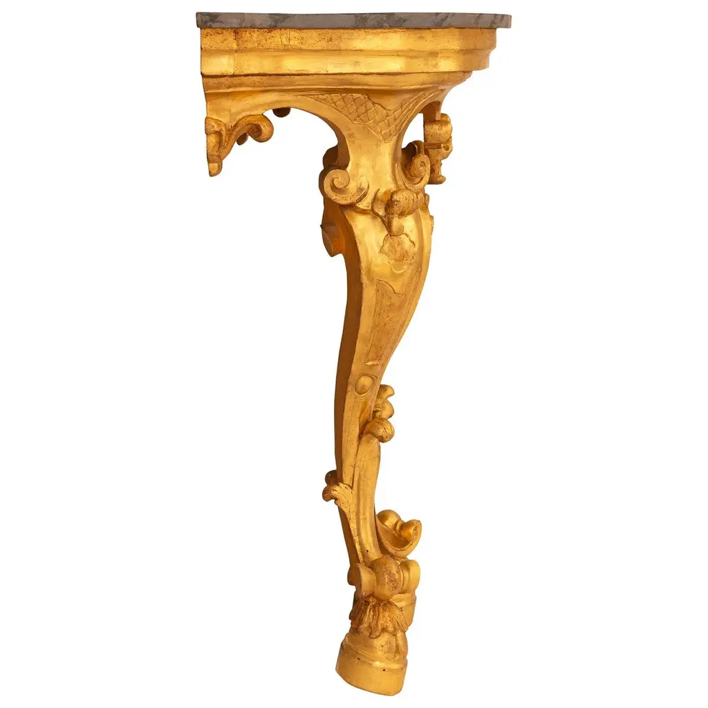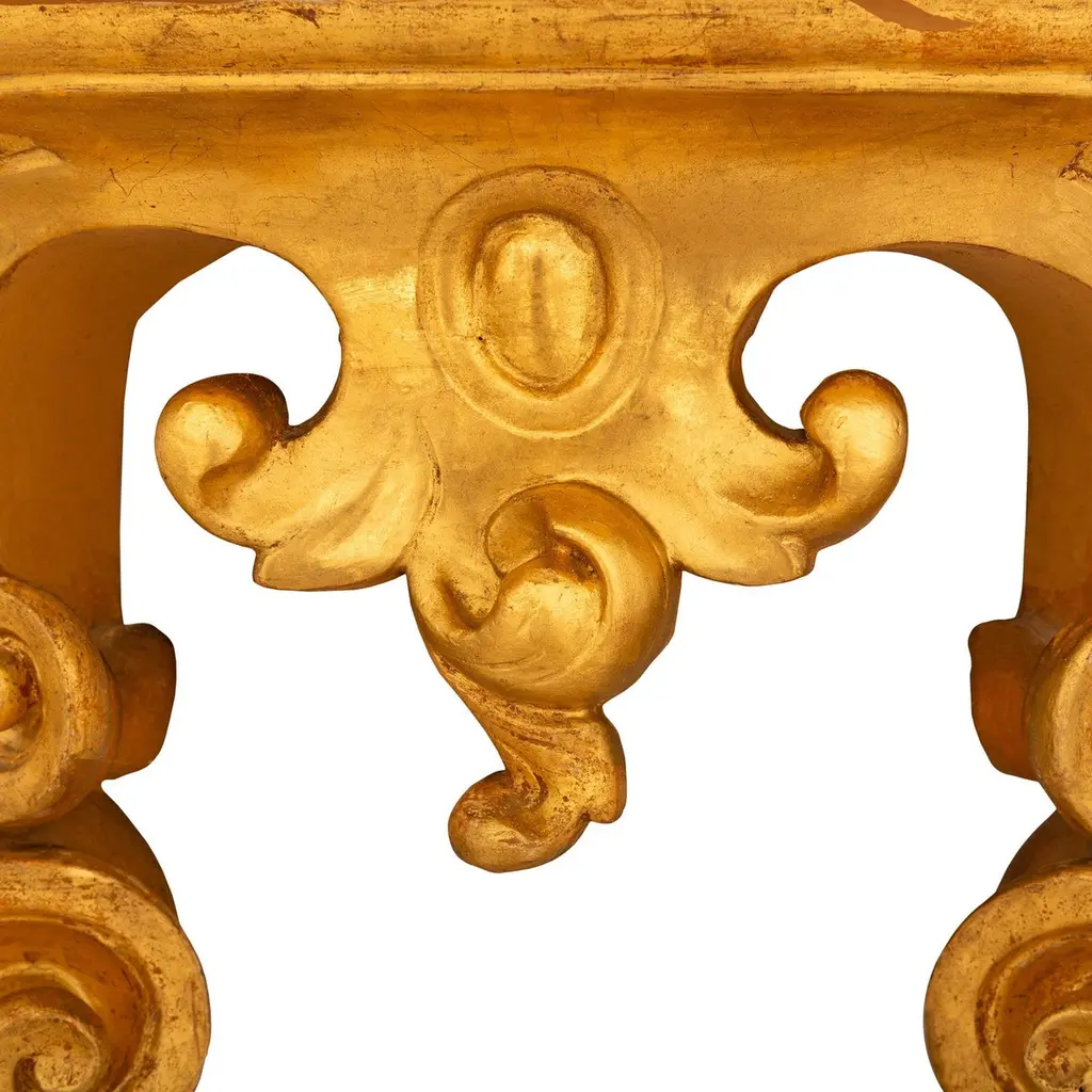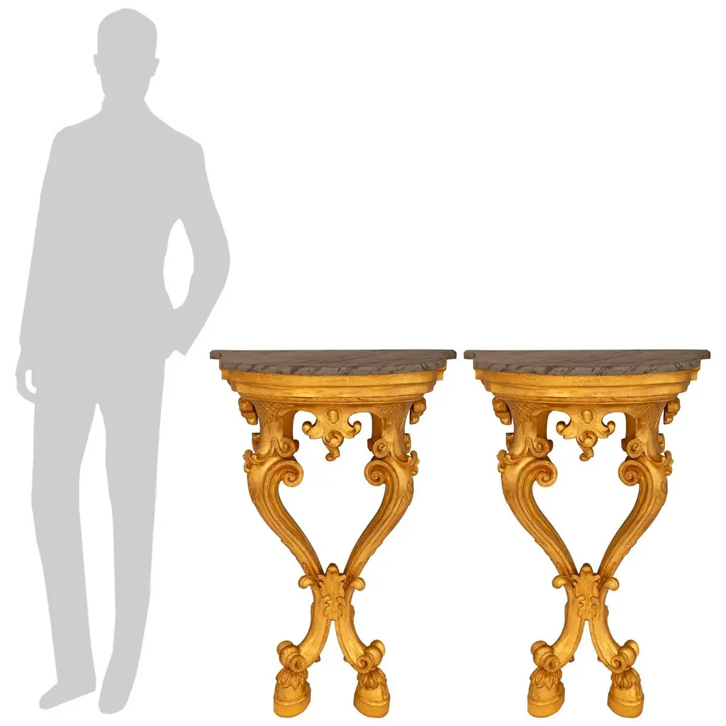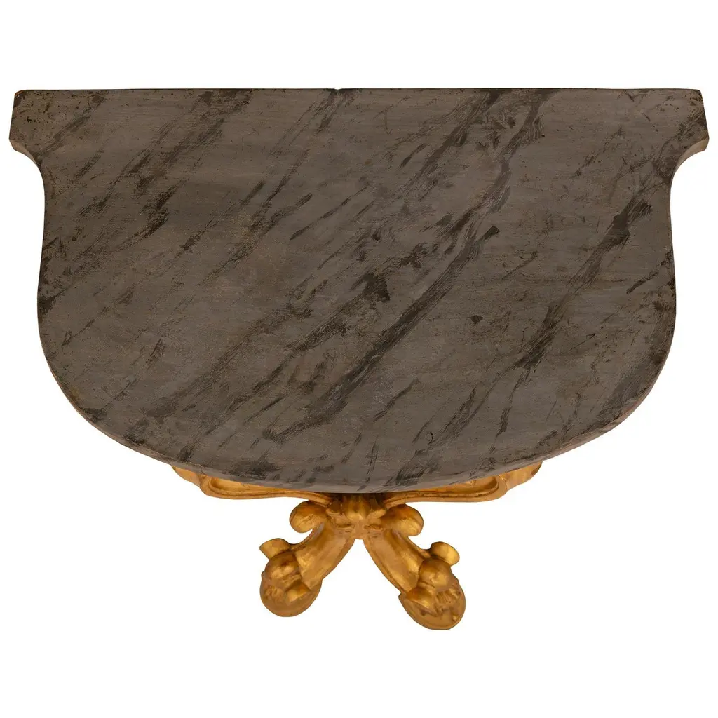 An impressive and most decorative pair of Italian 19th century Louis XV st. Giltwood and faux painted marble consoles. Each stunning wall-mounted console is raised on two 'S' scrolled legs and supported by foliate decorated hoof feet. Both legs curve inwards and meet amidst foliate decorations before extending upwards to meet the uniquely shaped front apron. The finely carved front apron consists of an arbalest shaped central reserve that is flanked by scaled patterns above each leg. Atop the stepped Giltwood apron is the demi lune shaped faux marble top with veins of darker shades. All original gilt throughout.