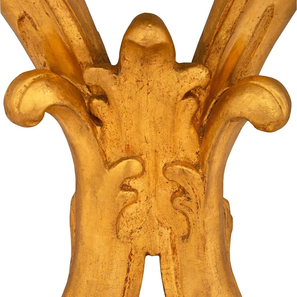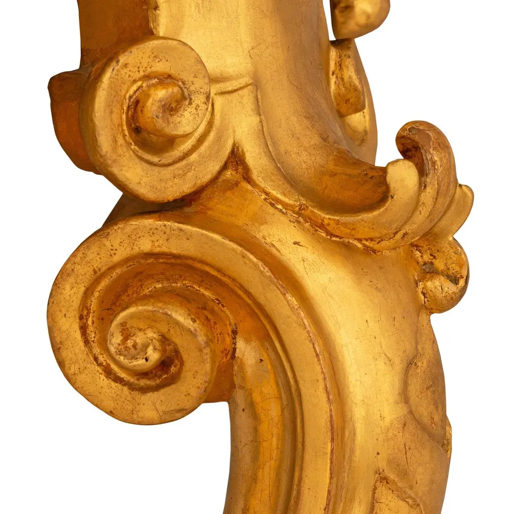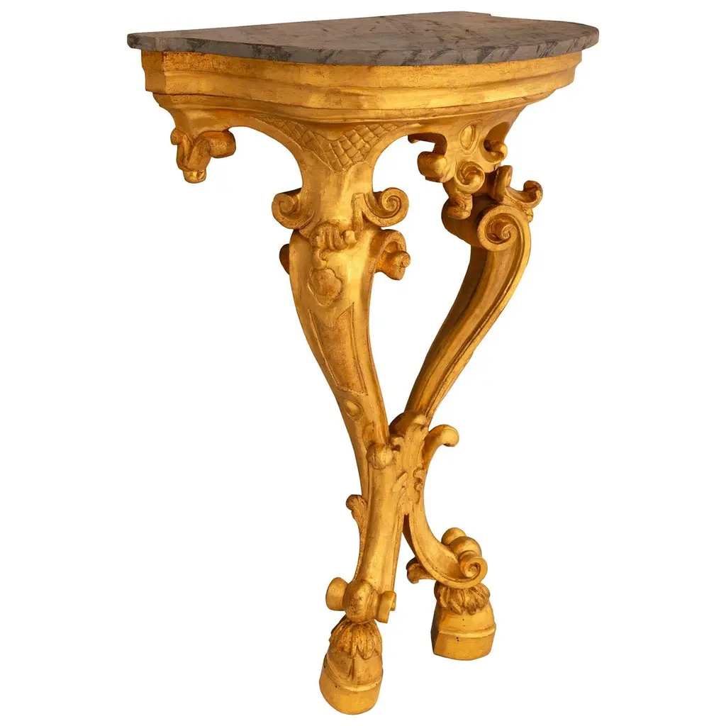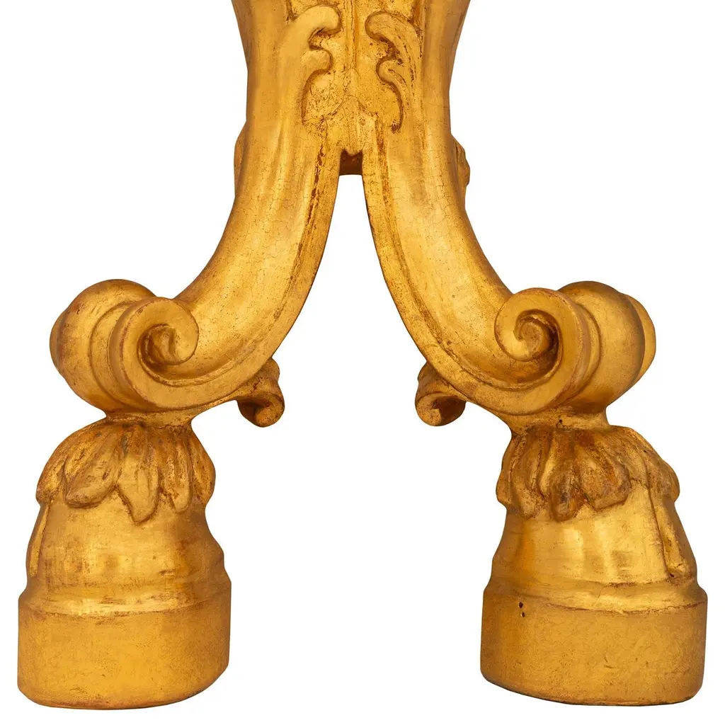 An impressive and most decorative pair of Italian 19th century Louis XV st. Giltwood and faux painted marble consoles. Each stunning wall-mounted console is raised on two 'S' scrolled legs and supported by foliate decorated hoof feet. Both legs curve inwards and meet amidst foliate decorations before extending upwards to meet the uniquely shaped front apron. The finely carved front apron consists of an arbalest shaped central reserve that is flanked by scaled patterns above each leg. Atop the stepped Giltwood apron is the demi lune shaped faux marble top with veins of darker shades. All original gilt throughout.