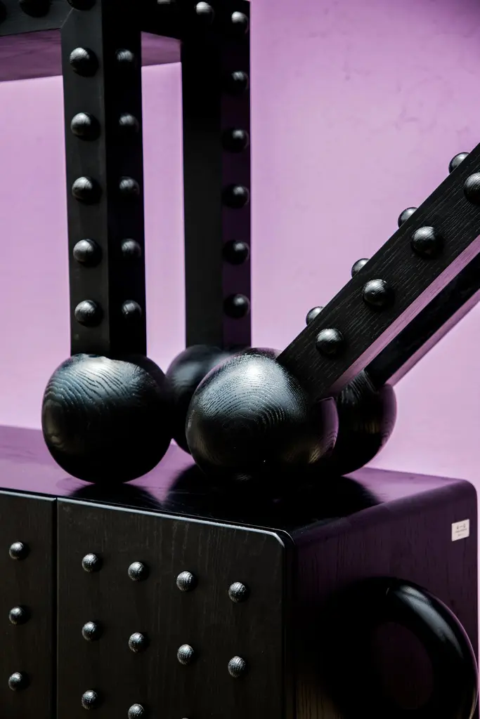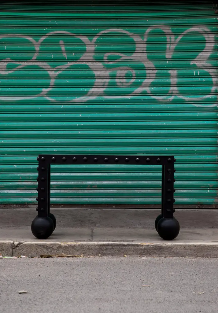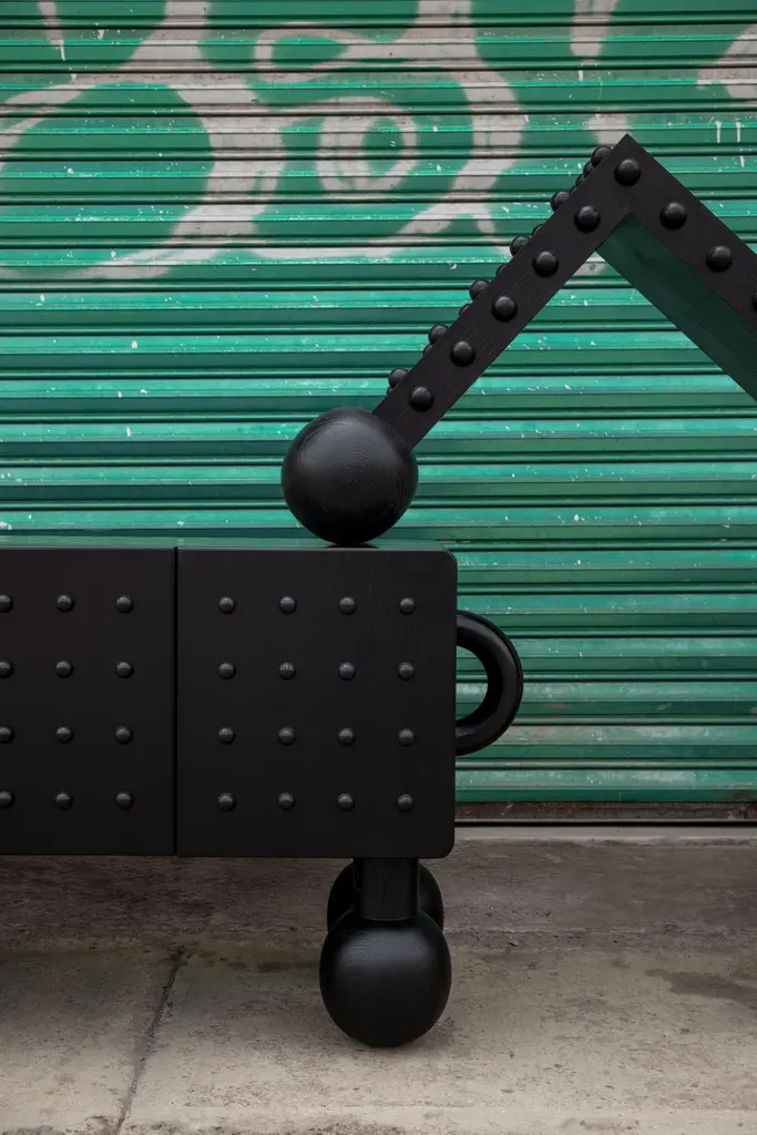 Jaguarcito Black Console Table by Andres GutierrezDimensions: D 35 x W 120 x H 75 cm.Materials: Solid white oak with black lacquer finish.Also available in natural finish. Please contact us.— Inspired by the jaguar—In the Aztec civilization, the jaguar was worshiped as a deity; Due to their ability to see in the dark, jaguars were believed to be able to travel between realms.This sacred animal also represented the image of Tepeyolotl, "The Heart Of The Mountain", the Aztec god of mountains and earthquakes.Made out of solid oak wood,this slim console table-with hemispheres all over its frame representing thejaguar's spots-has solid hand-carved spherical bases under each one of its four legs. This jaguar is ready to pounce.Andrés Gutiérrez founded A-G Studio, a residential and commercial interior design firm in 2012, from where he has participated in the integral design of projects such as hotels, bars, restaurants and other commercial spaces, always with a deep interest in the exchange of information and feelings between the user and space.