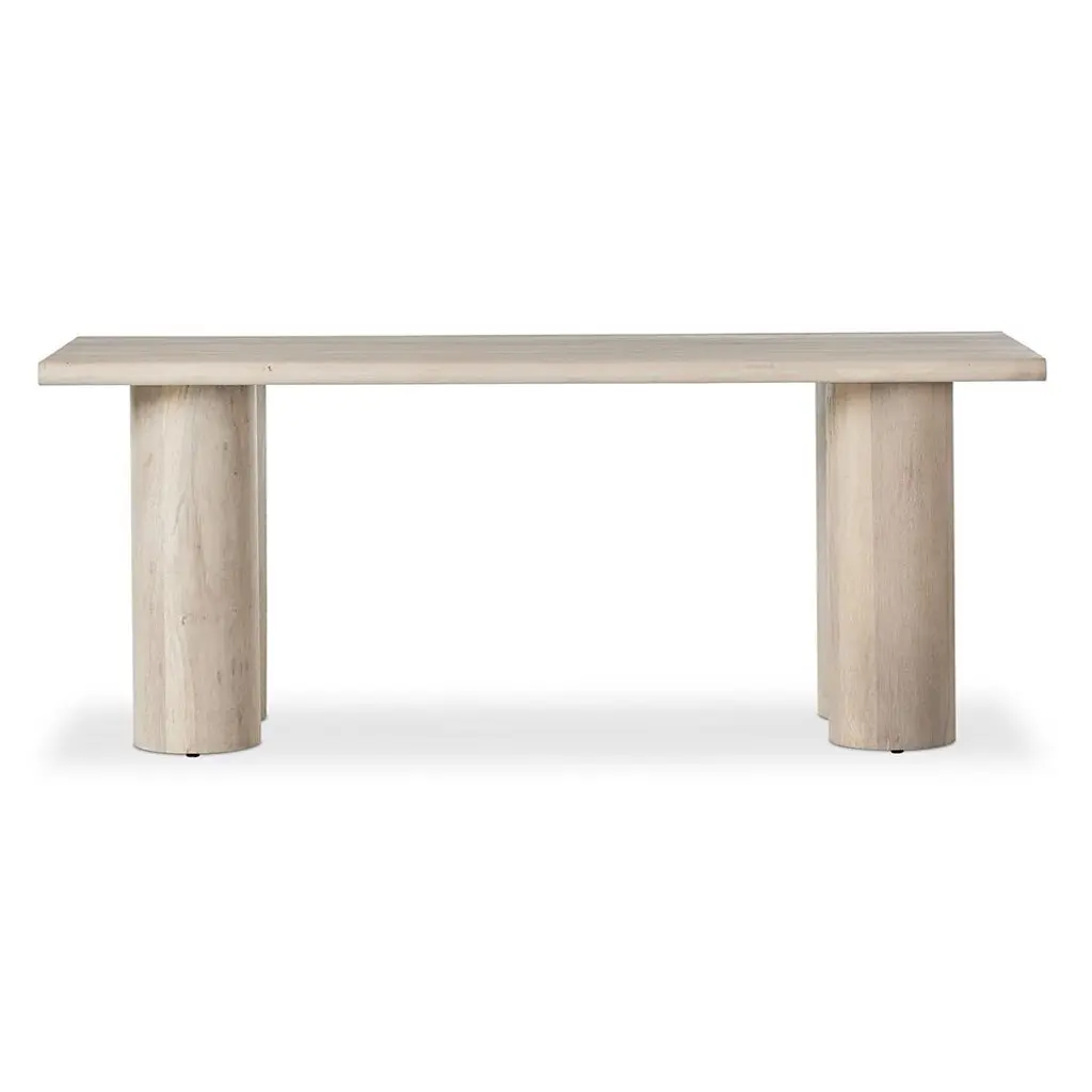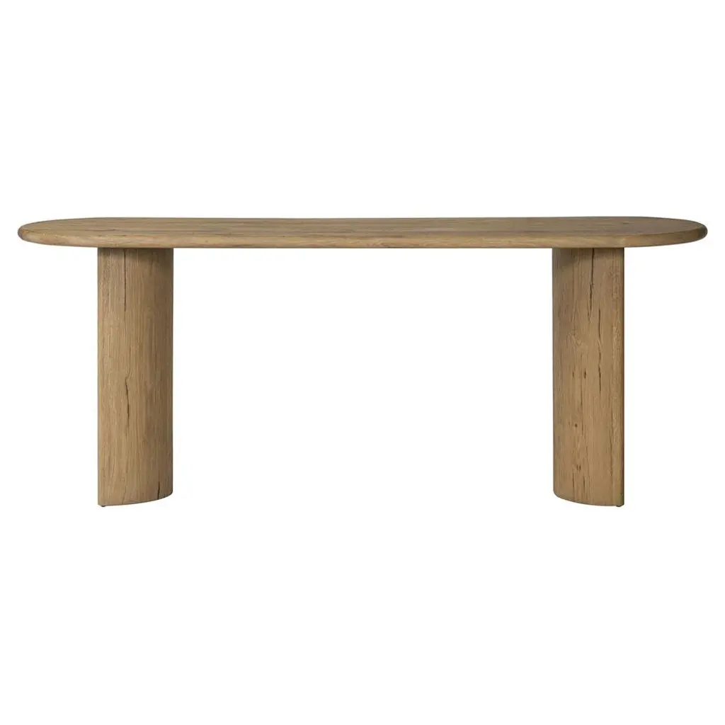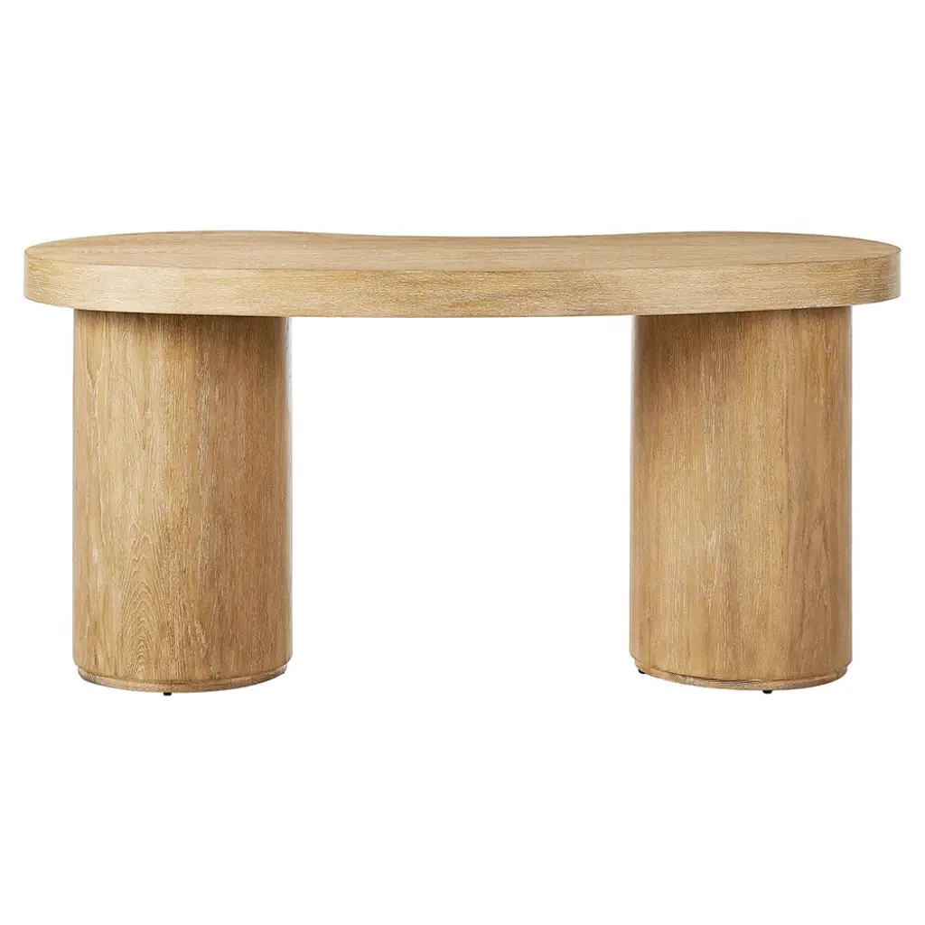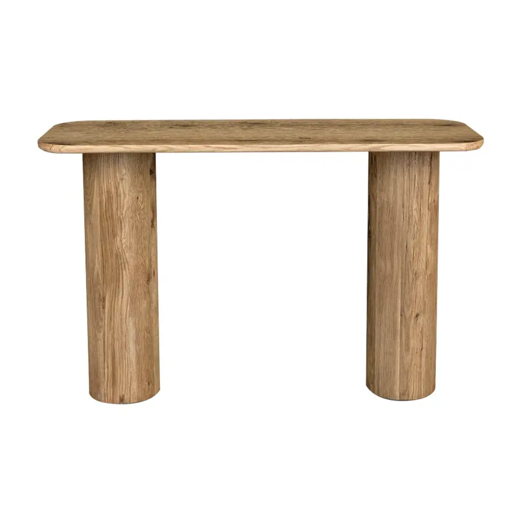 The Jasper console table features rounded tabletop edges and column legs. It is the perfect addition to your living room or entryway space due to the natural finish and versatile design.