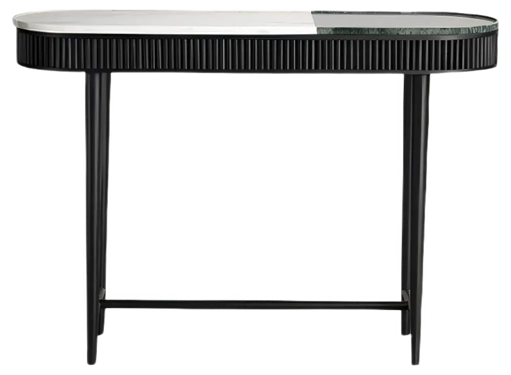 The Mausam Console features a delicate reeded detail and solid black marble top. Perfect for a lobby, lounge or bedroom, this versatile piece of design provides a hint of style and minimalism. The design combines 2 strong materials which have been given a delicate form through the craftsmanship of carefully carving details into the piece.