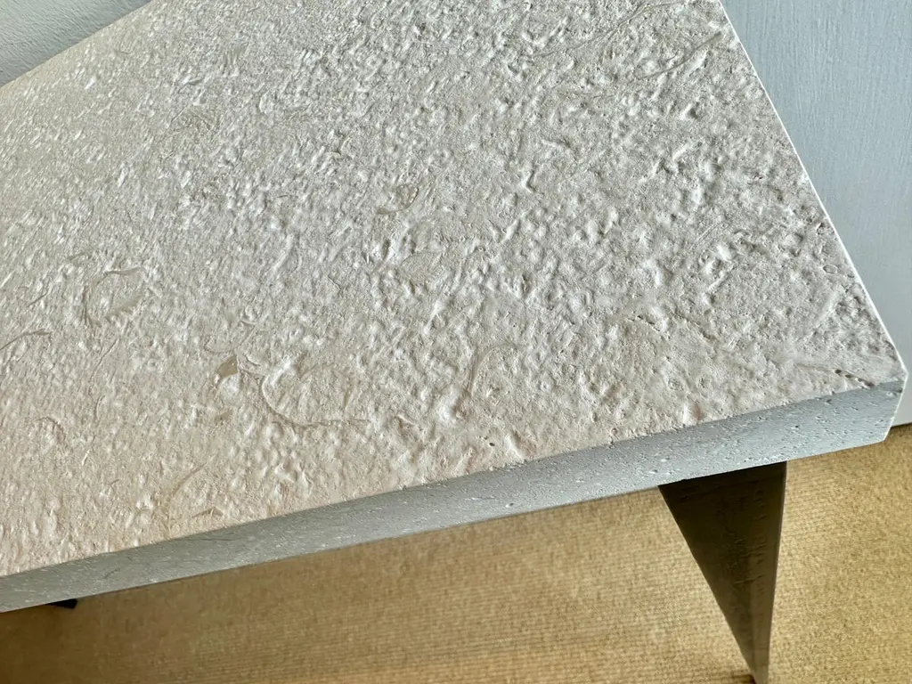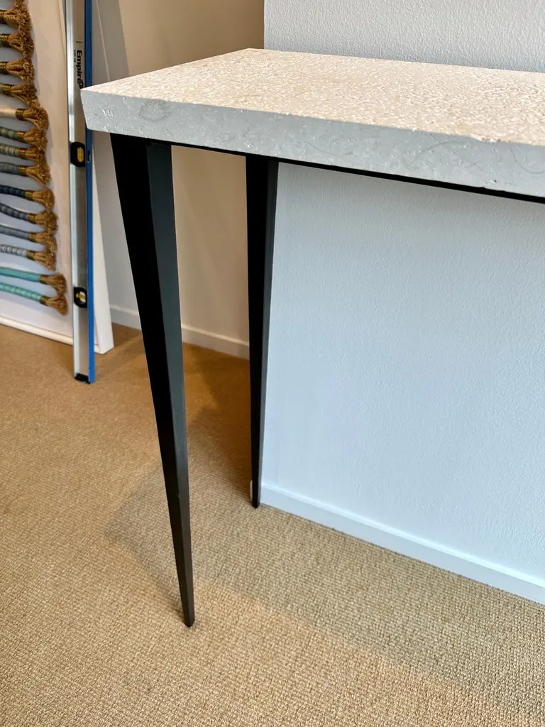 Giacometti style iron console with 1 inch thick natural limestone plateau. Tapering legs and mountable to wall for additional sturdiness. THIS ITEM IS LOCATED AND WILL SHIP FROM OUR EAST HAMPTON, NY SHOWROOM.