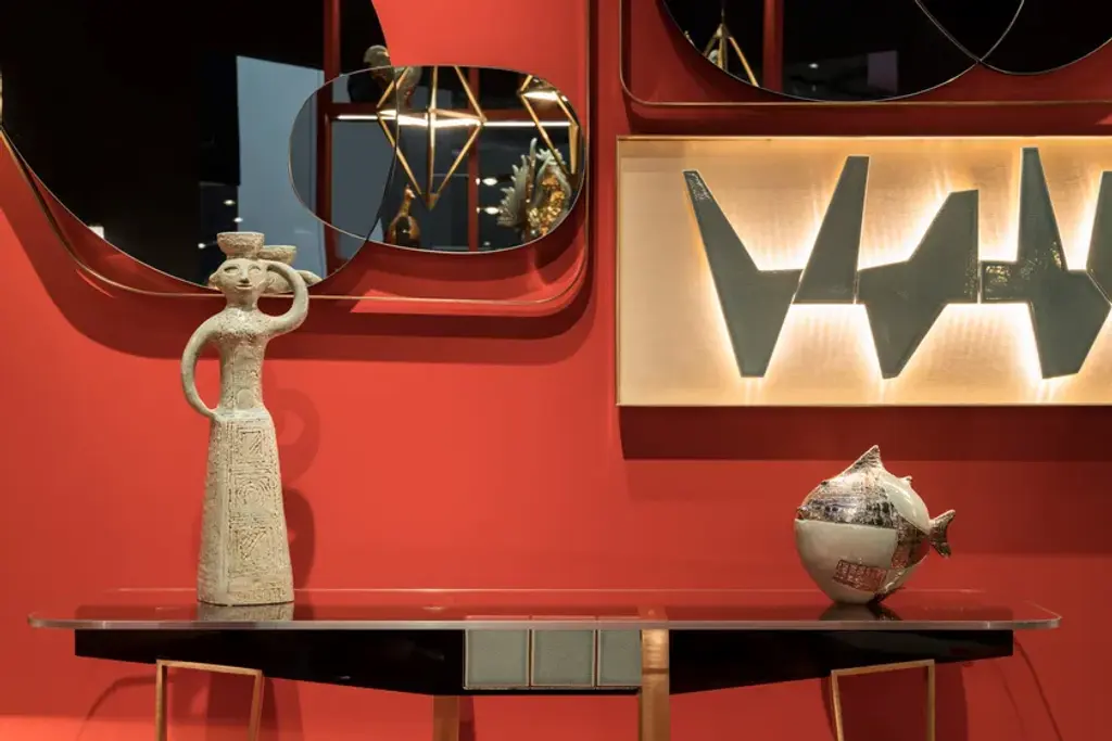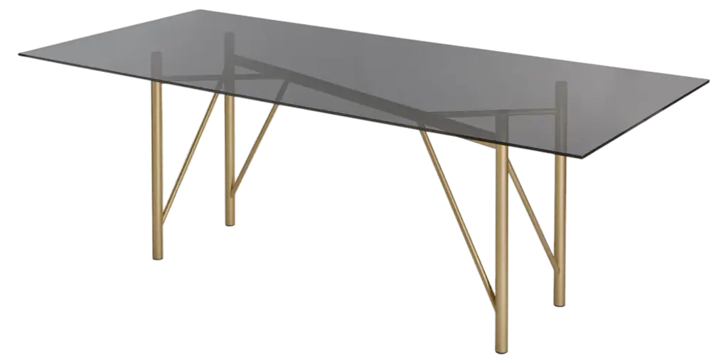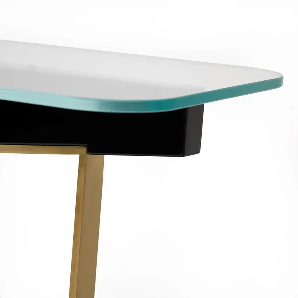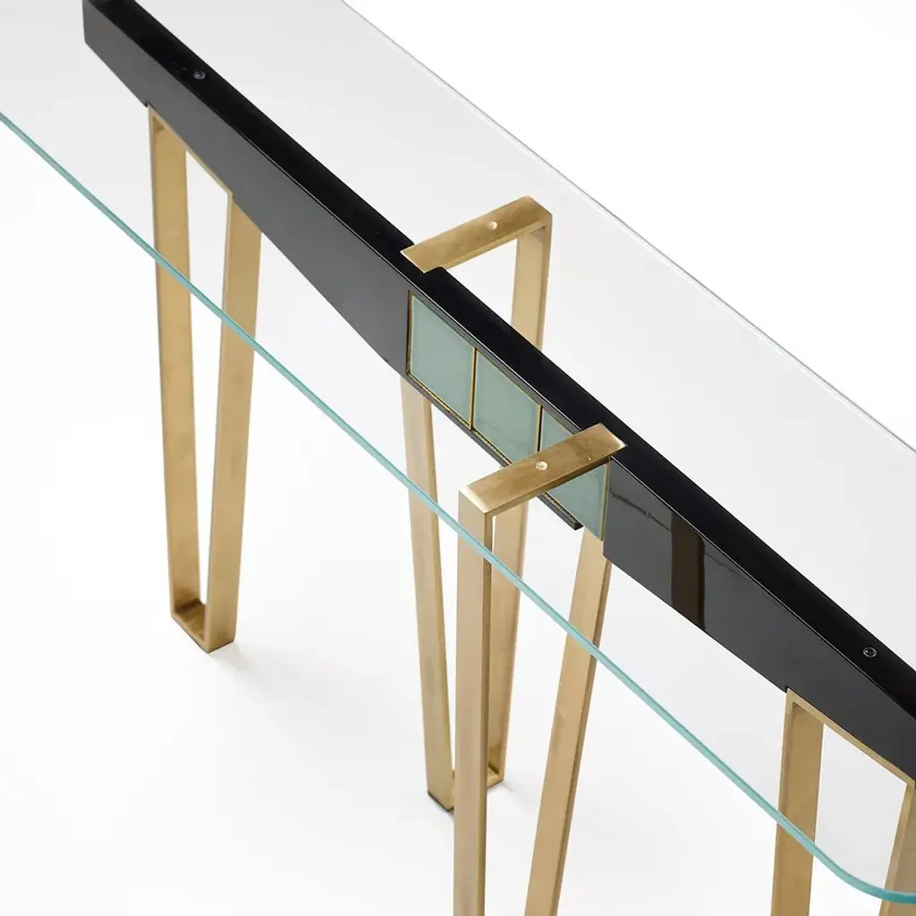 Joe rectangular console table in lacquered wood with ceramic glazed tiles. Brass structure and extra-clear glass top with rounded corners.
