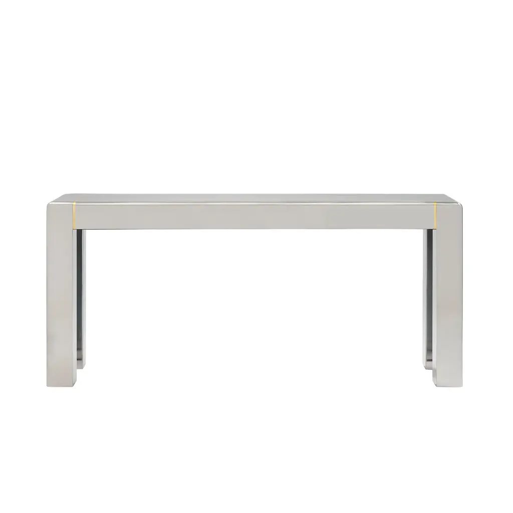 Sleek and modern with a dash of warm brass trim, the stainless steel finish of the Josephine Console Table makes a stunning statement in any space. Pair this table with a dazzling lamp or organic sculpture to instantly pique the interest of your guests as they enter your home.The Josephine collection also includes a cocktail table (sold separately). Ships In 4-5 Weeks Brass trim Polished stainless steel This image is for illustrative purposes only. The colors shown are accurate within the constraints of lighting, photography, and the color accuracy of your screen.