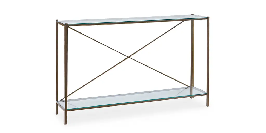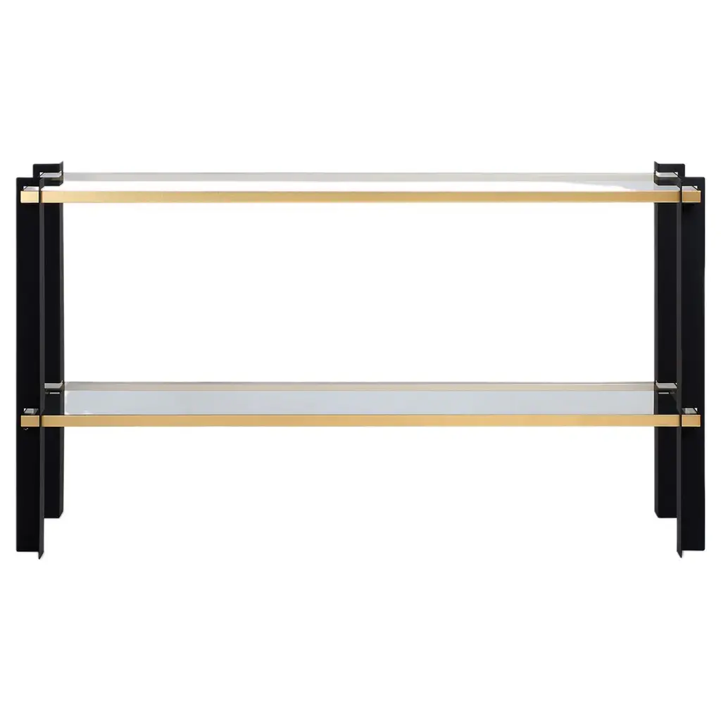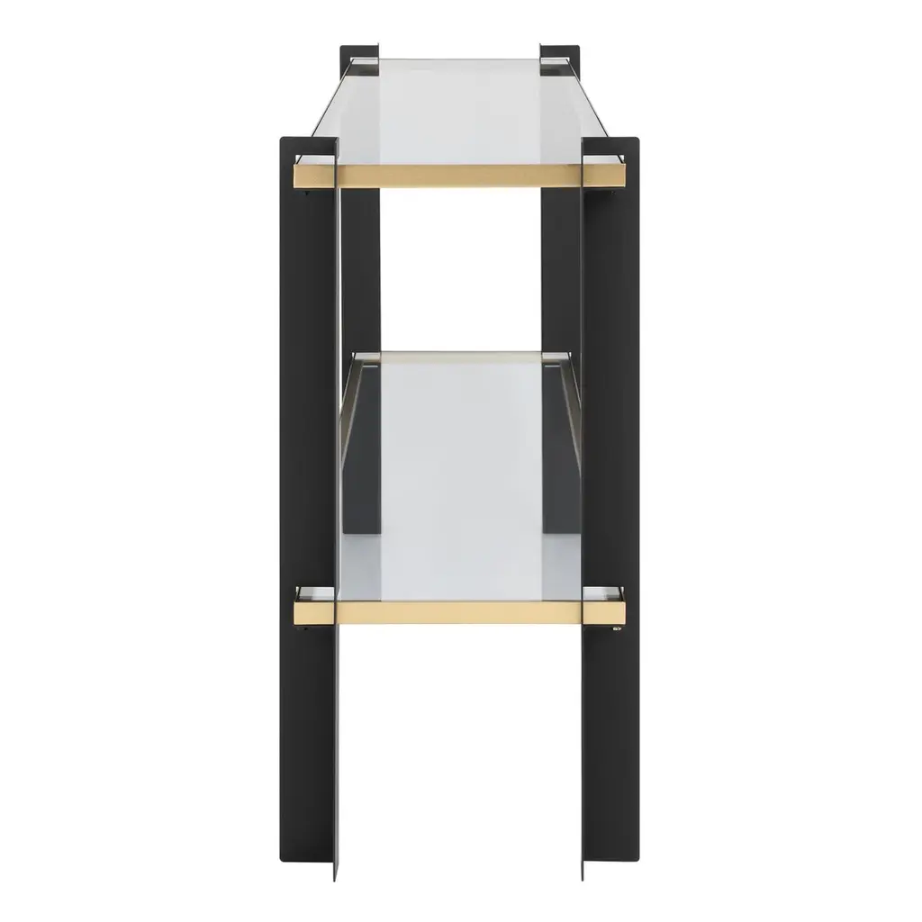 The Julius Console Table is a masterpiece of contemporary design, where elegance meets functionality. Its sleek iron legs, gracefully finished in a harmonious blend of matte black and gold leaf, create a striking silhouette that captivates the eye. The tempered clear glass top and gallery shelf offer not only ample space but also an air of sophistication, allowing your cherished items to be displayed with grace. This console table is more than just a piece of furniture; it's a statement of style and a testament to modern artistry, perfect for those who appreciate the finer things in life.