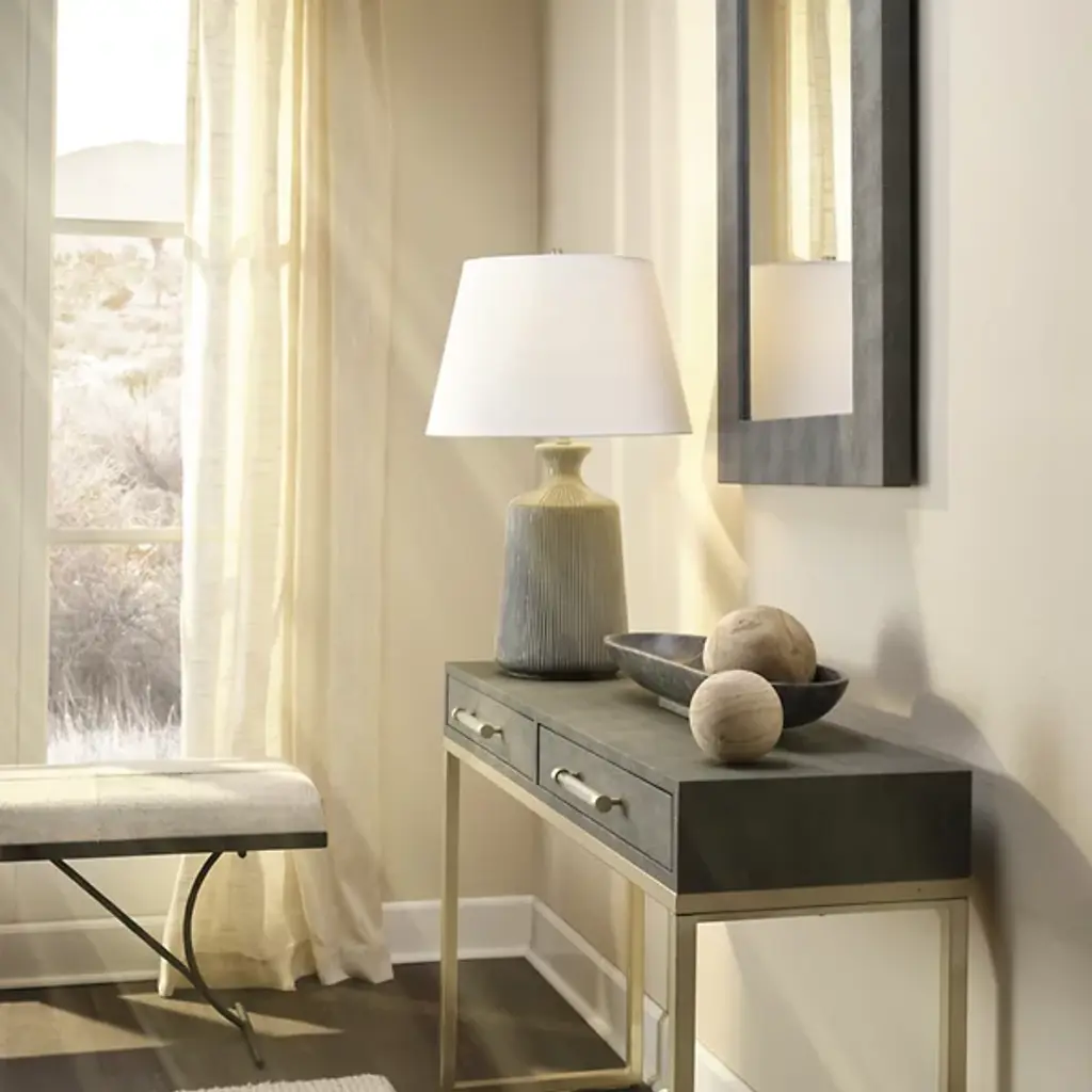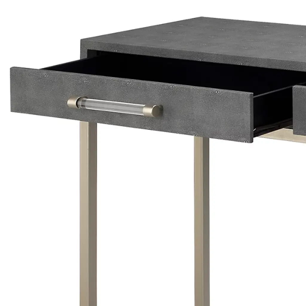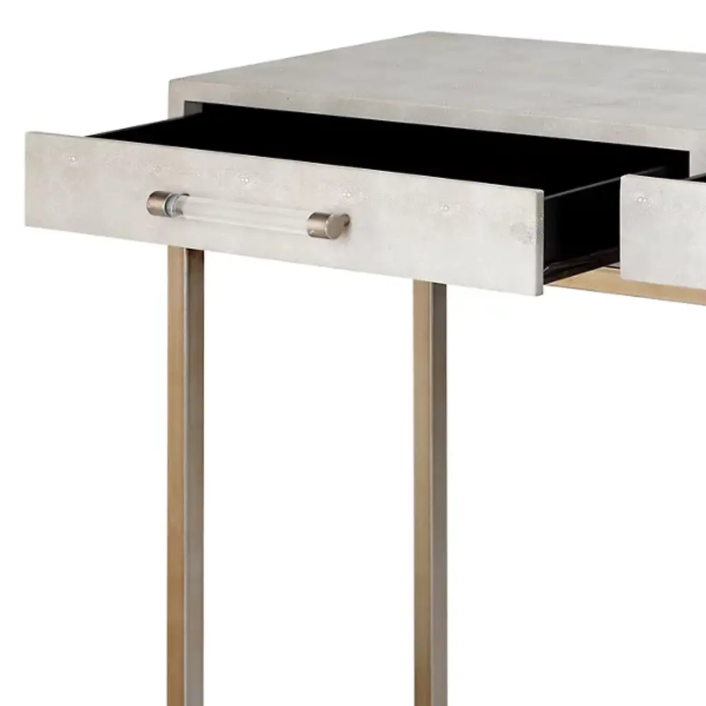 The Kain Console Table from Jamie Young offers a beautiful texture that is at once exotic and modern, taking inspiration from the skin of a stingray or shagreen. Wrapped in ivory faux shagreen and mounted on a beautifully finished base, this console table features a straightforward look that will blend in with a variety of decor settings.