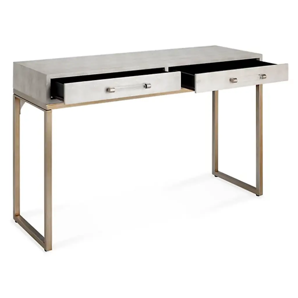 The Kain Console Table from Jamie Young offers a beautiful texture that is at once exotic and modern, taking inspiration from the skin of a stingray or shagreen. Wrapped in ivory faux shagreen and mounted on a beautifully finished base, this console table features a straightforward look that will blend in with a variety of decor settings.