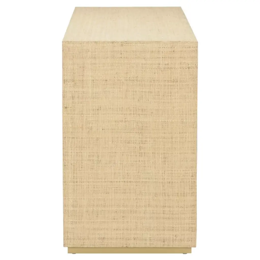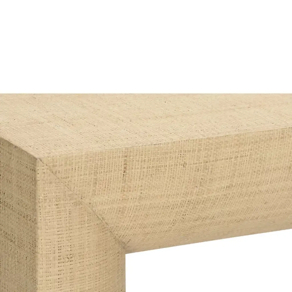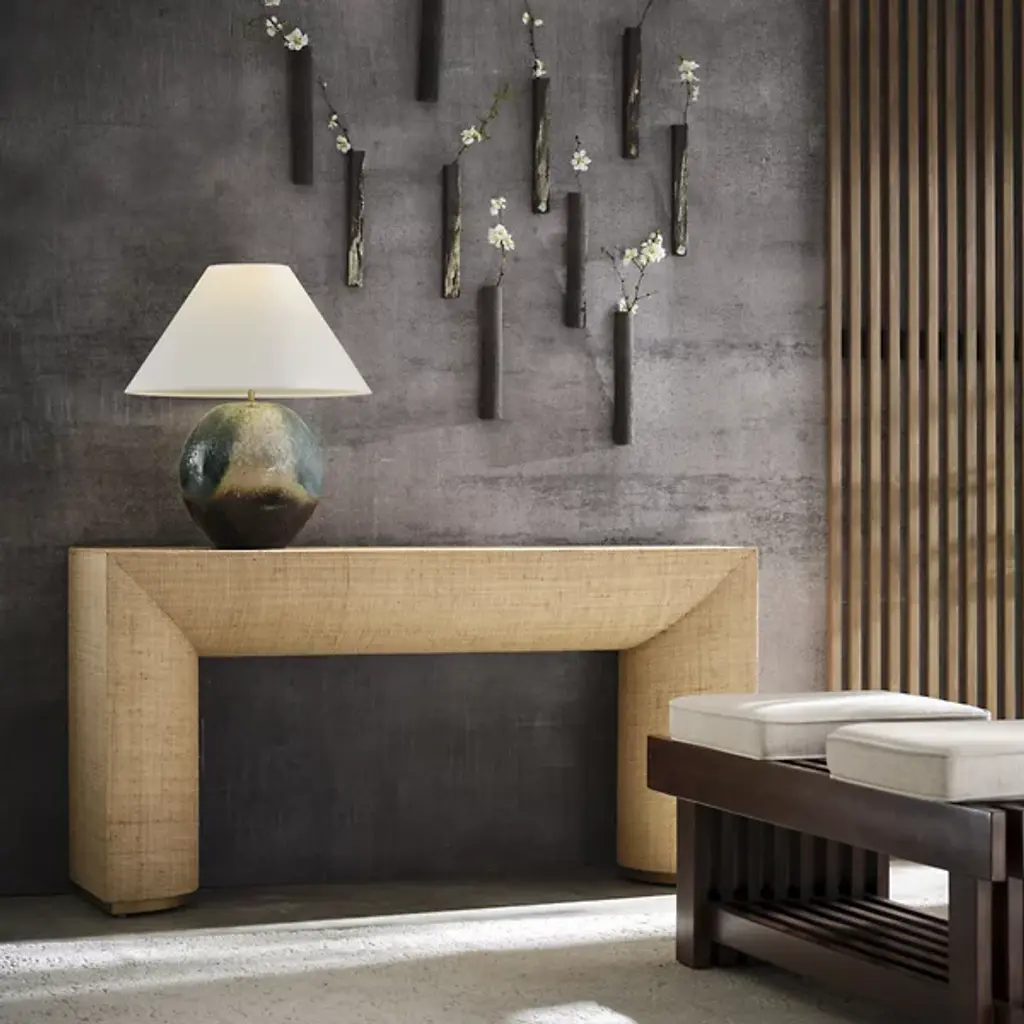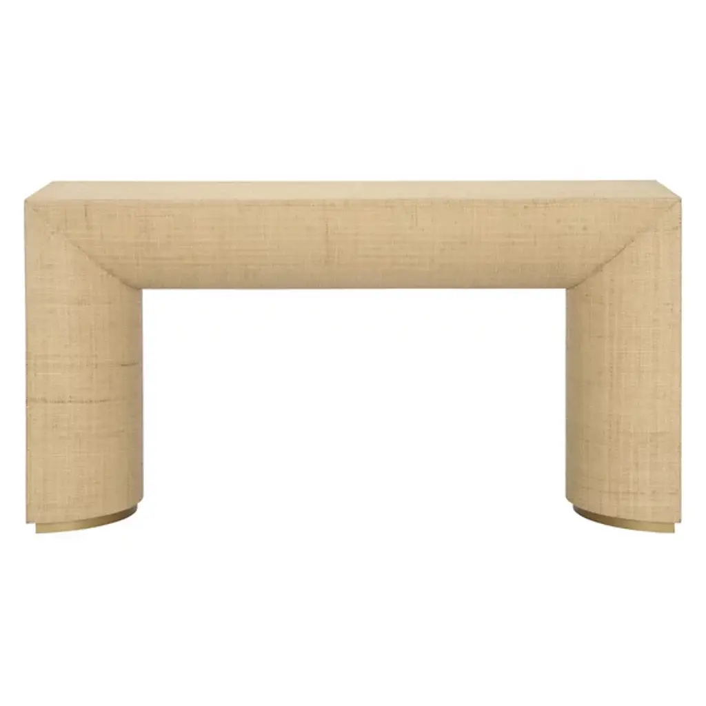 The Kamo Console Table from Wildwood departs from rigid parsons table geometry through half-rounded legs that flow into the tabletop structure. Natural raffia covering brings grasscloth-like texture to every surface, while the brass base provides metallic grounding that prevents the piece from appearing too casual. The semi-rounded leg treatment softens the table’s profile while the substantial top surface offers a generous display area. This console bridges rustic and refined sensibilities through its material pairing, demonstrating how natural fibers can achieve sophistication when combined with quality metalwork.