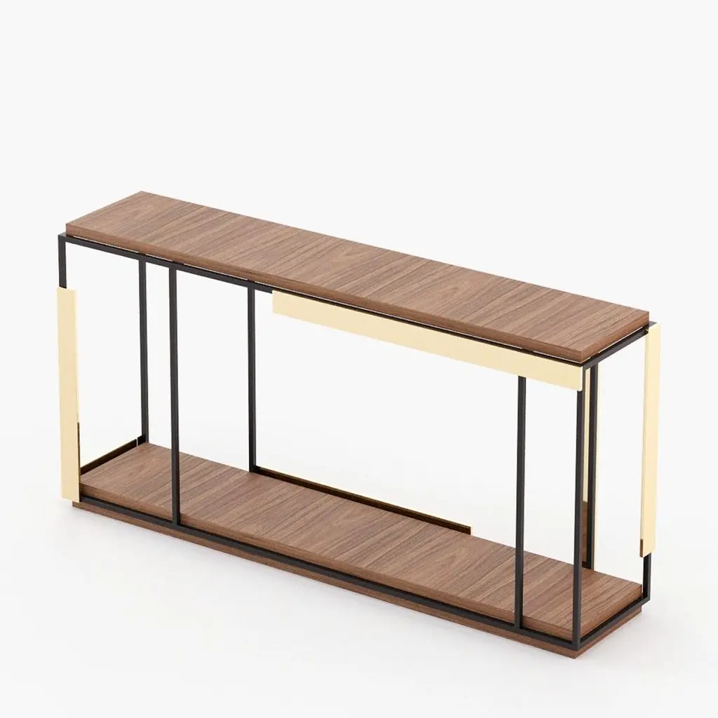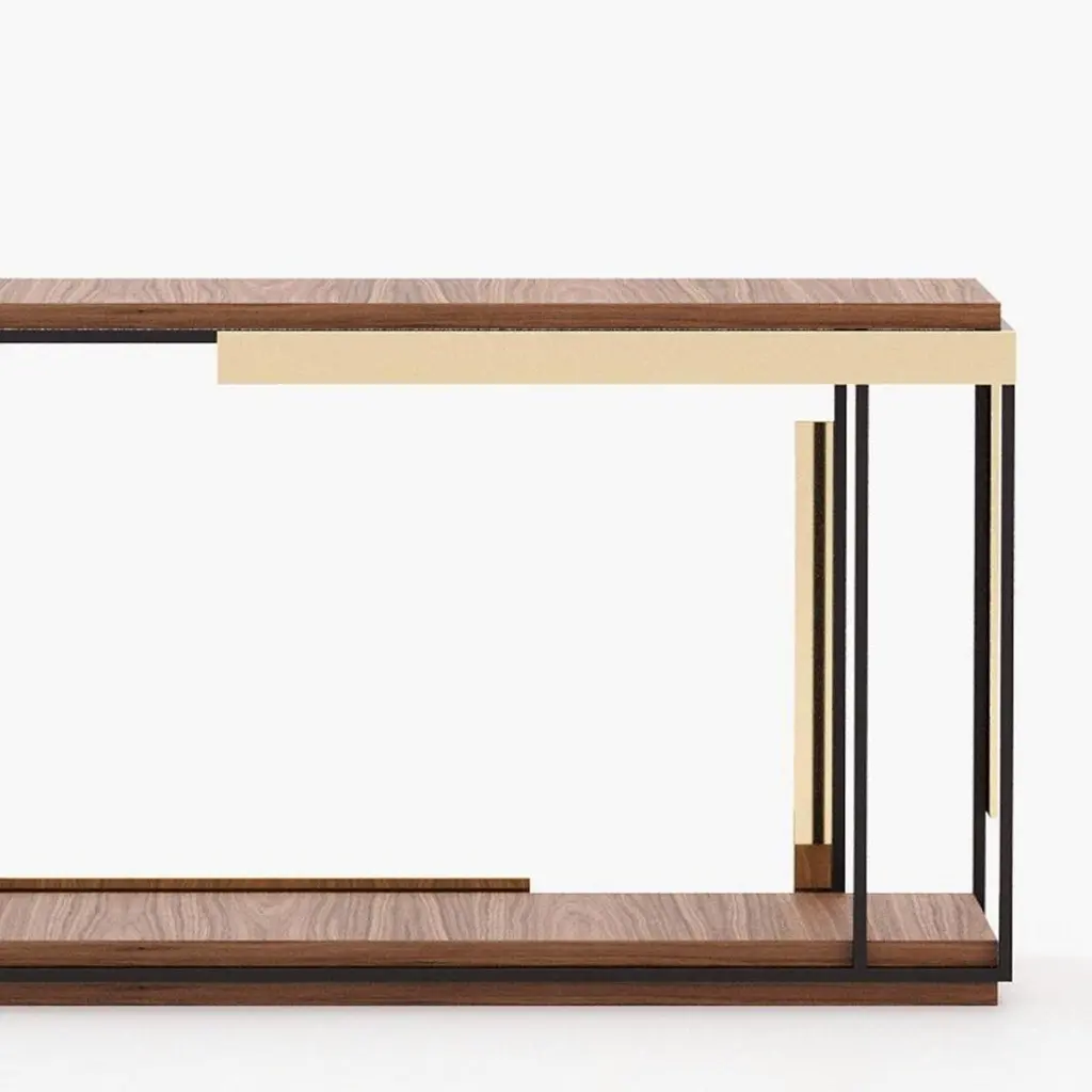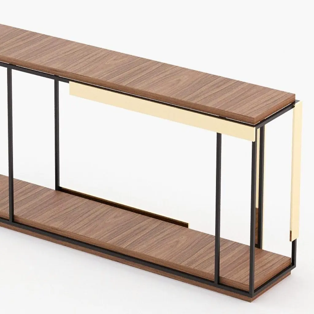 Console Table Kanta Walnut with stainless steel structurein black matte finish and with up and down wooden topin walnut veneer in natural finish. With polished stainlesssteel details in gold finish.Also available on request in grey oak matte, or natural oak, or ebony matte veneer finishes.Also available on request with other stainless steel finishes.