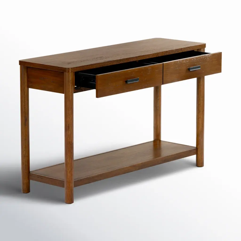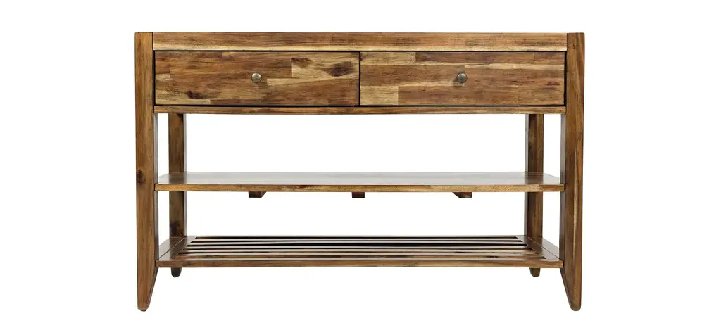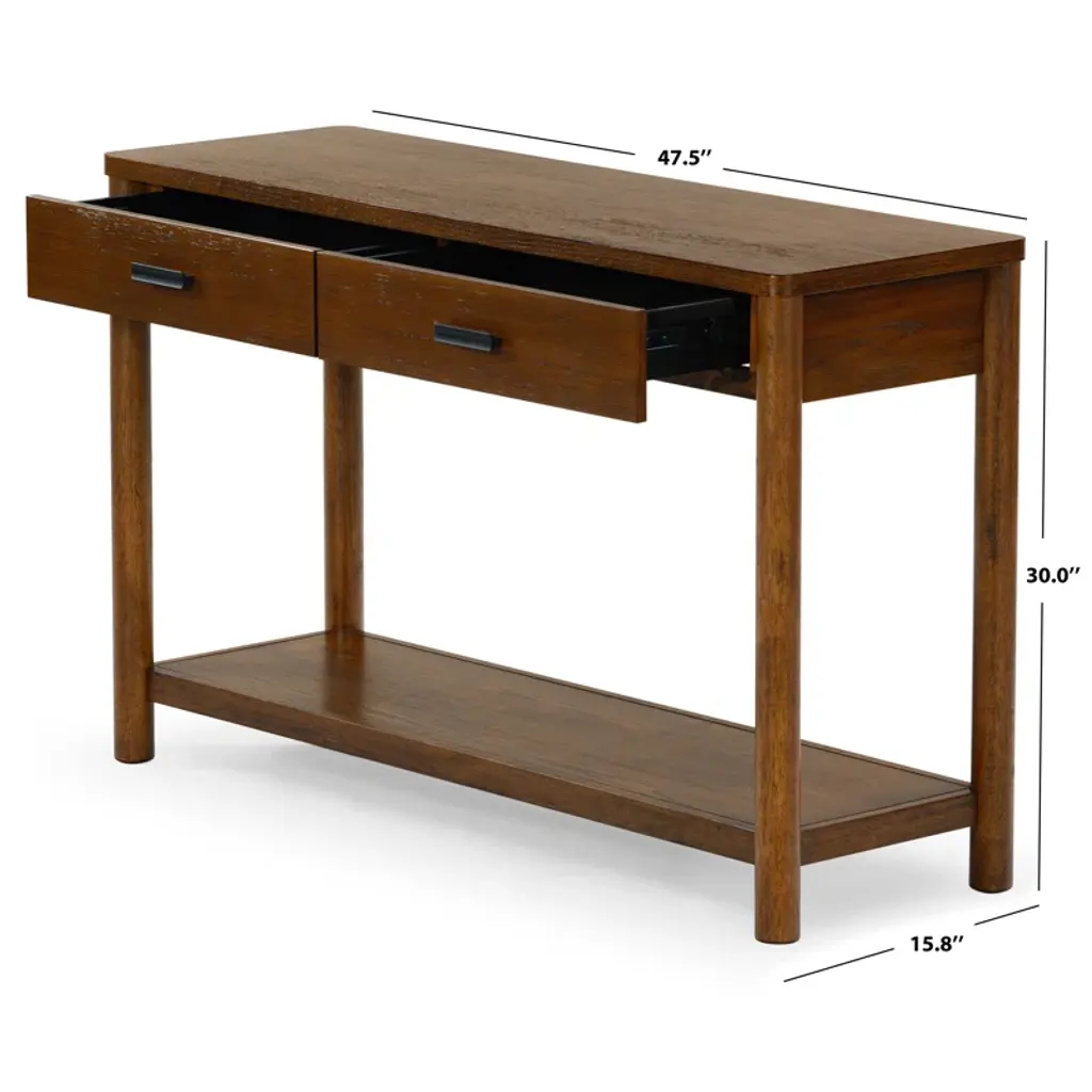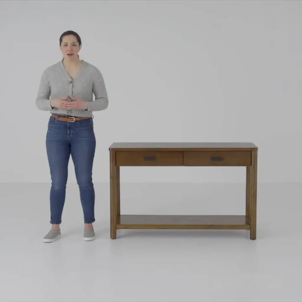 Update your space with this sleek console table. Made from wood, the rectangular top features natural wood grain variations for a warm touch. Two drawers and a spacious open shelf offer plenty of storage and display space. Smooth ball-bearing drawer glides and a finished back provide functionality and style. For peace of mind, anti-tip hardware is included. Complete the look with other pieces from the collection.