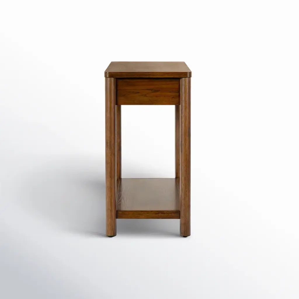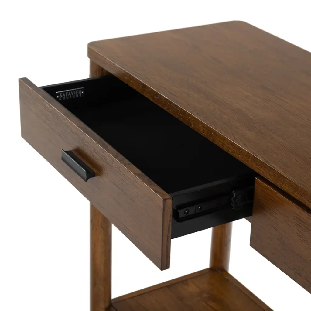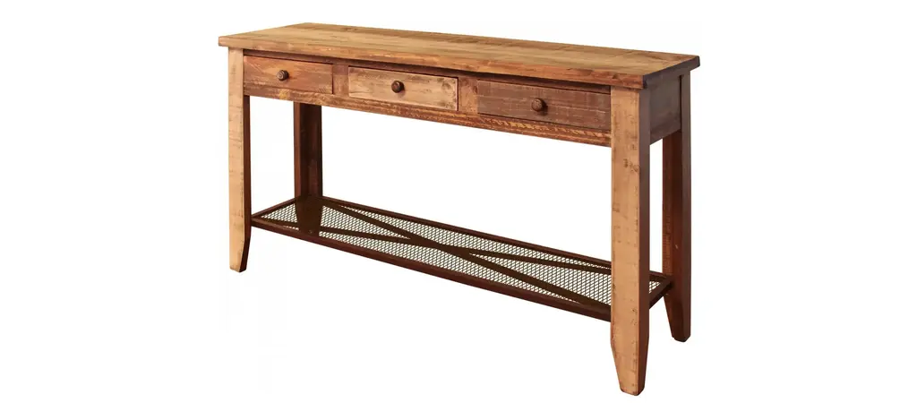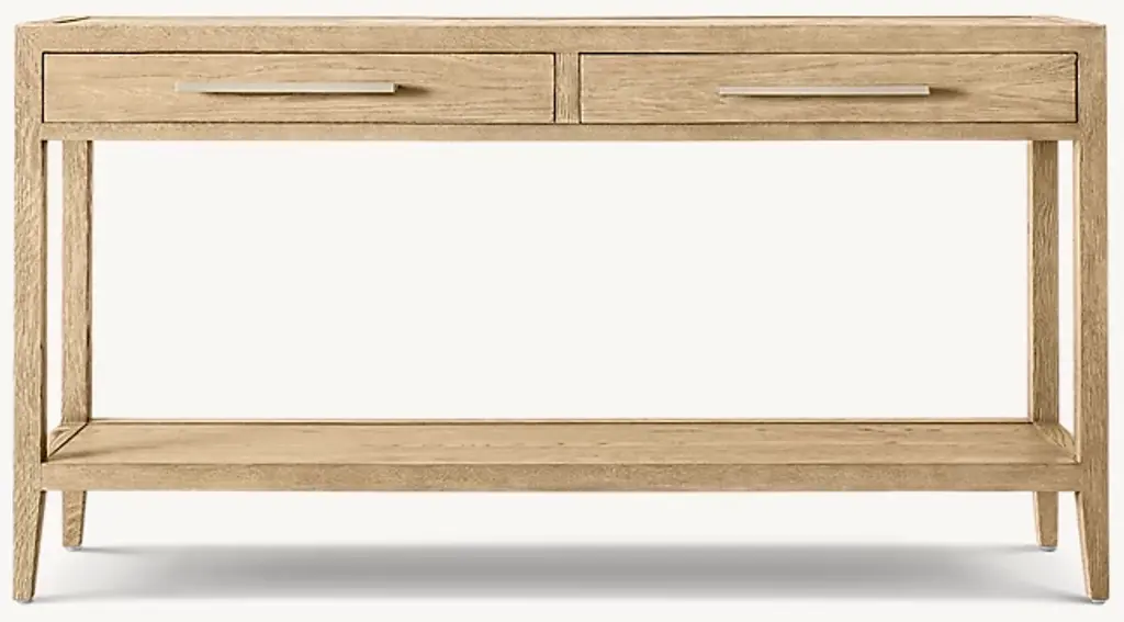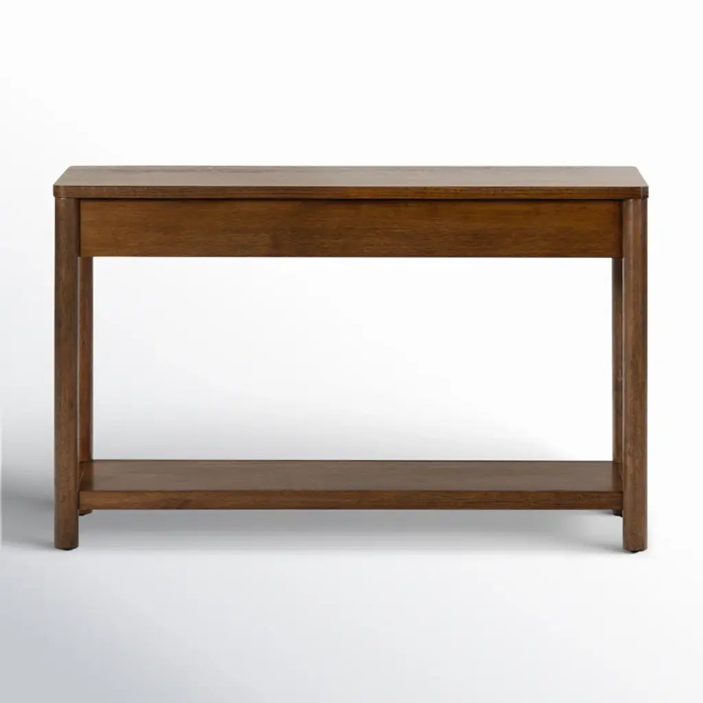Update your space with this sleek console table. Made from wood, the rectangular top features natural wood grain variations for a warm touch. Two drawers and a spacious open shelf offer plenty of storage and display space. Smooth ball-bearing drawer glides and a finished back provide functionality and style. For peace of mind, anti-tip hardware is included. Complete the look with other pieces from the collection.