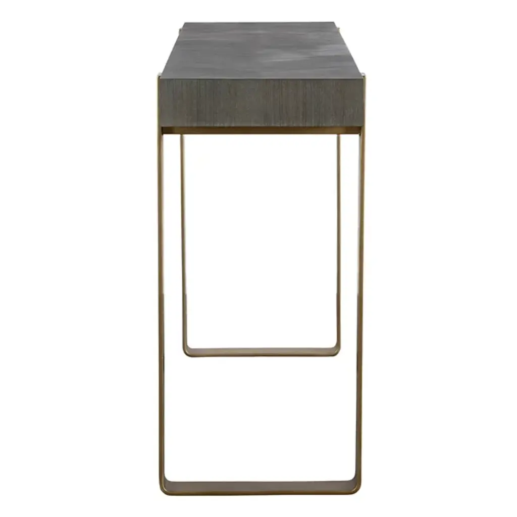 The Kea Console Table from Uttermost combines contemporary flair with Mid-Century Modern vibes. Designed by Revelation Design, it's a friendly invitation to elevate your home decor with a touch of timeless elegance and retro allure. Its standout feature is the diamond ash veneer top, finished in a rich dark walnut stain with subtle light gray glazing supported by iron strap-style legs in a warm brushed brass finish. This console table exudes a perfect blend of sophistication and vintage charm.