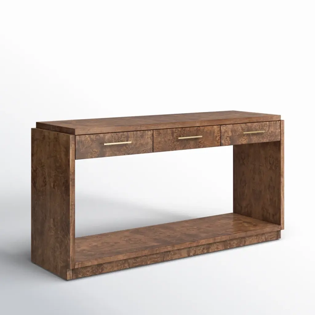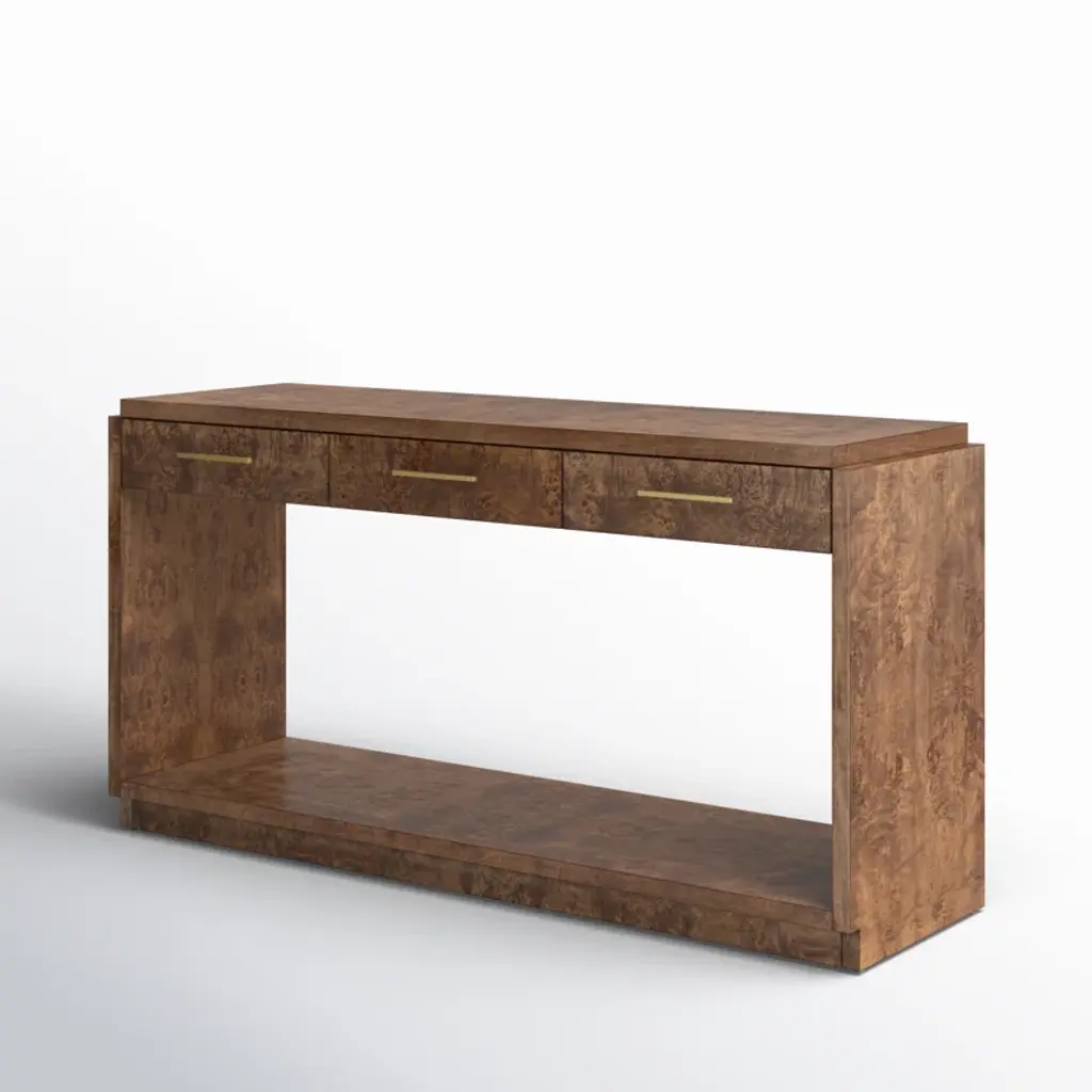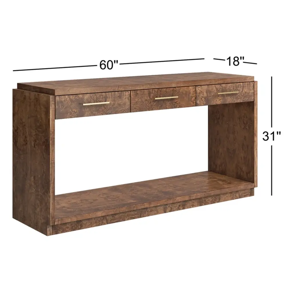The Kingston 60" Console Table seamlessly blends classic charm with modern functionality, making it an essential addition to your home. Crafted from solid and engineered wood, this storage furniture features a warm light or dark brown finish that highlights the natural wood grain and burl wood knots, offering a touch of vibrant elegance. The table includes a rectangular top for showcasing decor and lamps, a spacious lower shelf for baskets or bins, and three drawers with metal glides for easy organization. Designed for durability, our bedroom console table boasts a finished back and tipping prevention for added safety. With its stylish design and ample storage, this wood console table is perfect for entryways, living rooms, or hallways.