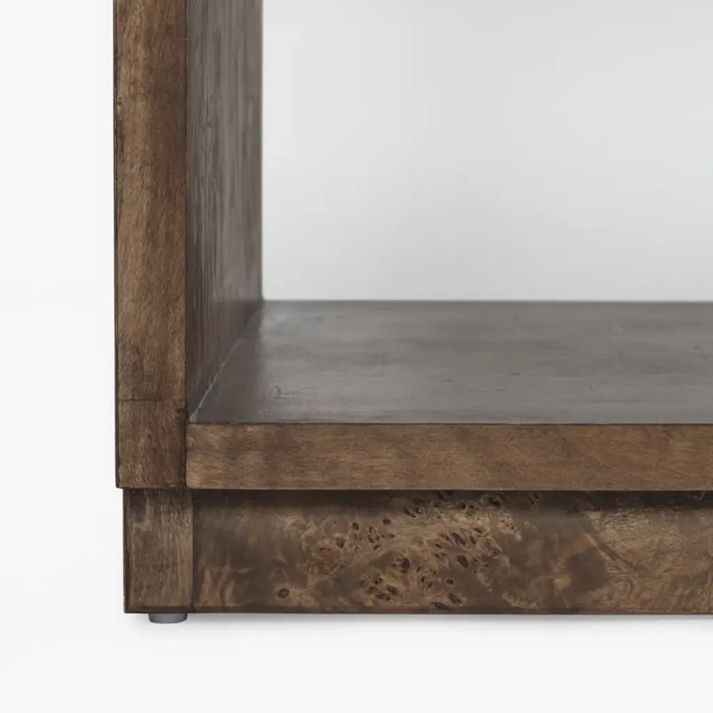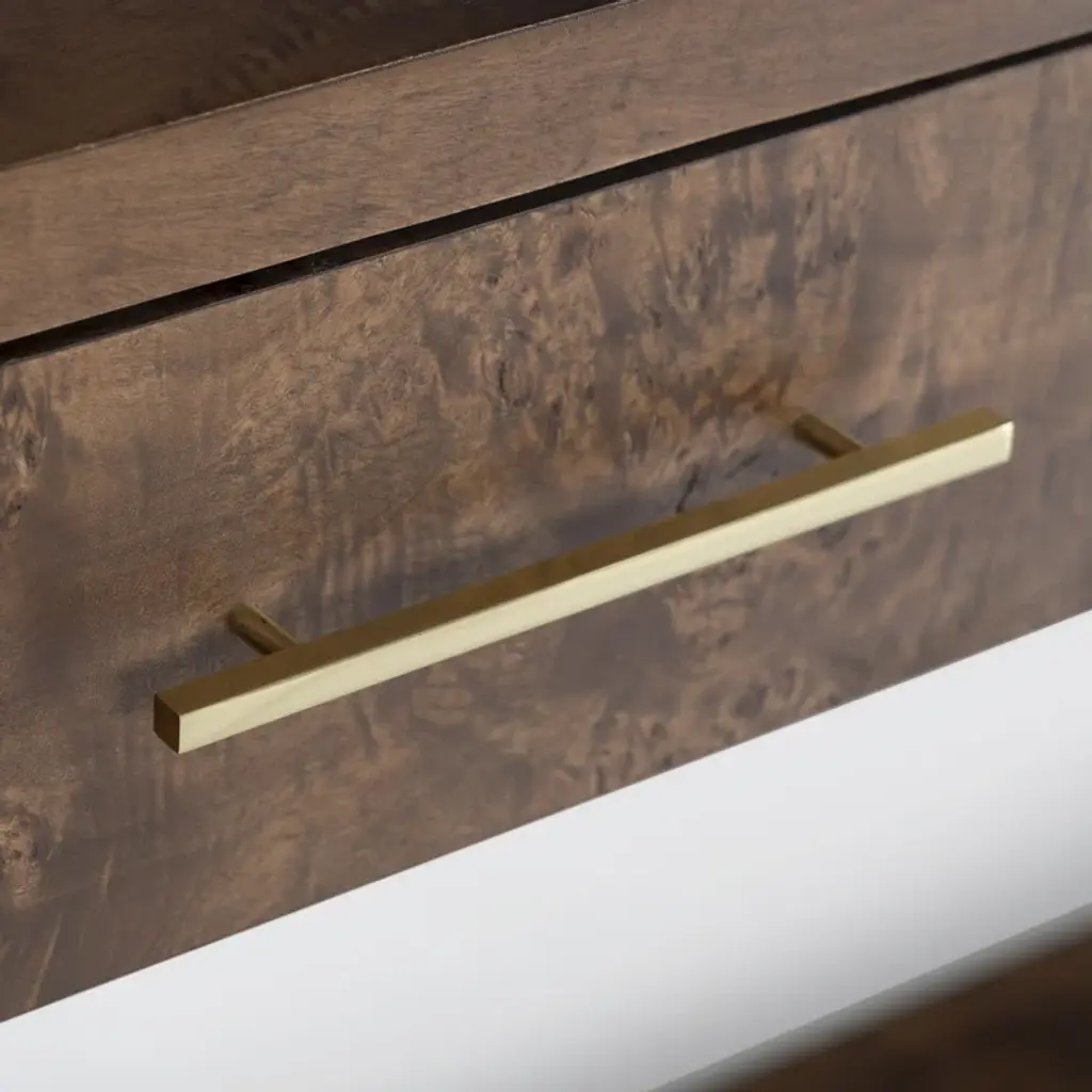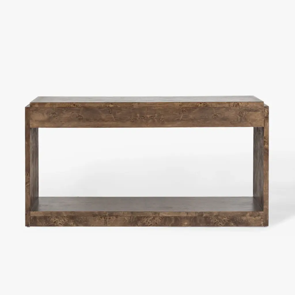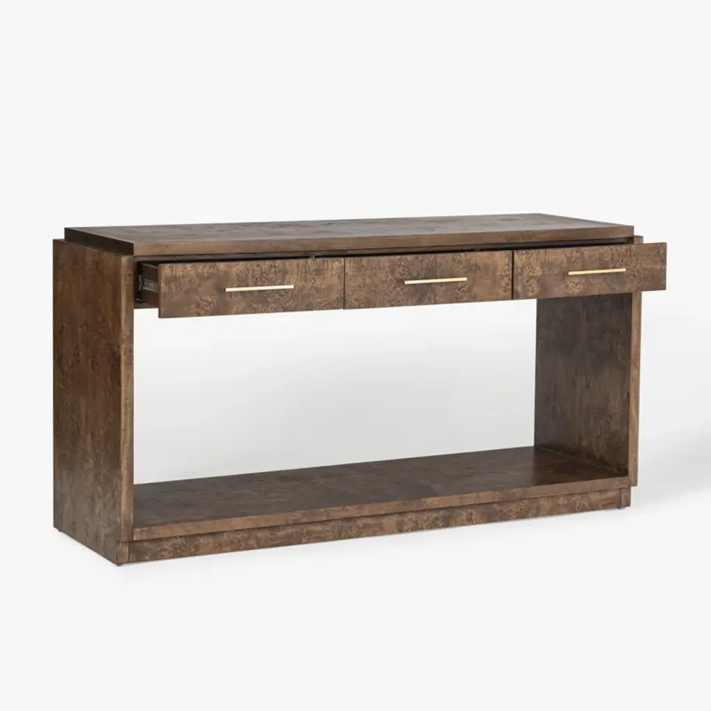 The Kingston 60" Console Table seamlessly blends classic charm with modern functionality, making it an essential addition to your home. Crafted from solid and engineered wood, this storage furniture features a warm light or dark brown finish that highlights the natural wood grain and burl wood knots, offering a touch of vibrant elegance. The table includes a rectangular top for showcasing decor and lamps, a spacious lower shelf for baskets or bins, and three drawers with metal glides for easy organization. Designed for durability, our bedroom console table boasts a finished back and tipping prevention for added safety. With its stylish design and ample storage, this wood console table is perfect for entryways, living rooms, or hallways.