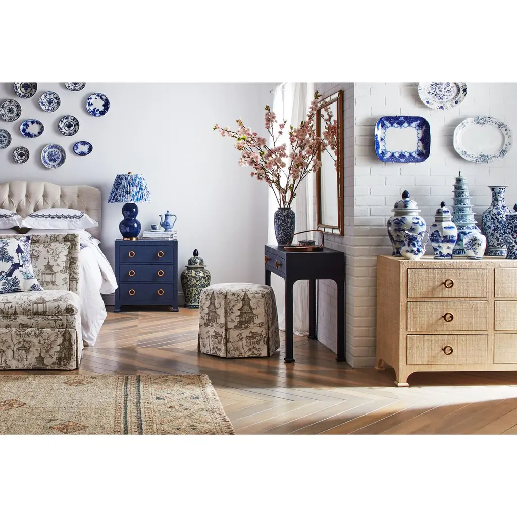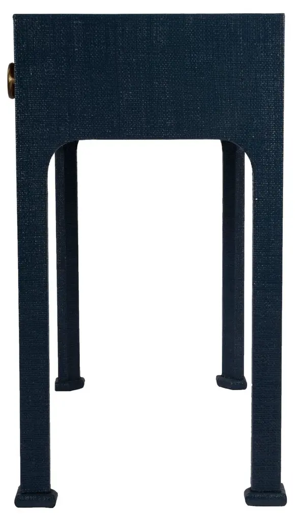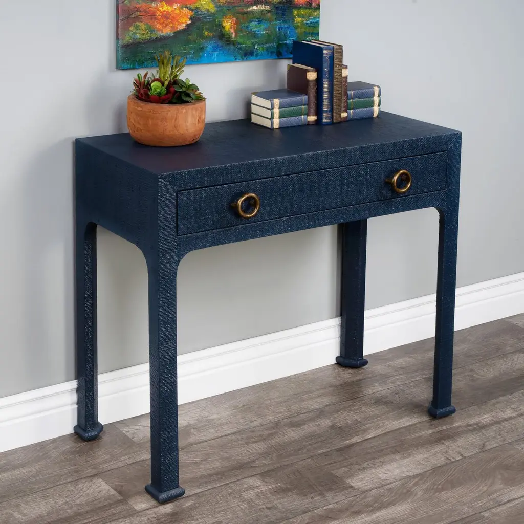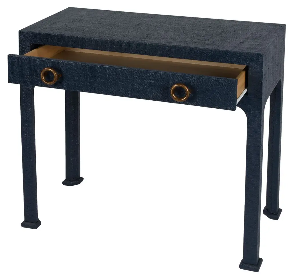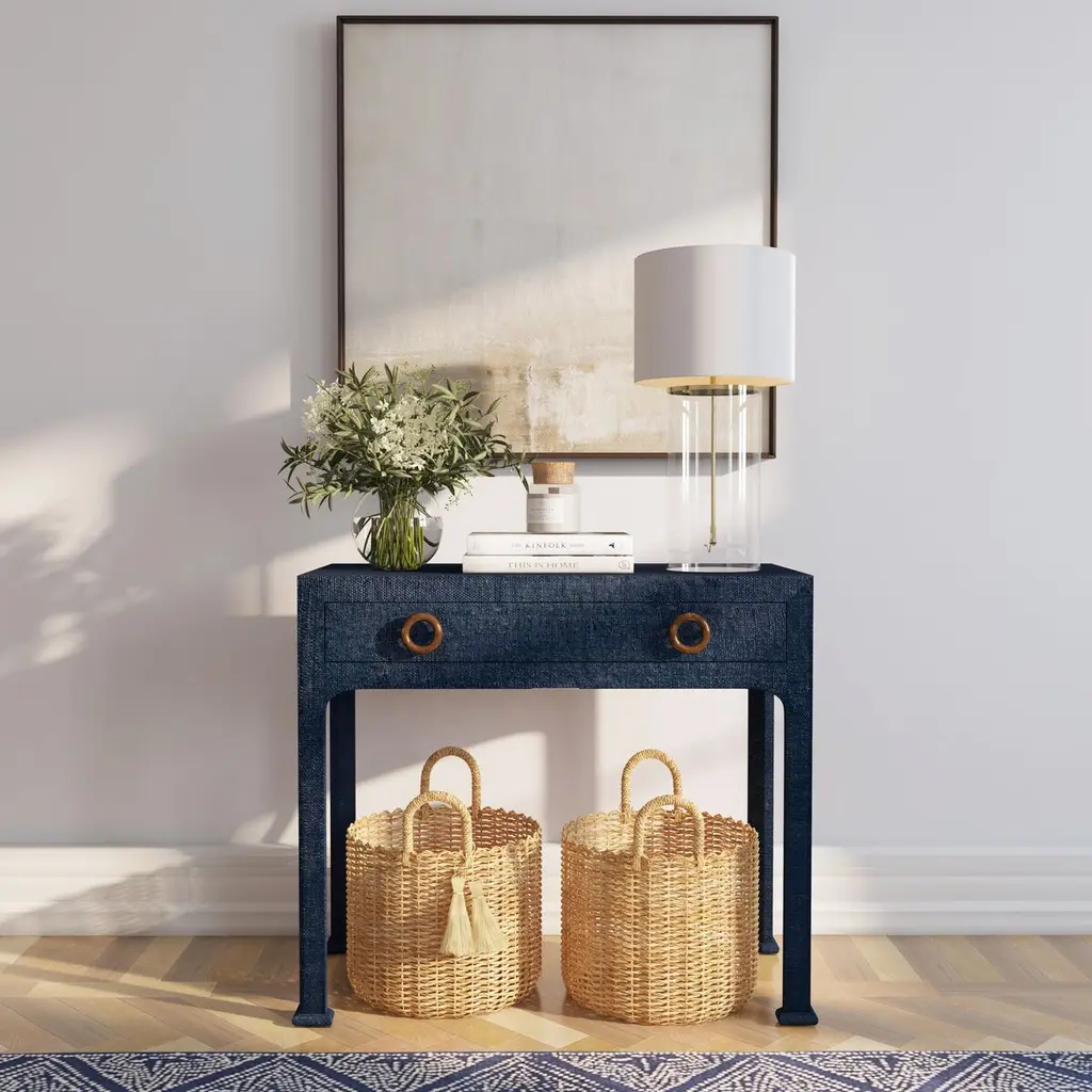 Designed by us and available only at One Kings Lane: Covered in woven raffia for a look of organic elegance, this console includes a drawer for always-appreciated storage. The brass finish of the drawer pulls adds just the right touch of glimmer.