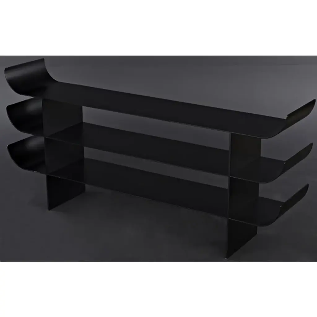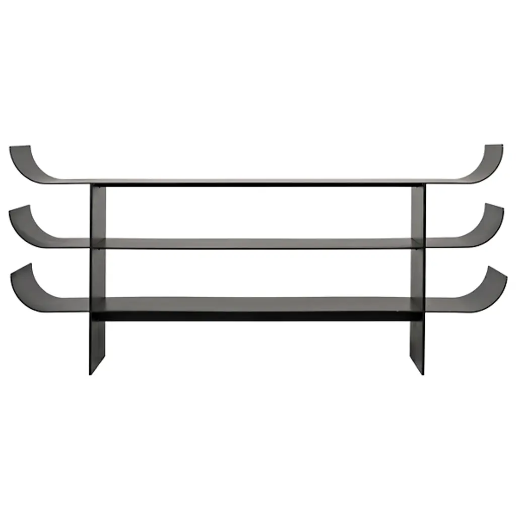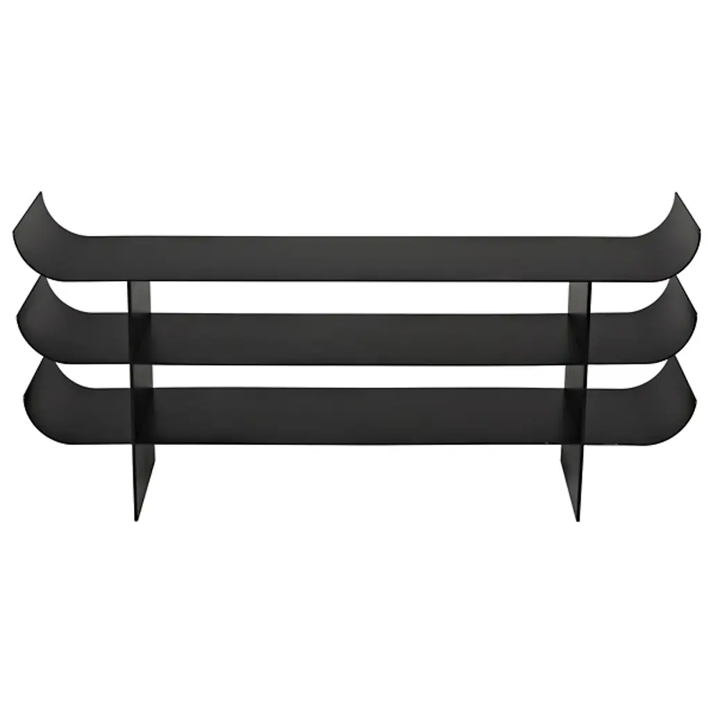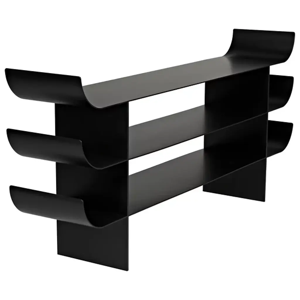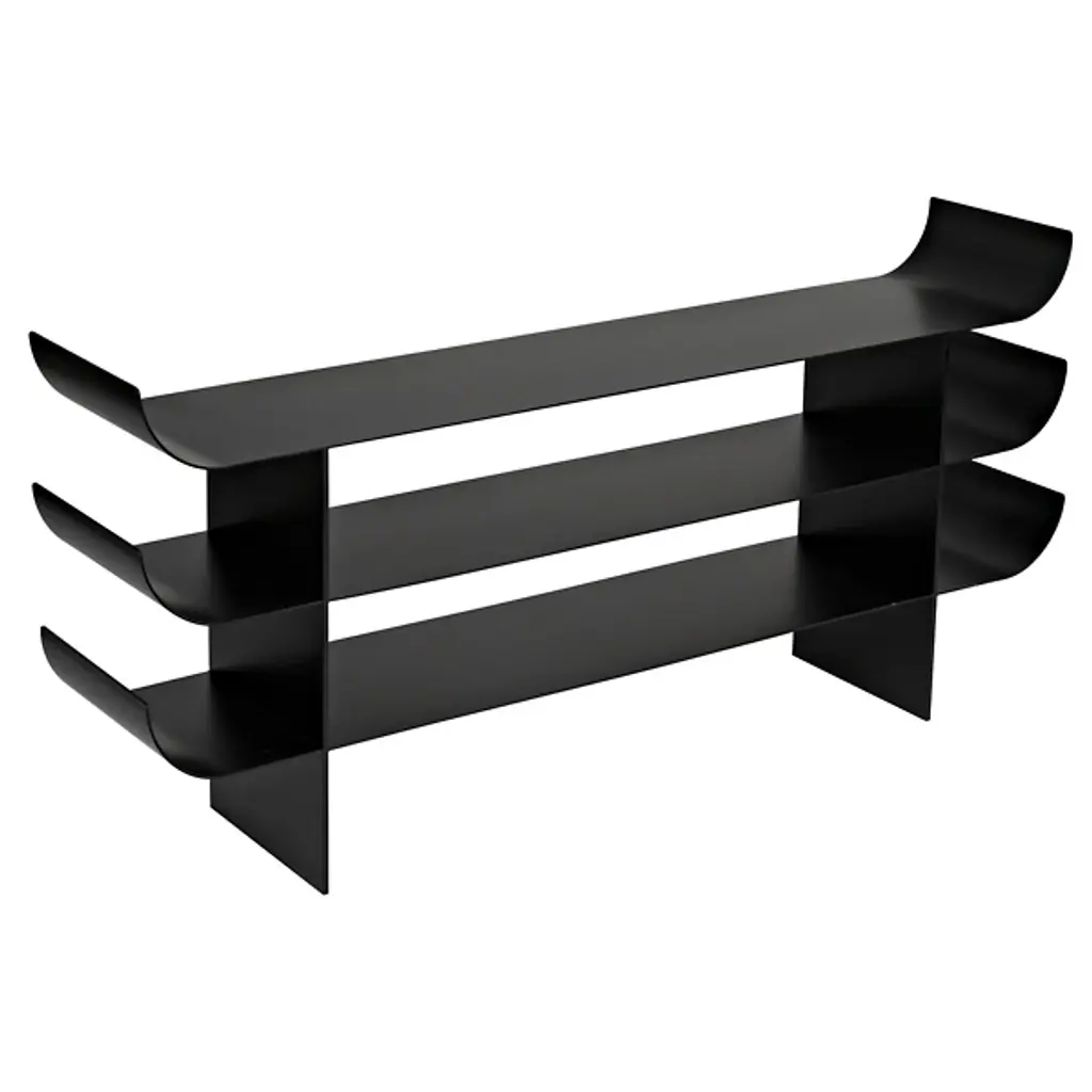 Smooth and simple, the Kyoto Console Table from Noir adds elegant architectural refinement to interiors, drawing on traditional Japanese architecture for inspiration. A welded, three-tier industrial steel construction uses two vertical bars to support the horizontal shelves that curl up at the ends like the curved peaks of Japanese roofs, creating more coverage while allowing sunlight in. This formation adds welcome detail to an otherwise conventional structure, providing plenty of space for curios, books, and other accessories while keeping them on full display.