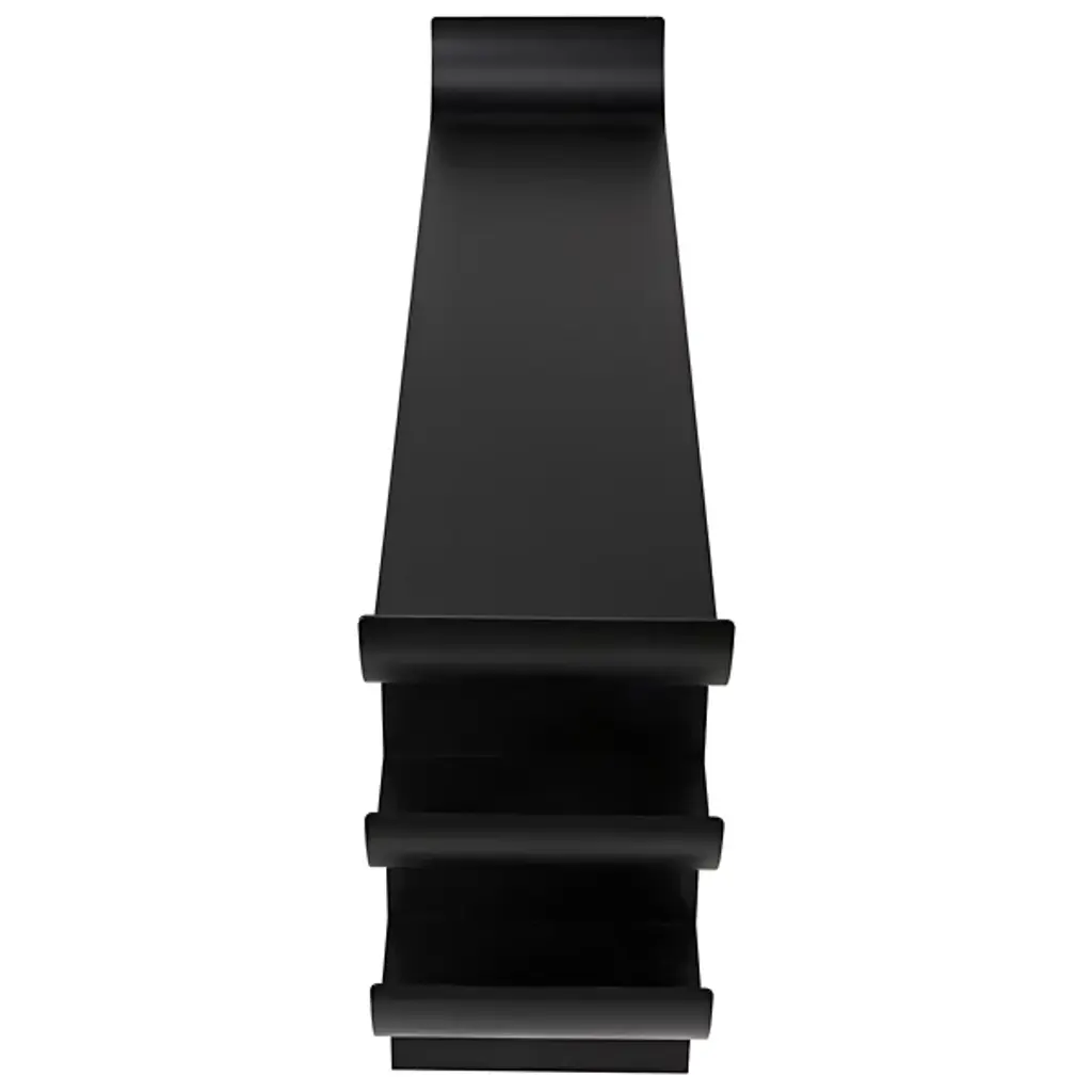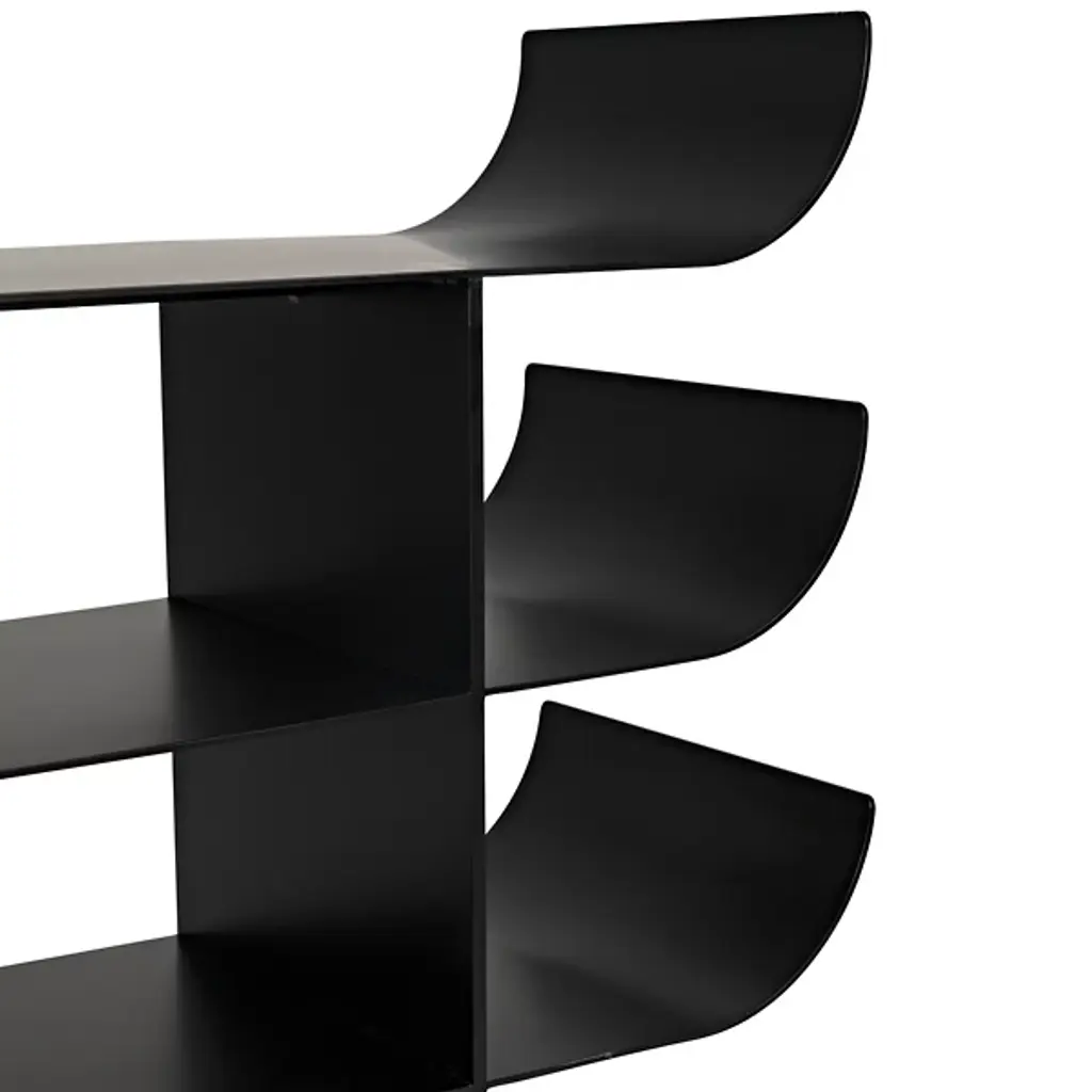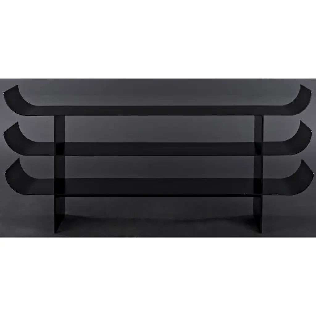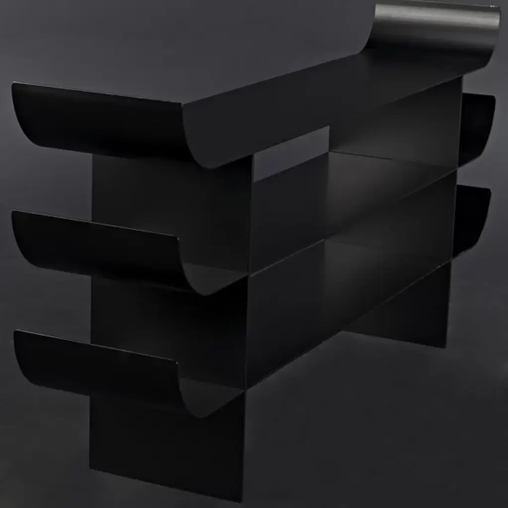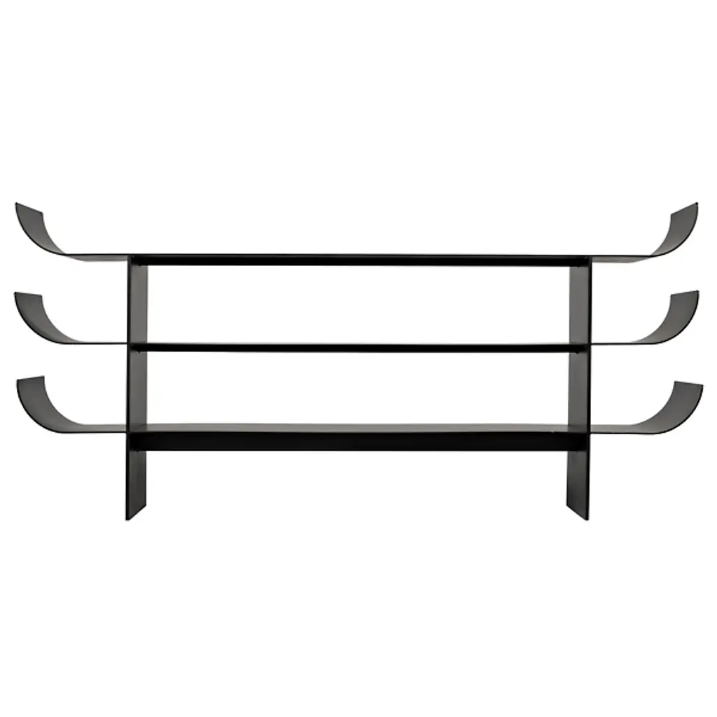 Smooth and simple, the Kyoto Console Table from Noir adds elegant architectural refinement to interiors, drawing on traditional Japanese architecture for inspiration. A welded, three-tier industrial steel construction uses two vertical bars to support the horizontal shelves that curl up at the ends like the curved peaks of Japanese roofs, creating more coverage while allowing sunlight in. This formation adds welcome detail to an otherwise conventional structure, providing plenty of space for curios, books, and other accessories while keeping them on full display.
