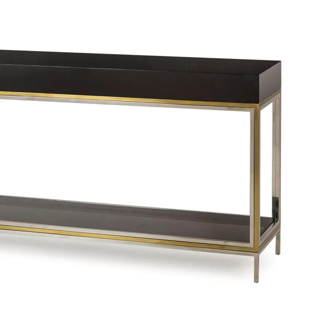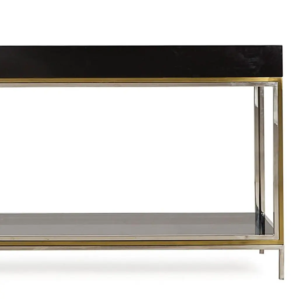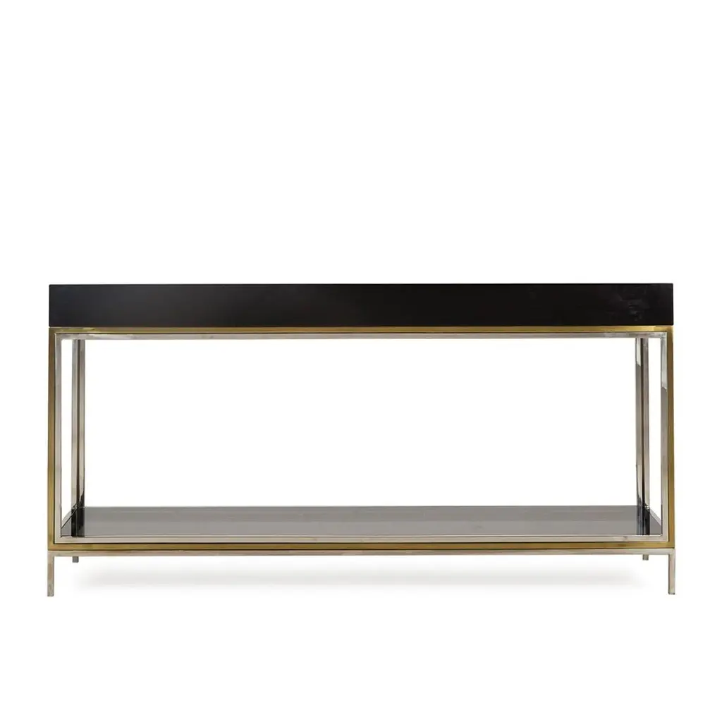 Console table lacquered black with structurein MDF black lacquered finish, with smoked glasstop and with frame in stainless steel in brass satinated finish.