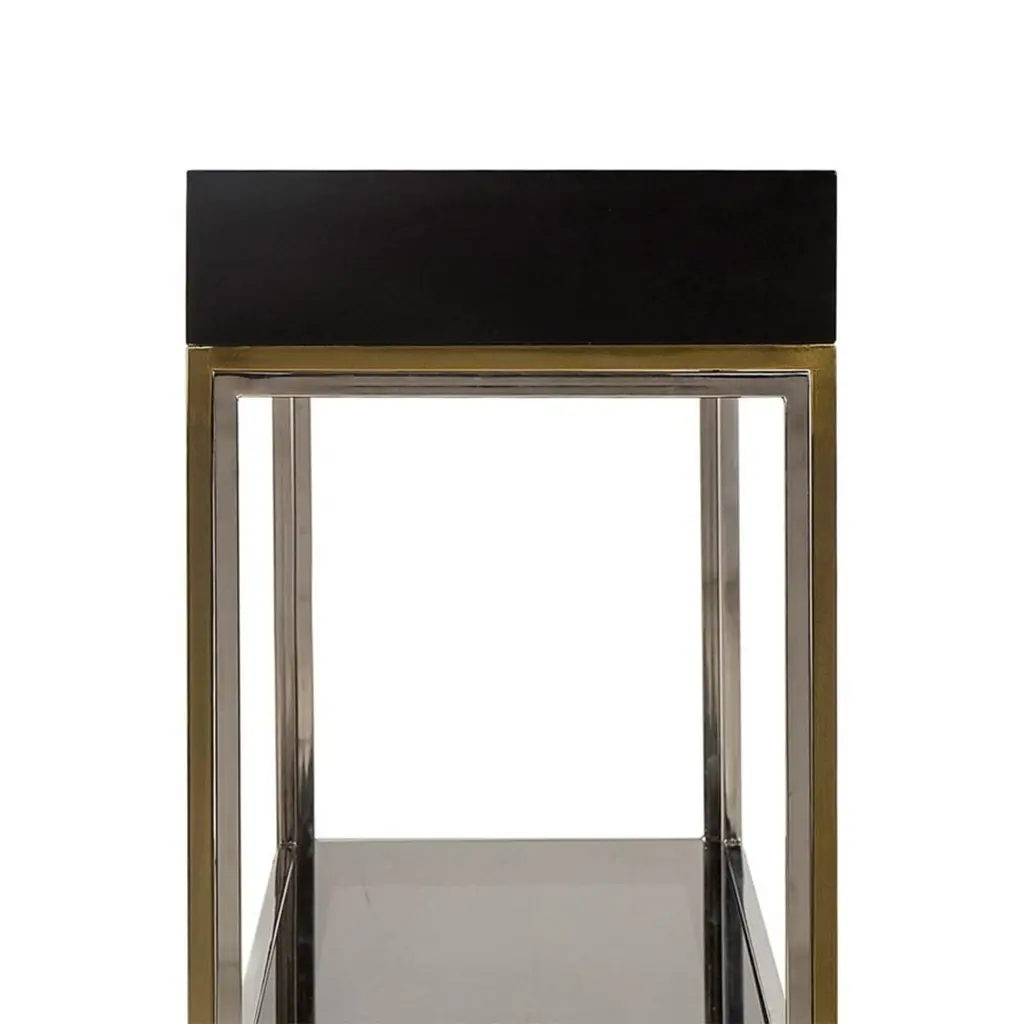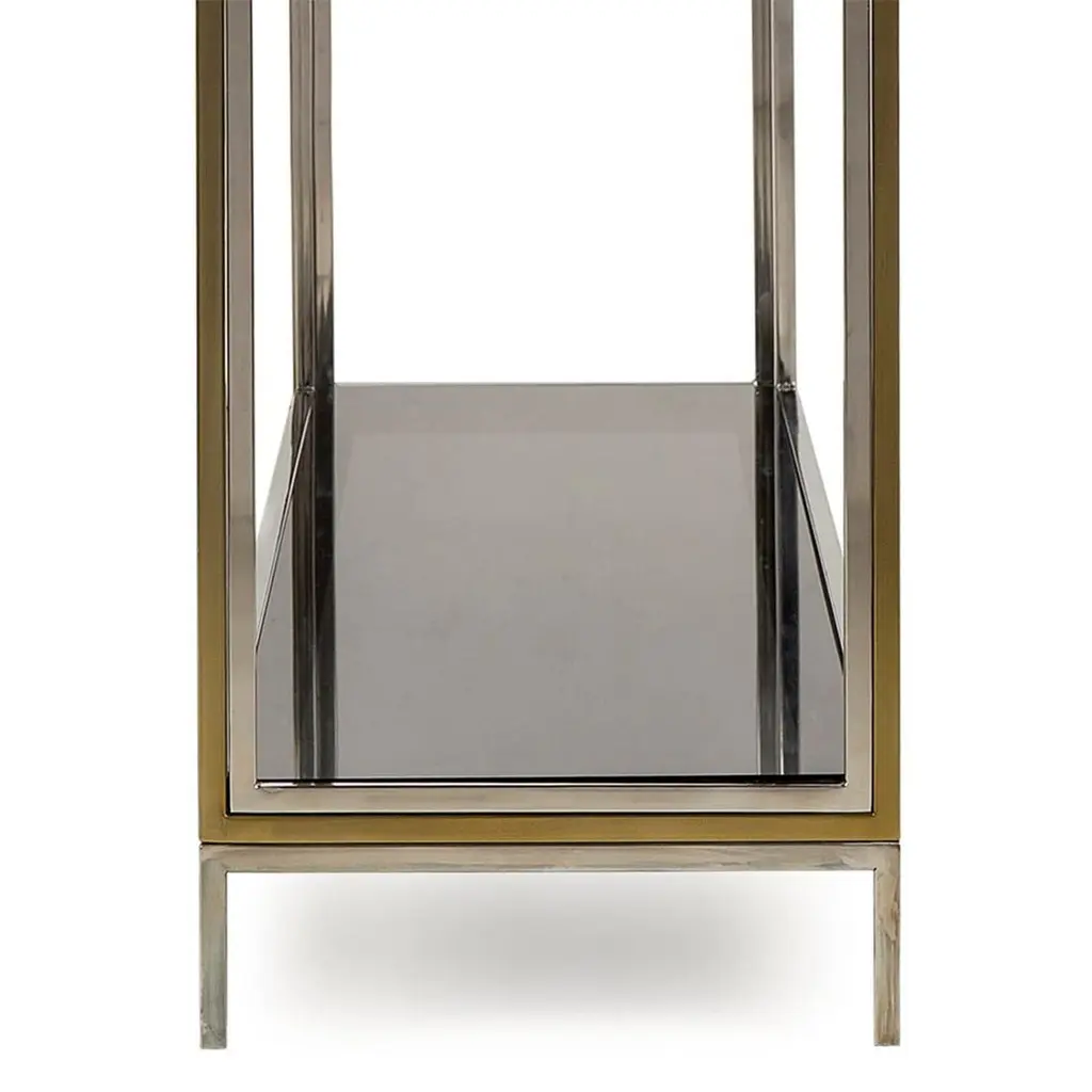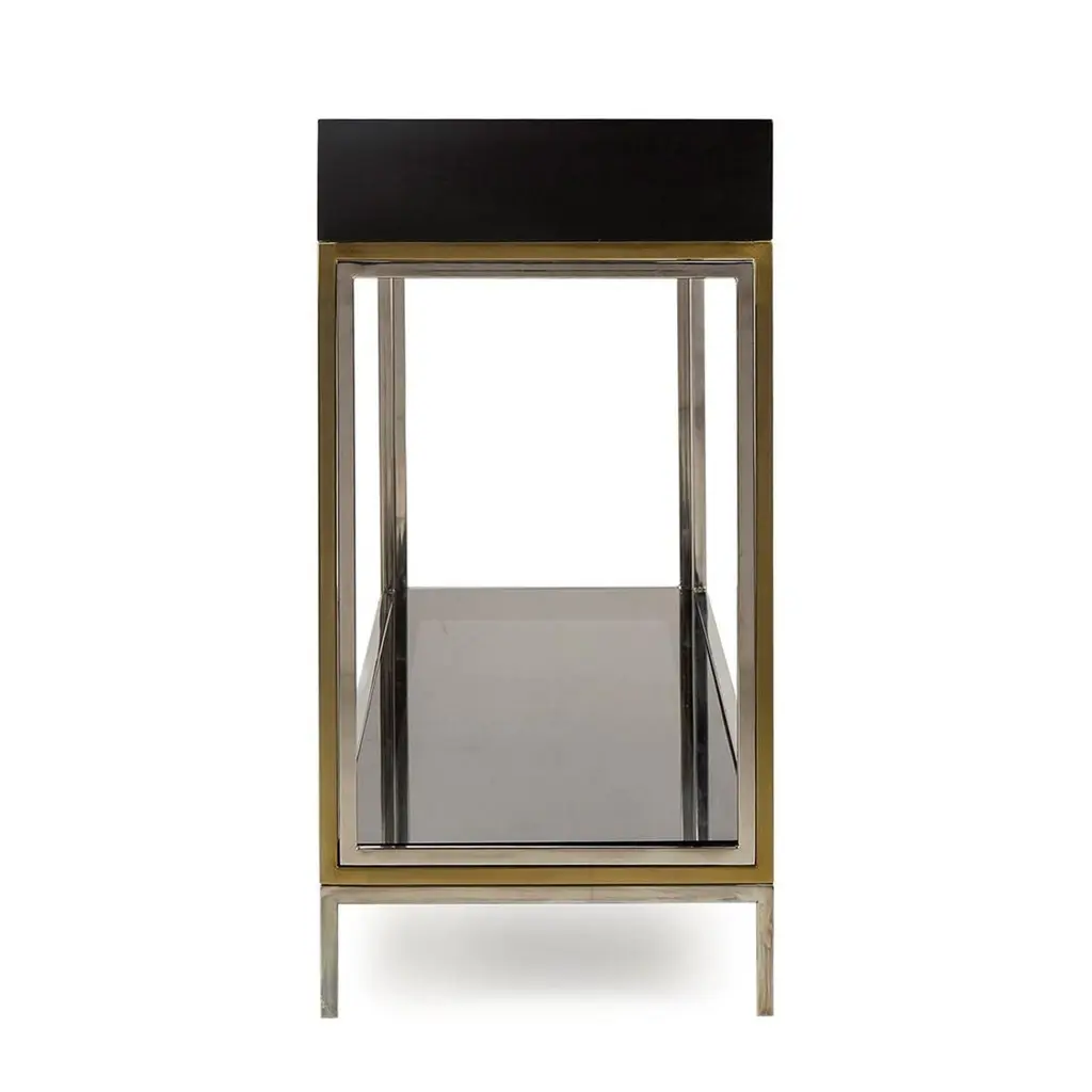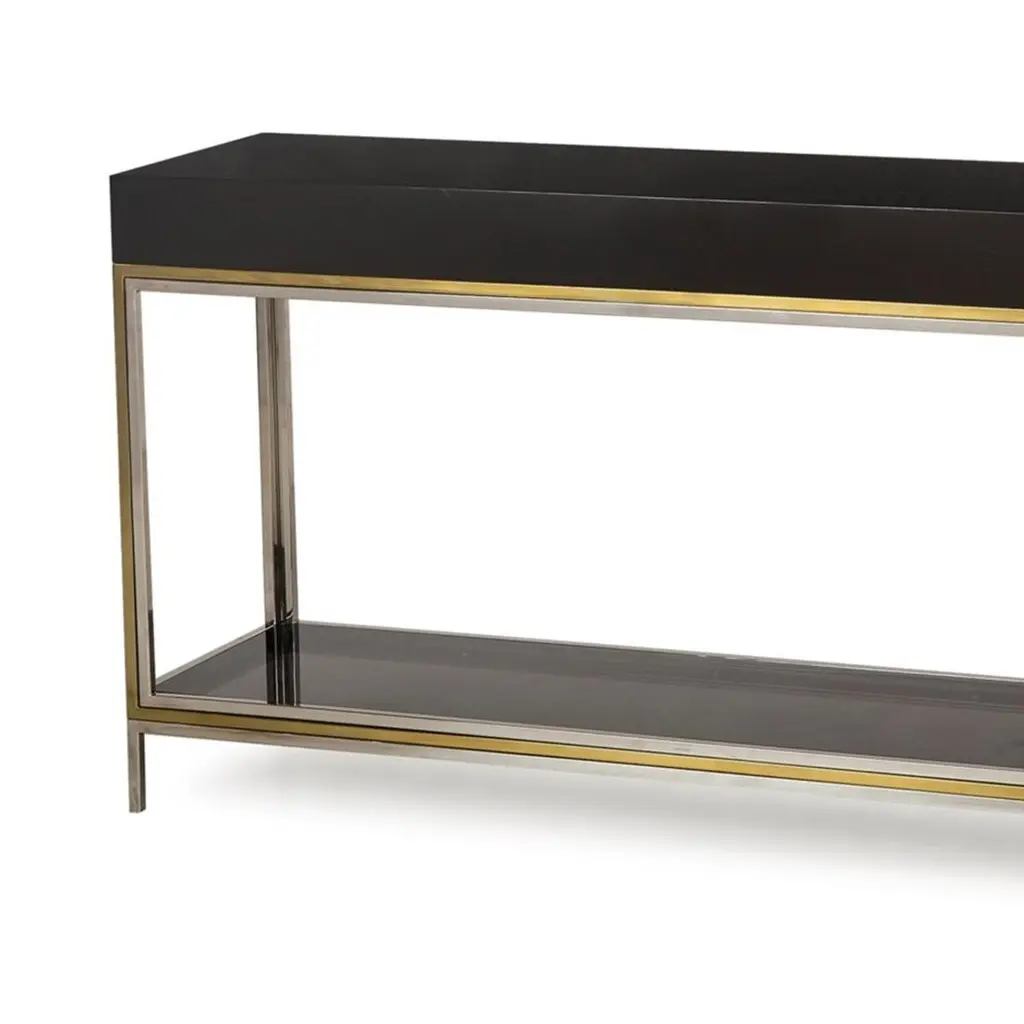 Console table lacquered black with structurein MDF black lacquered finish, with smoked glasstop and with frame in stainless steel in brass satinated finish.