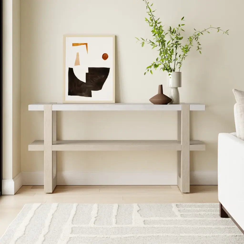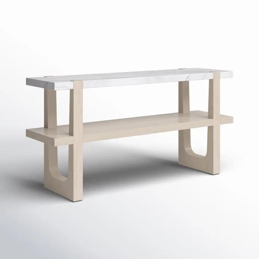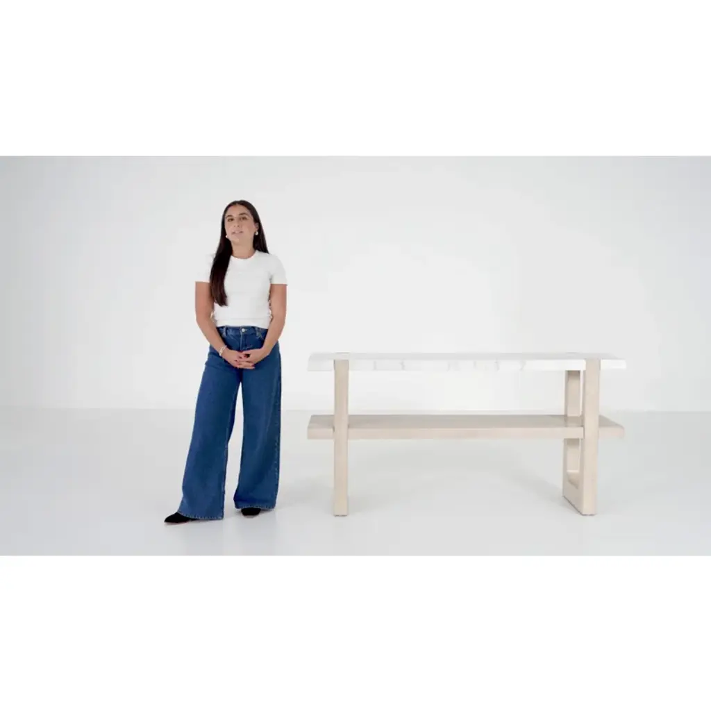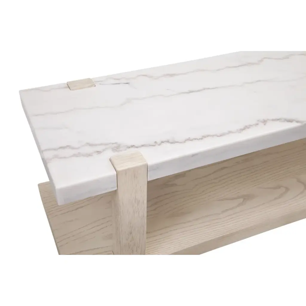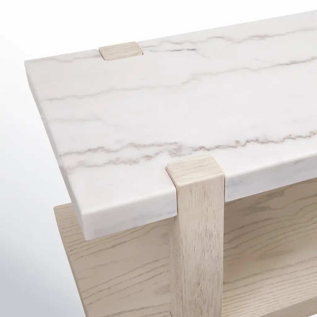 This console table combines sleek, contemporary, coastal style with bold, mixed materials. The top is made from genuine white marble with classic gray veining, while the solid ash wood base has a natural finish and a handy lower shelf. The open design is perfect for displaying small plants or books. Pair it with the matching pieces in this collection for a cohesive look in your space.