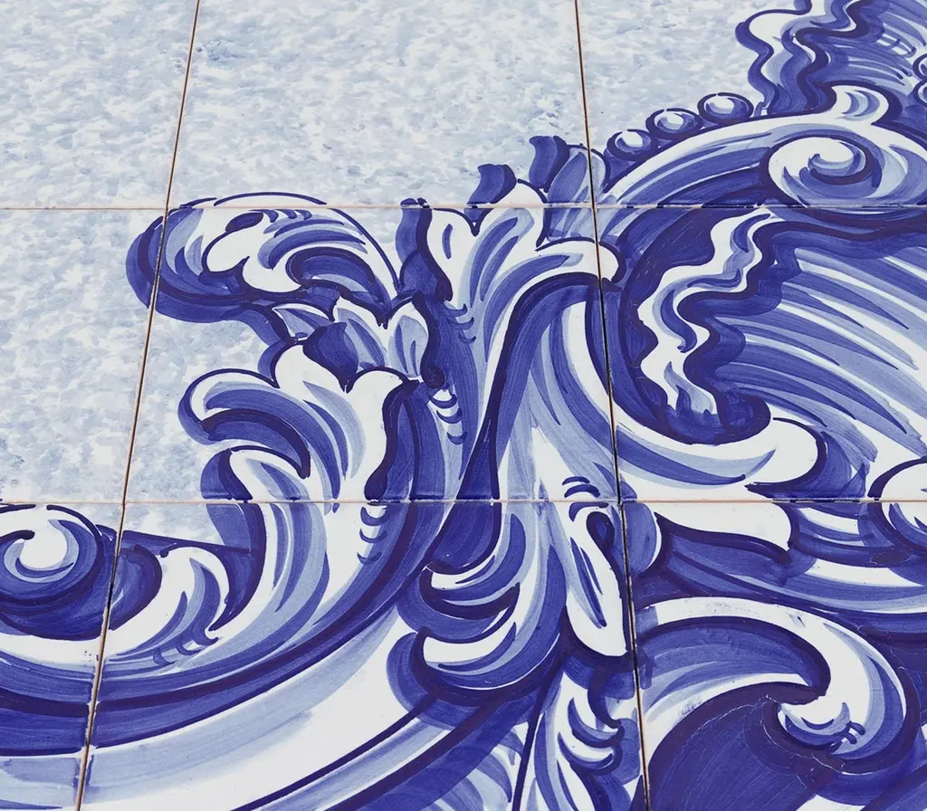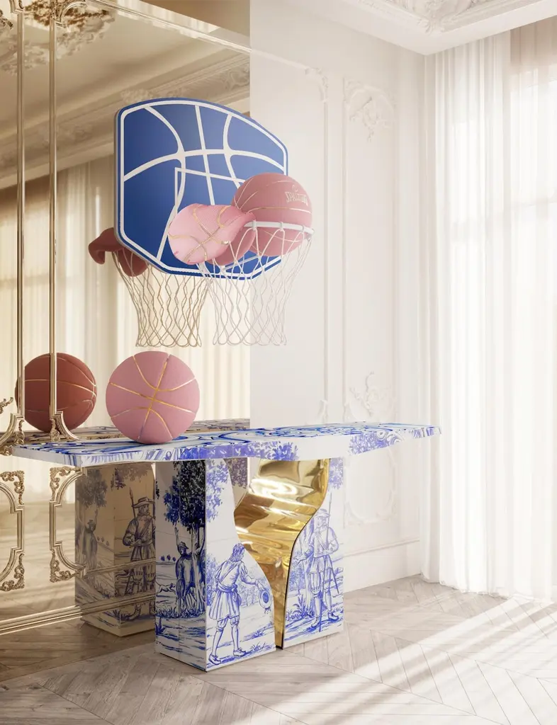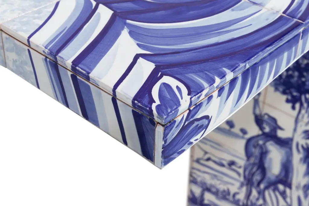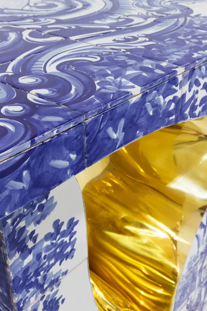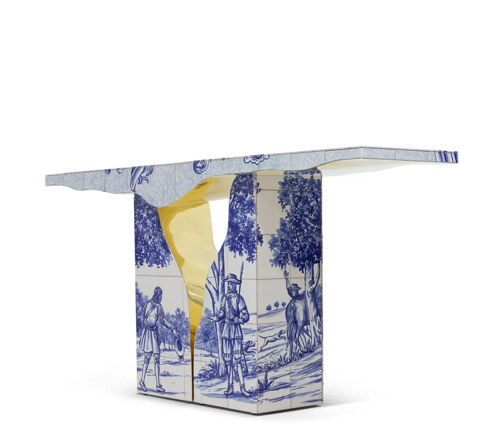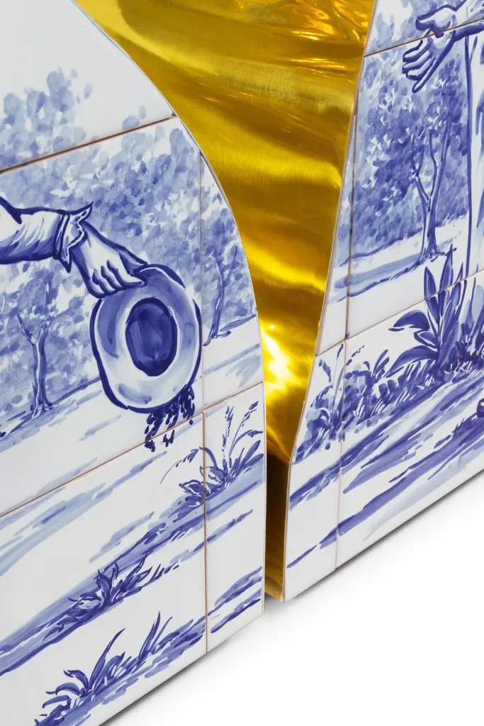 Lapiaz console takes exceptional craftsmanship and design to a new realm. This contemporary console is masterfully covered by white and blue Azulejos, the traditional hand painted tiles, one of the most representative art forms of Portuguese culture. Its organic feature is achieved through the manual fitting of the polished brass sheet, freshly cracked to show a rich golden interior. Finding beauty in the most unexpected places, this elegant console is inspired by authentic karst formations, a true masterpiece to bring a new contemporary verve into interior design