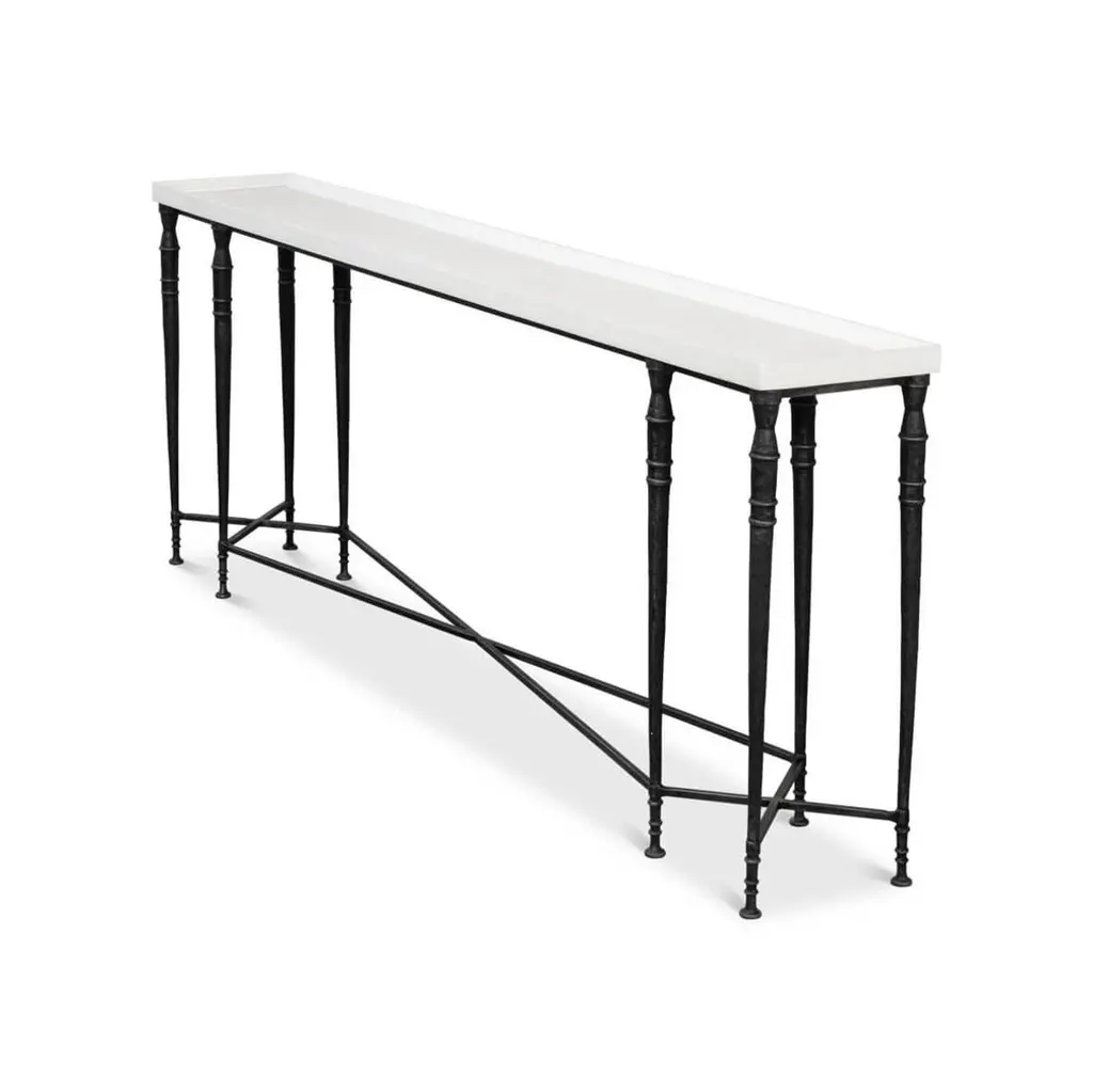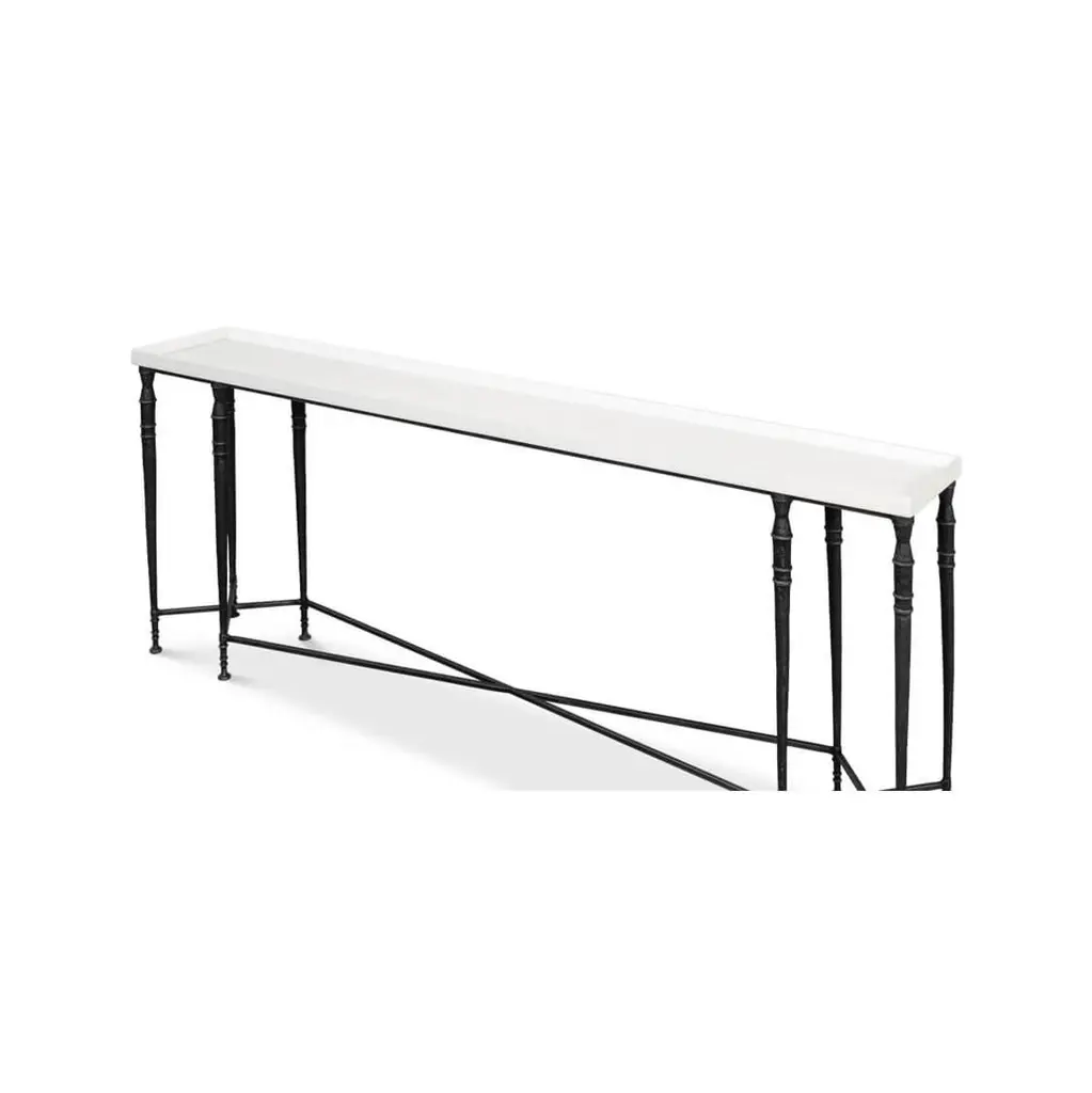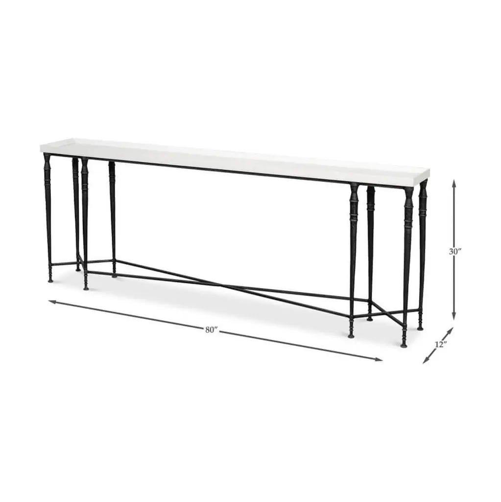 This table features a smooth, off-white wooden tabletop that sits atop a slender black iron frame. The eight iron legs boast subtle ornamental accents that hark back to traditional craftsmanship, while the overall simplicity of the design anchors it firmly in the contemporary.This piece is a versatile addition to any home, serving as a refined stage in your entryway, behind a sofa, or in a hallway. It provides a perfect balance of function and style, adding a touch of sophistication without overwhelming the space.Dimensions: 80" W x 12" D x 30" H